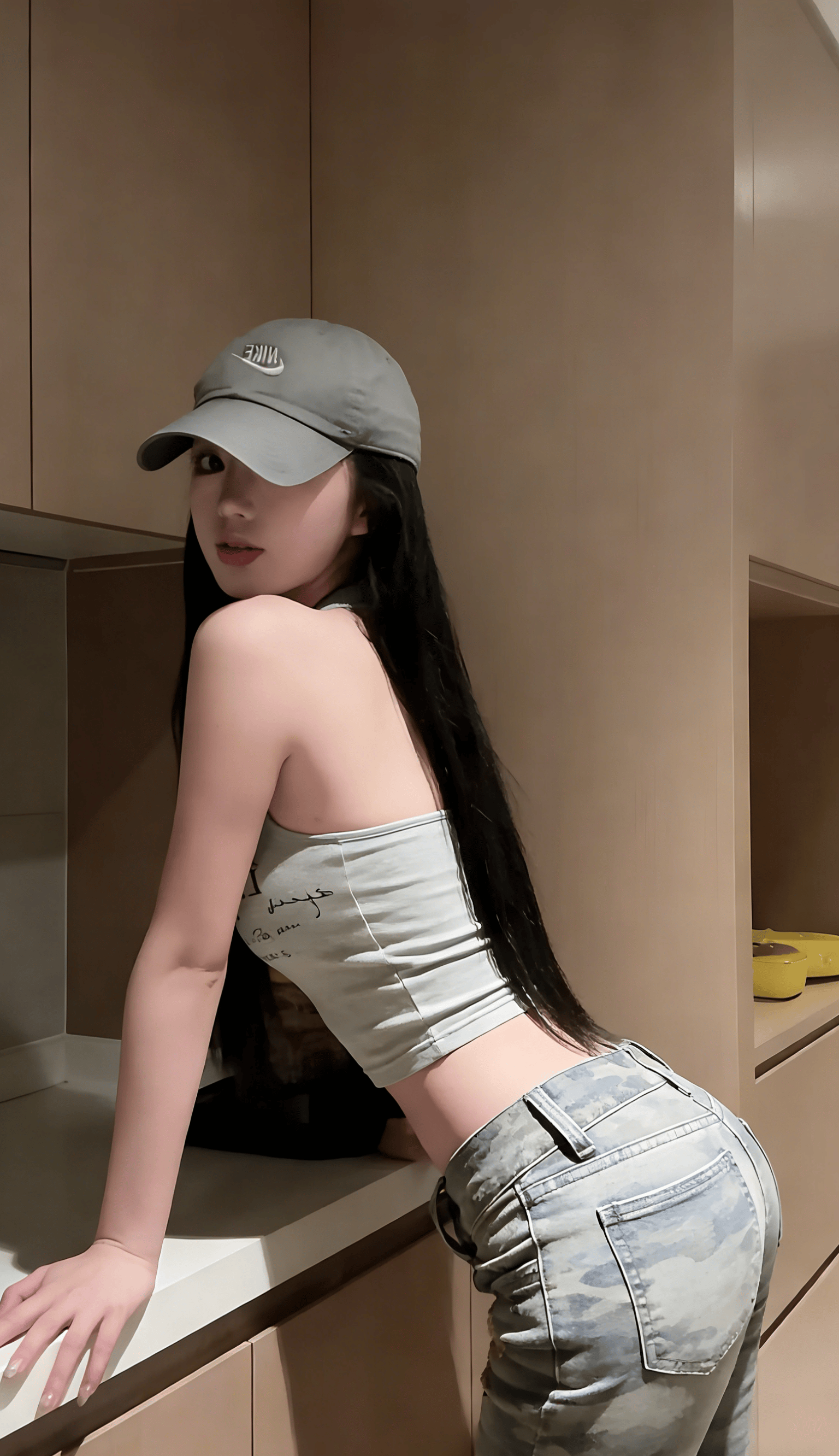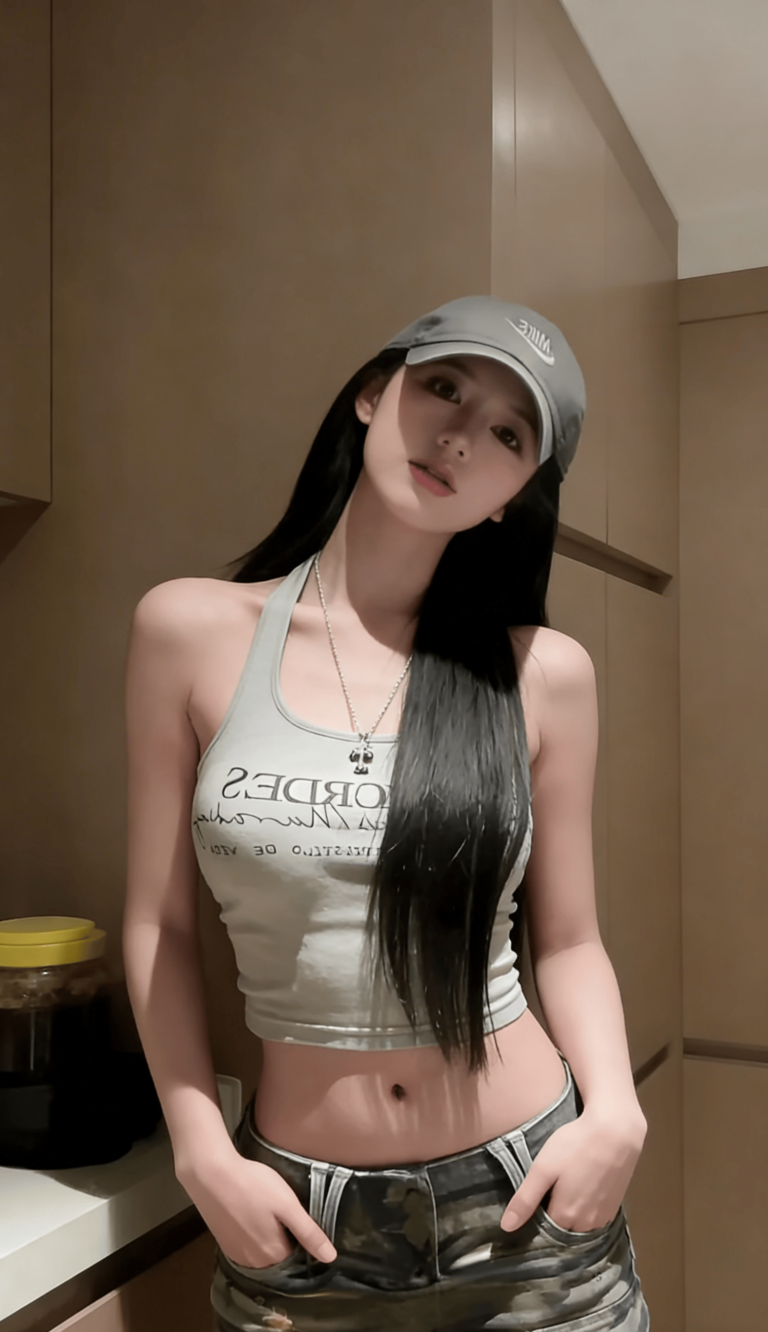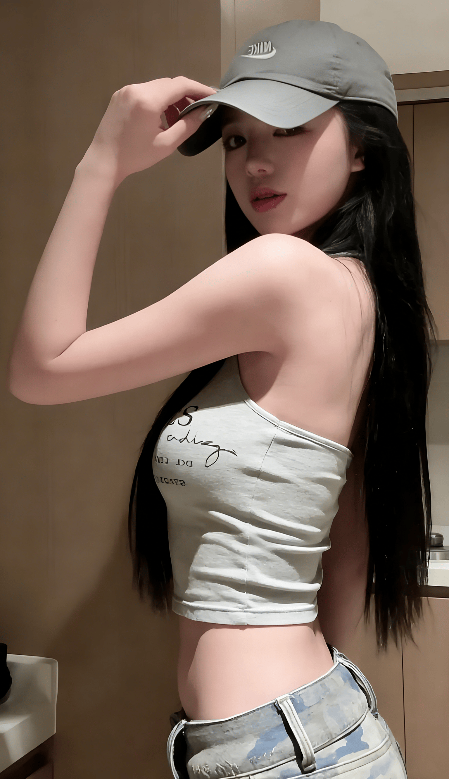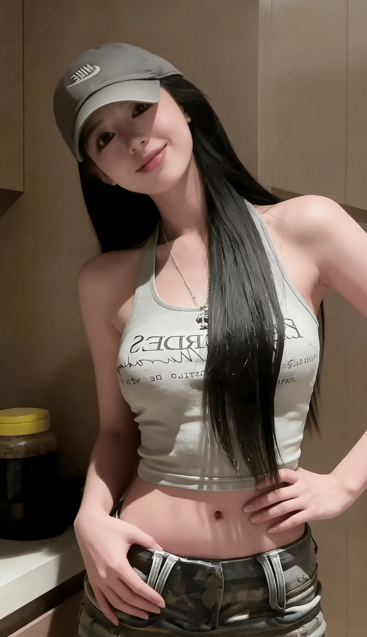 她反戴棒球帽,松垮的挂脖背心,迷彩裤腰头堆在胯骨上——这不是时尚大片,而是对“必须精致”的无声反抗。