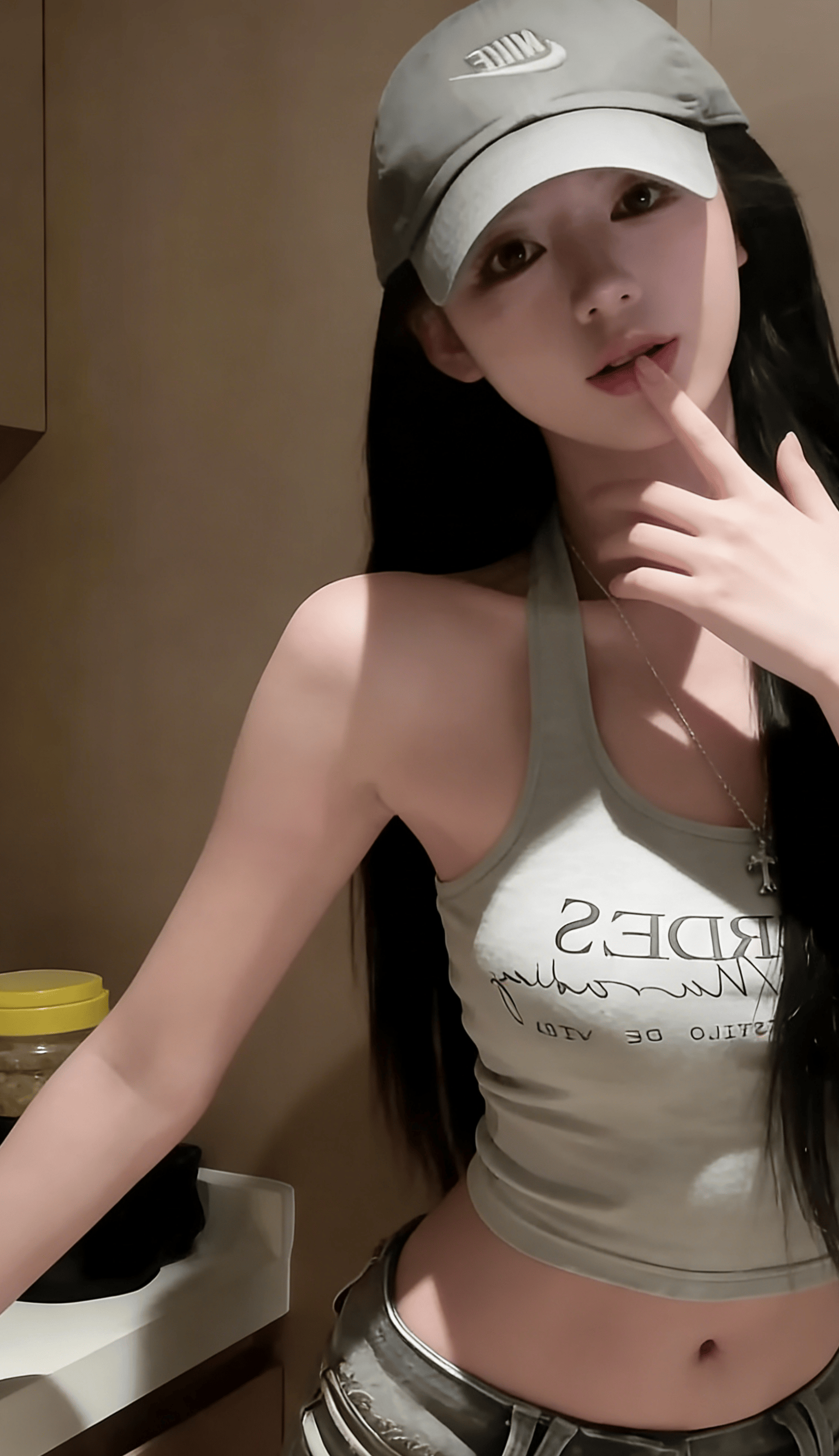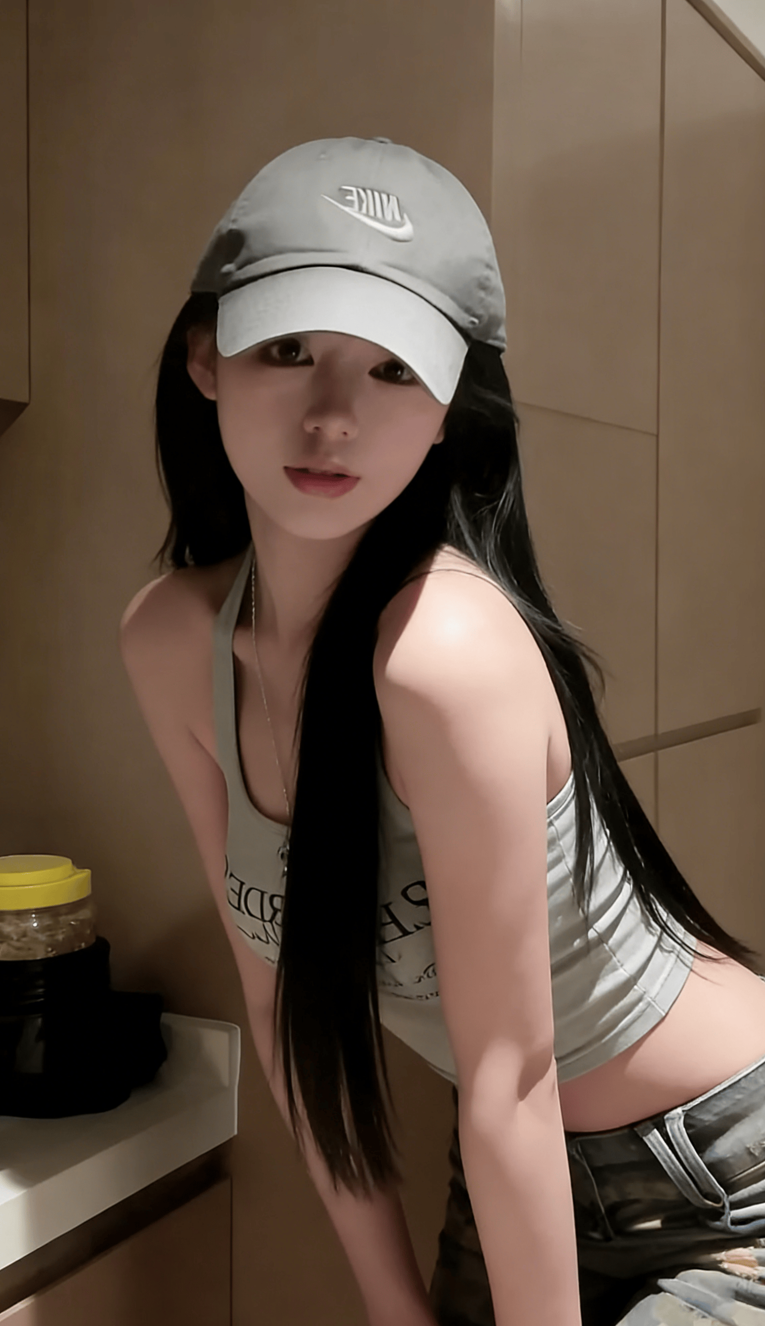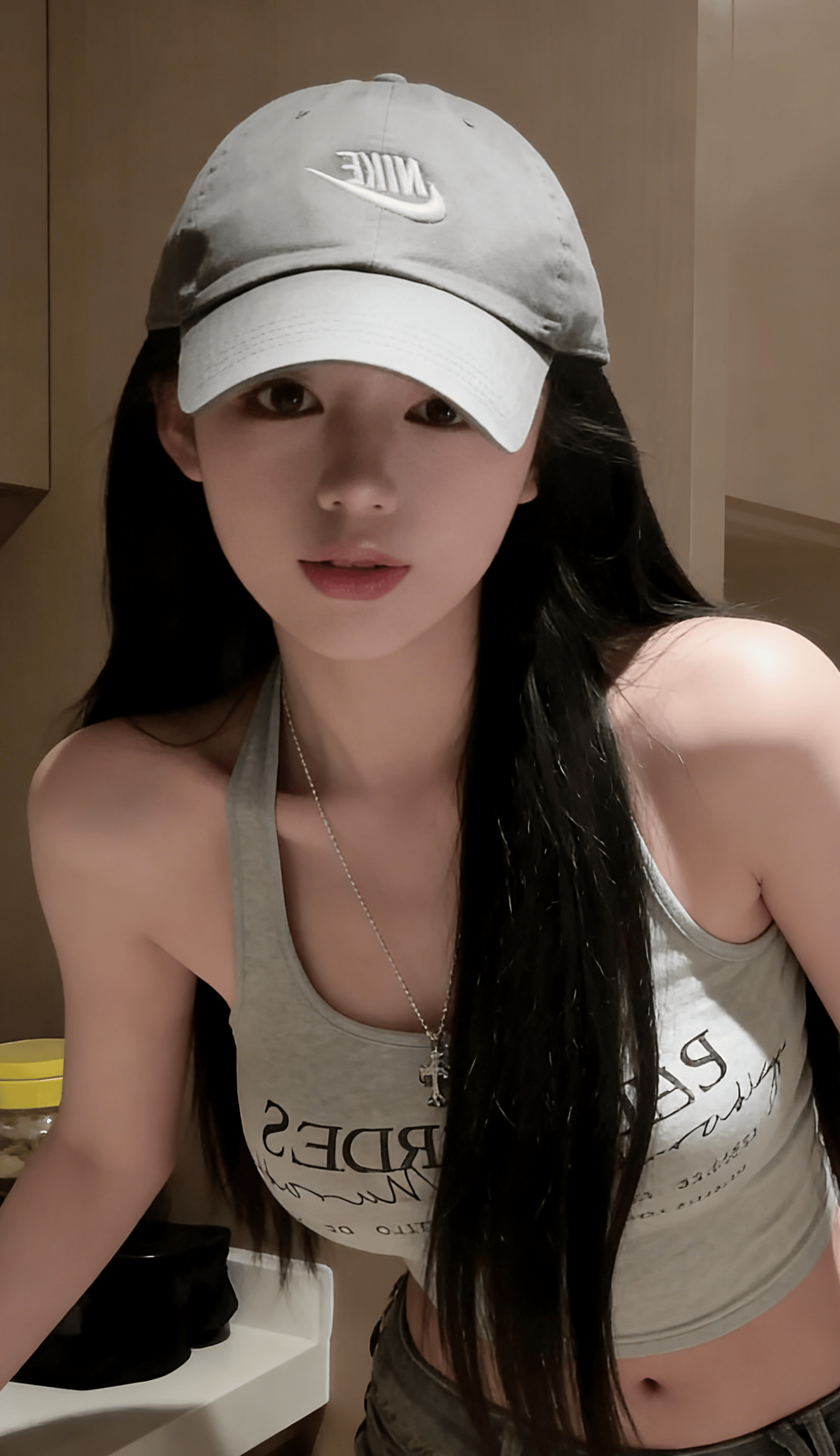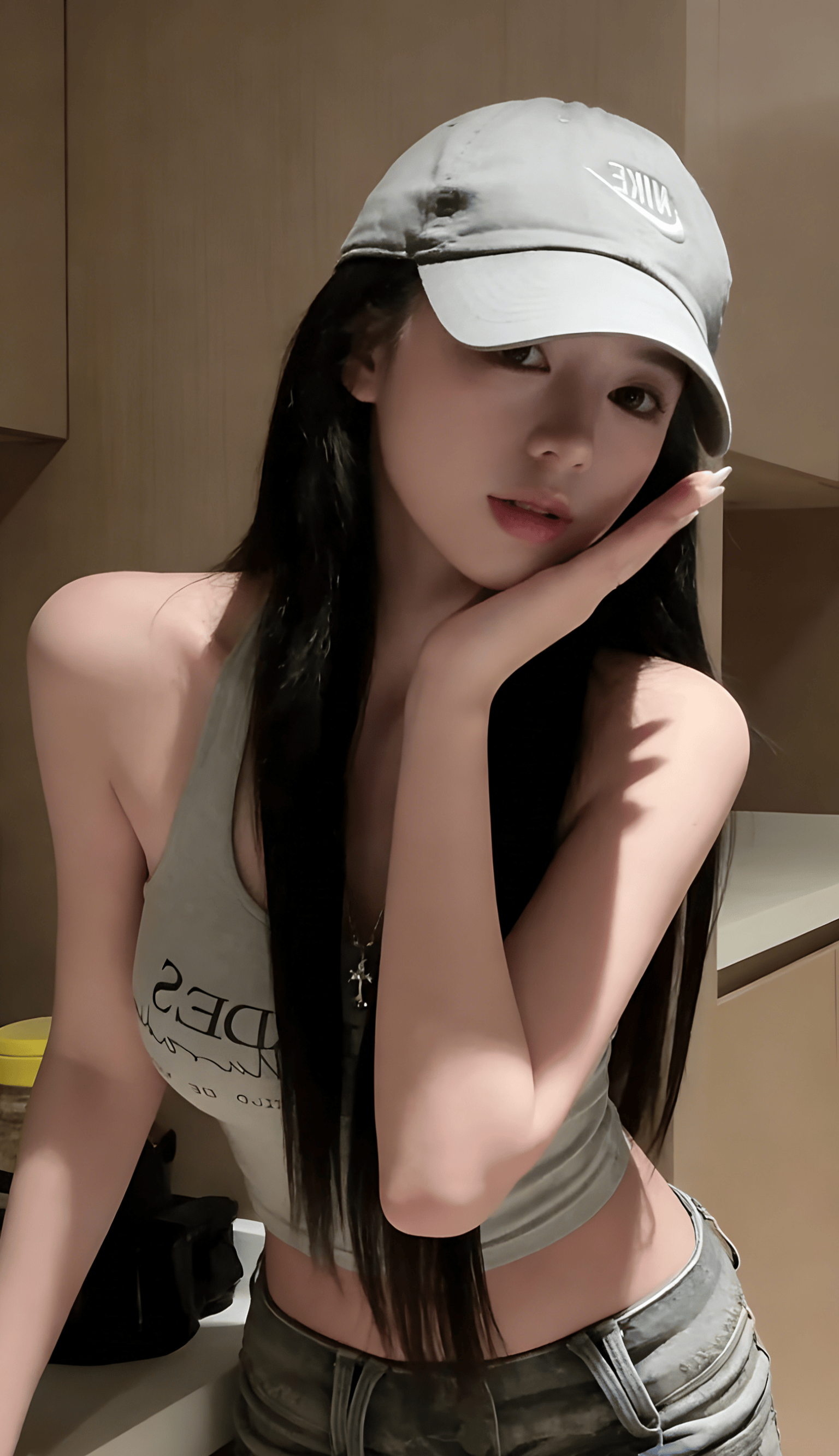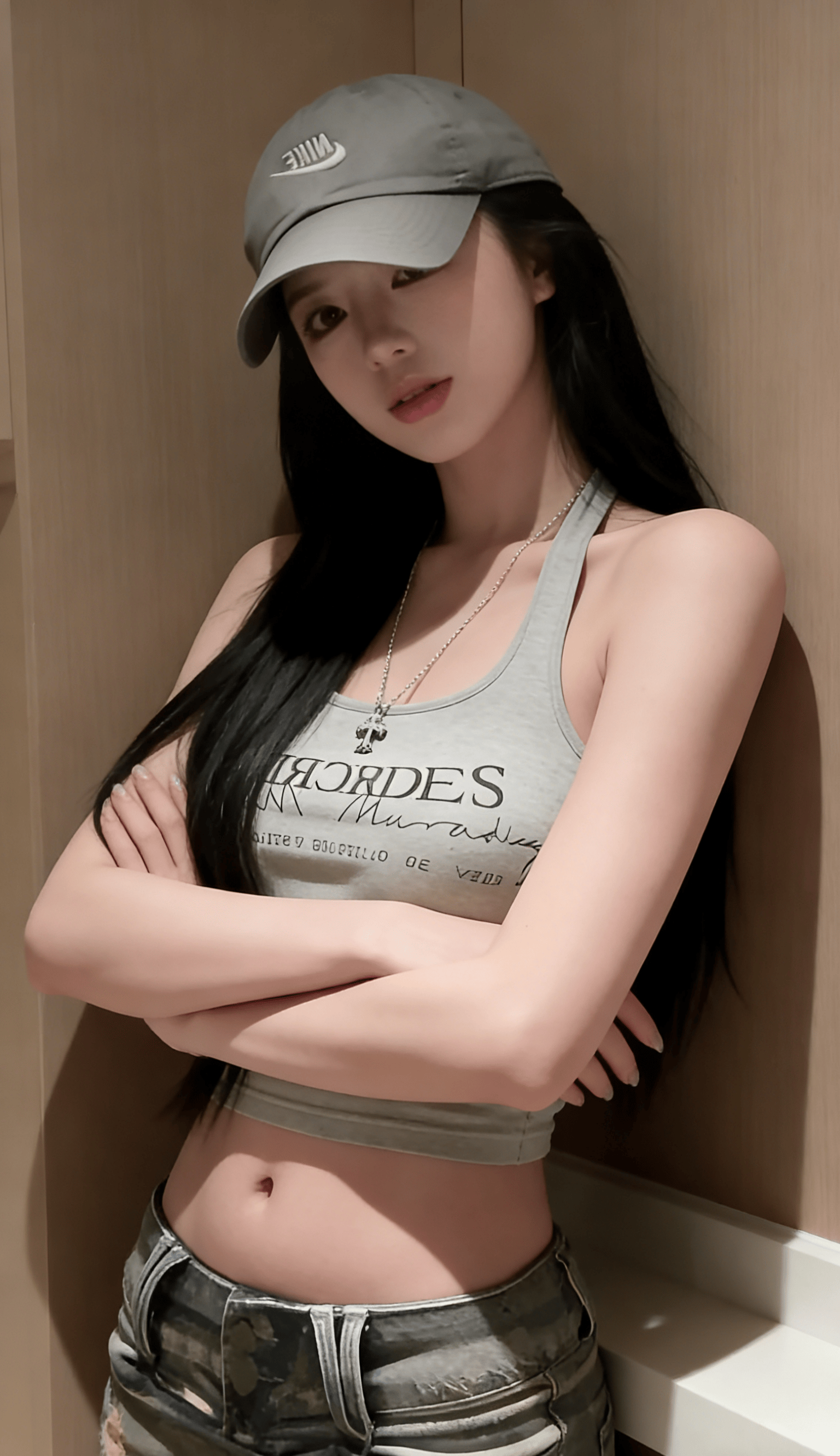 她反戴棒球帽,松垮的挂脖背心,迷彩裤腰头堆在胯骨上——这不是时尚大片,而是对“必须精致”的无声反抗。