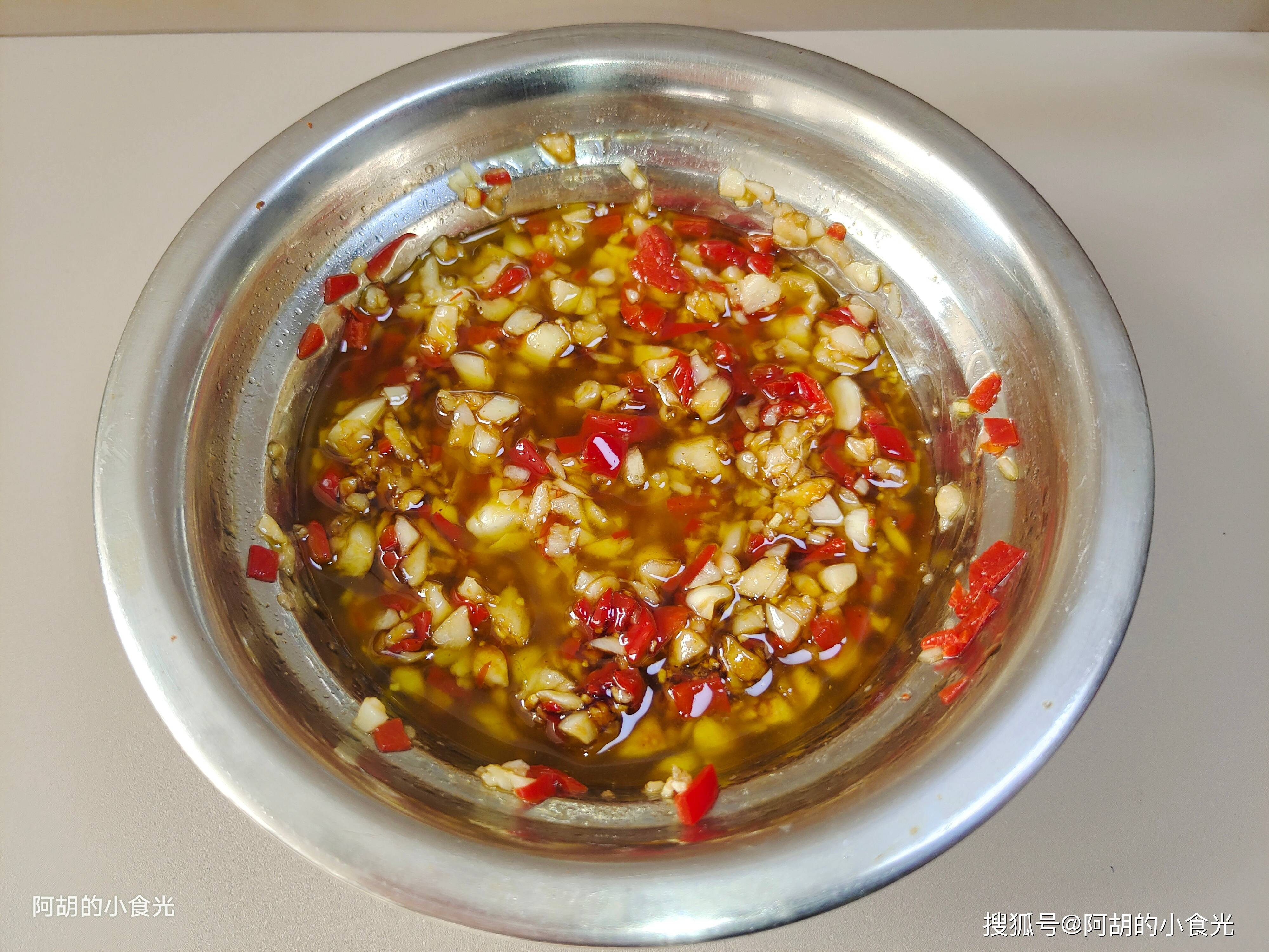 第二步:再来准备一个简单的蒜蓉酱,两头大蒜去皮后剁碎成蒜末放入碗中,再搭配一些红椒粒,喜欢辣味的可以用红小米椒碎代替,而后把菜籽油烧热至冒烟,趁热把热油倒入蒜末中激发出香味,再依次加入蚝油、生抽、少许白糖和食盐搅拌均匀即可。