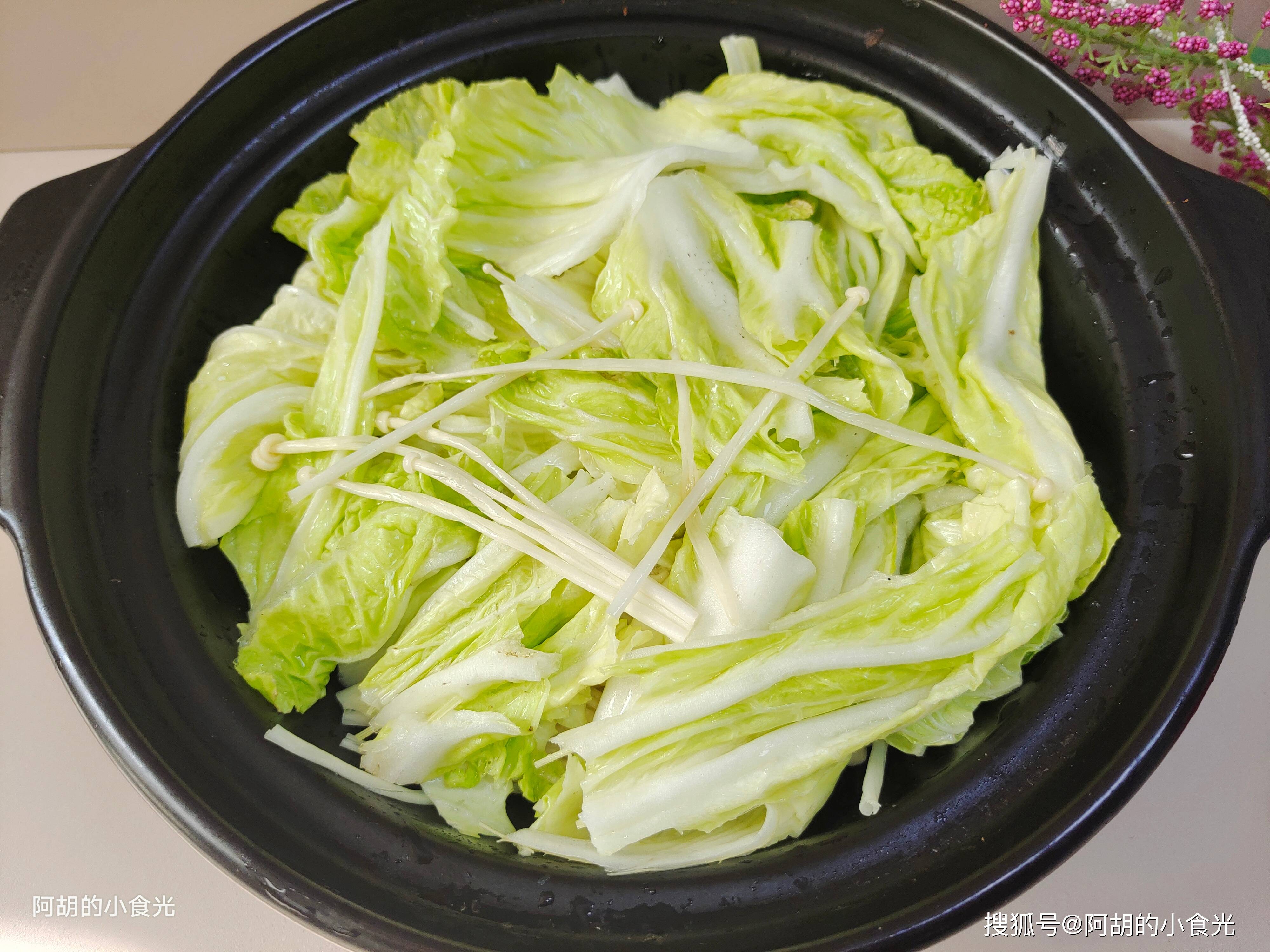 第三步:其它的配菜又金针菇一把洗净挤干水分待用,一些白菜或者娃娃菜洗净备用,喜欢的也可以再搭配一些龙口细粉,把这些配菜一块铺入砂锅中待用,注意如果有粉丝的则不要垫底哦。