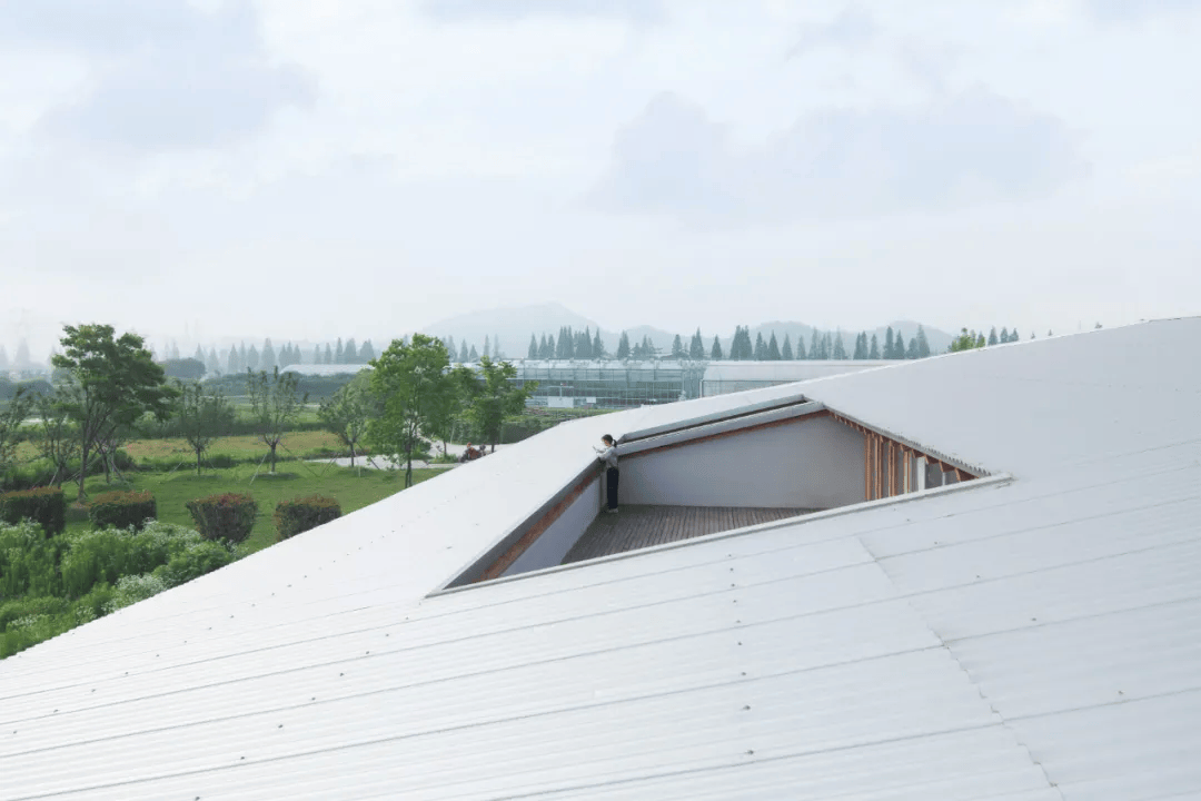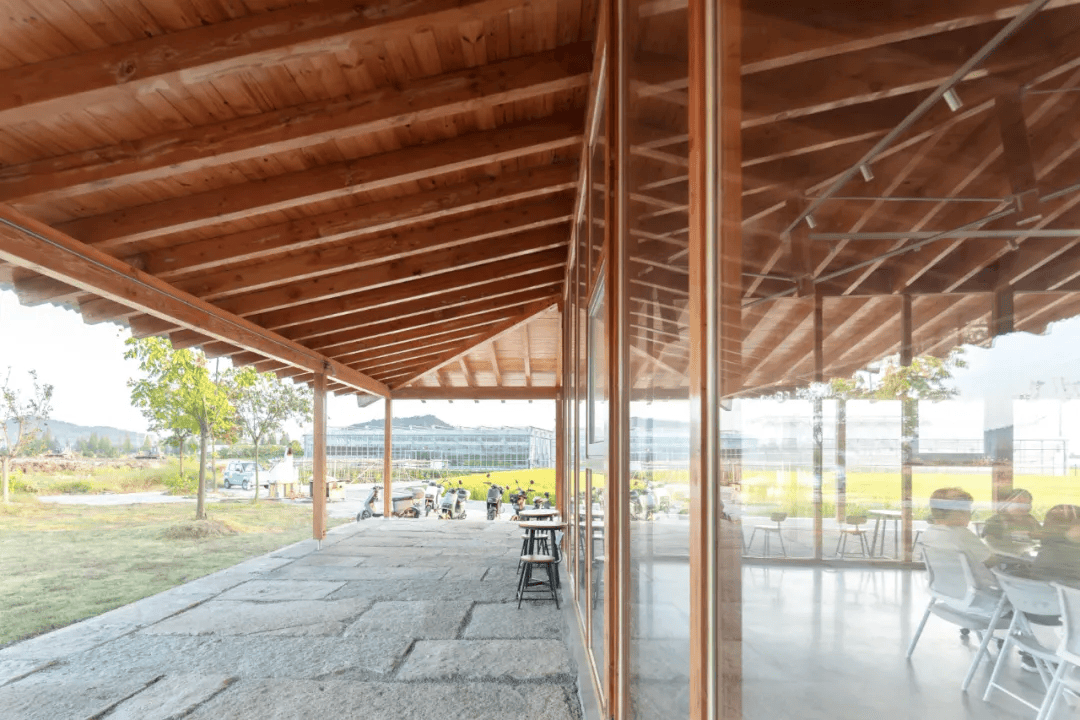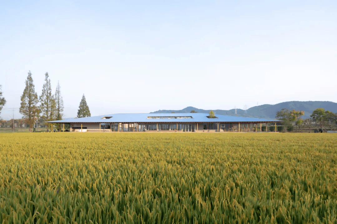 杭州数字农场运营中心位于乡村与田野交汇处,轻盈的大屋顶构筑了田野中的视觉焦点,同时为劳作者提供庇护。木结构与榫卯工艺的使用,削弱了建筑的厚重感,金属涂层屋顶减少热辐射,形成自然飘浮的意象。廊道铺设青石板,呼应乡野气息,庭院布局优化采光通风,中央天井高耸开敞,增强了空间层次,让建筑与田野相互映衬,相得益彰。