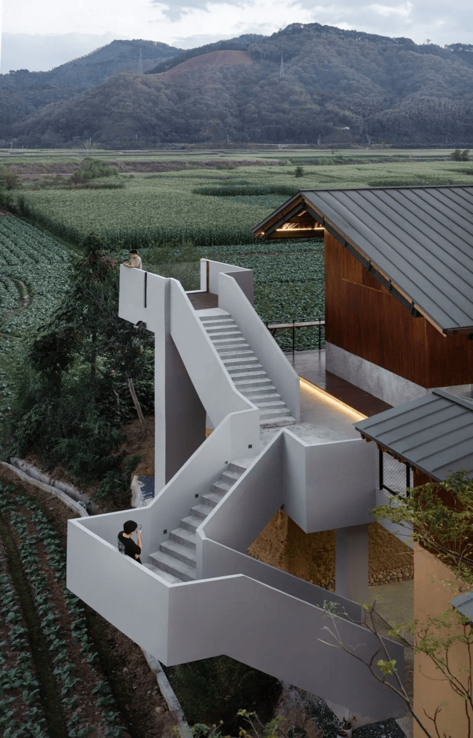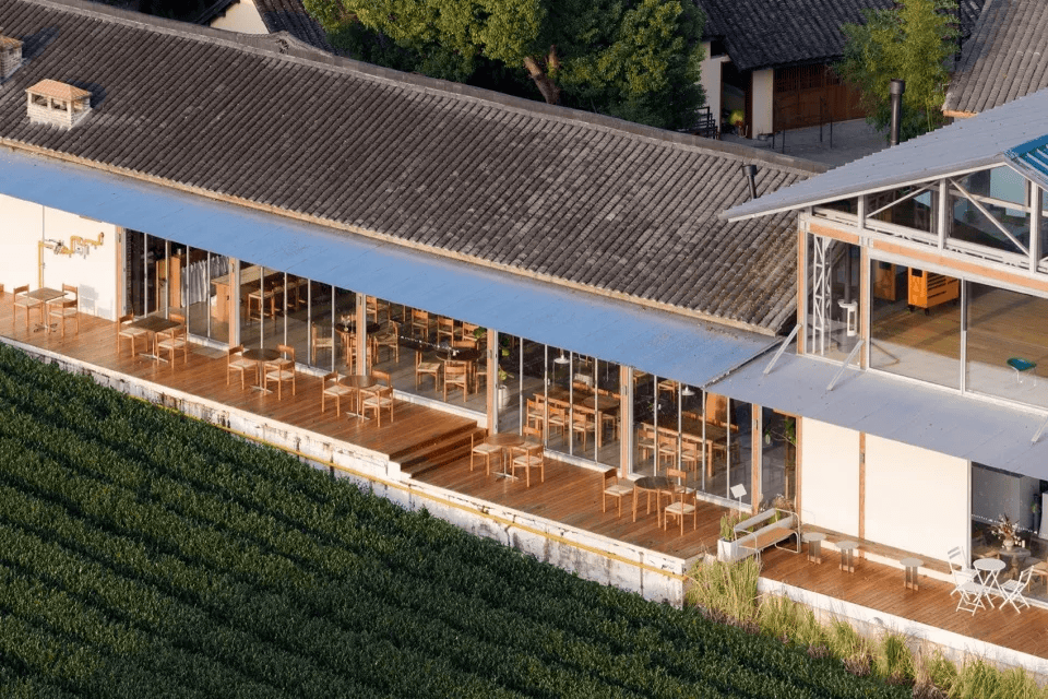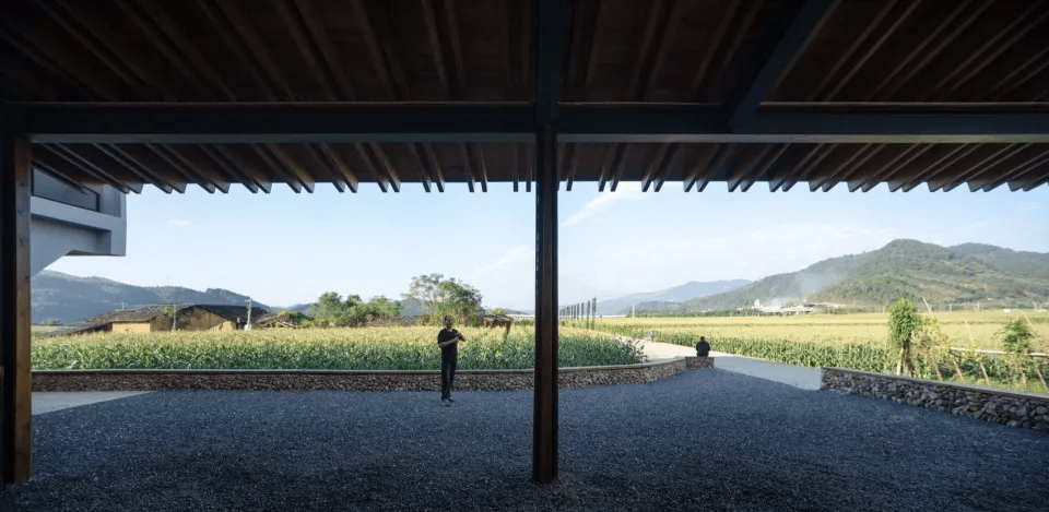 福建东游玉米驿站在万亩玉米地中崛起,保留原有夯土墙体,植入展厅、直播间、科研室与休闲平台,串联起村民劳作与生活。二层新增连廊与观景台形成开放空间,回应自然地貌。建筑在延续乡土肌理的同时,也承载了村落从传统农业向复合产业转型的愿景,成为集展示、转运、交流于一体的农业新地标,为乡村产业发展提供了支持。