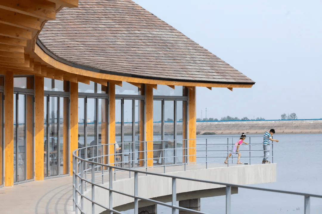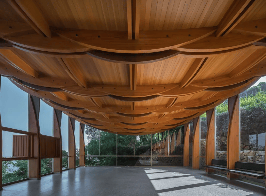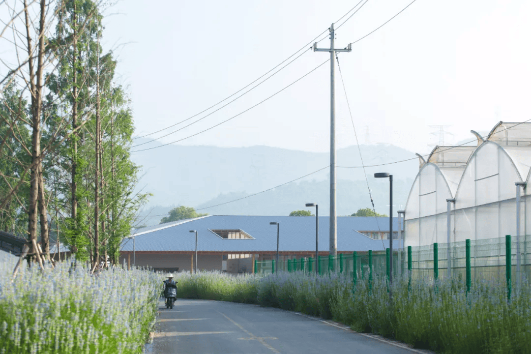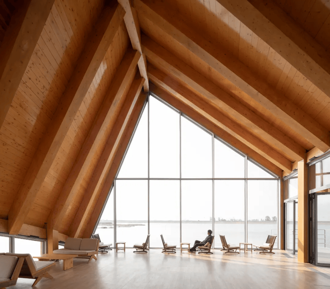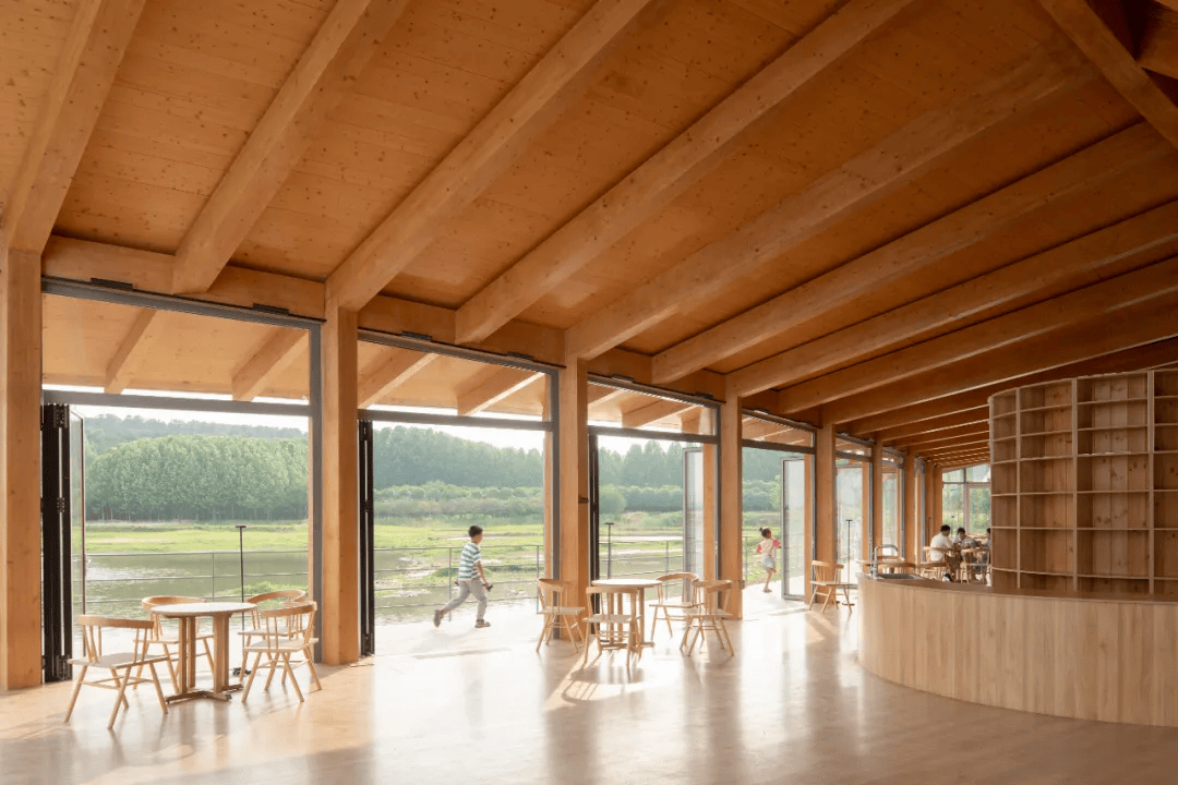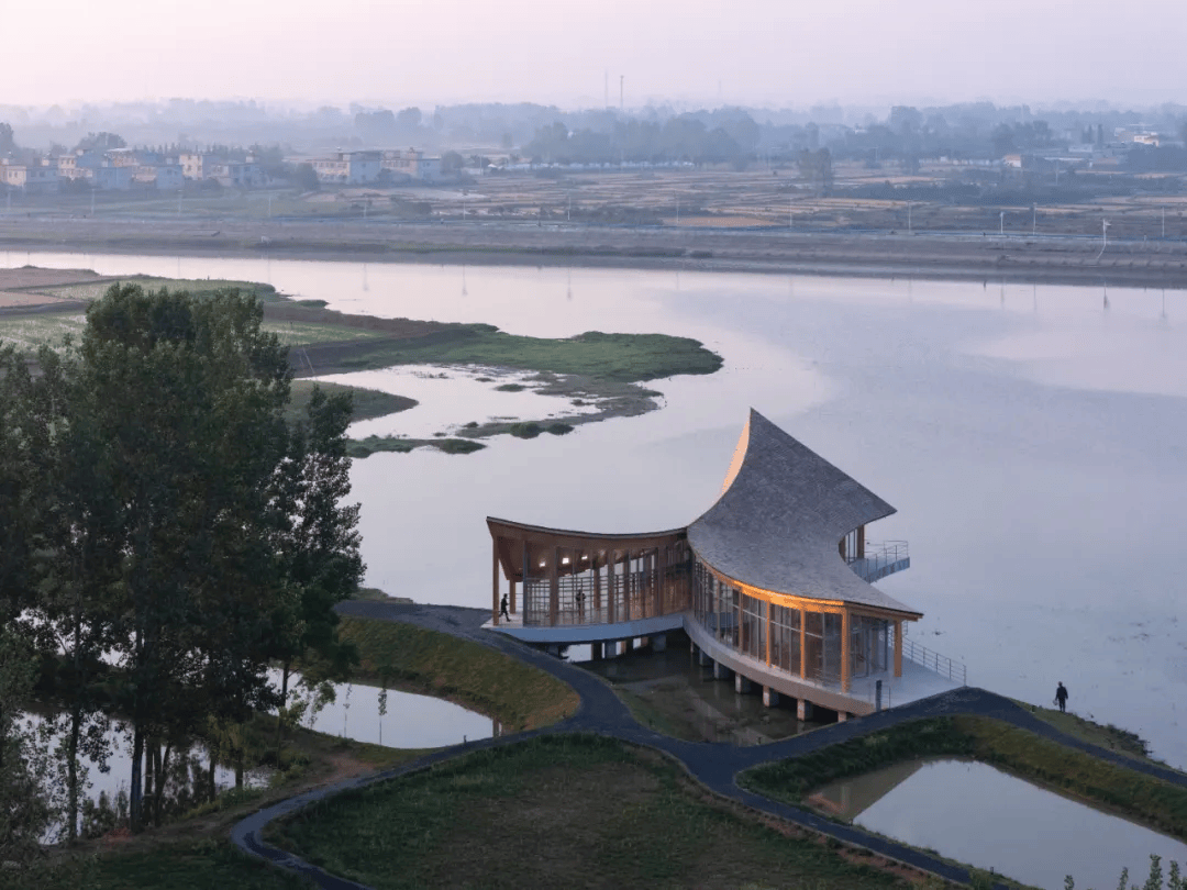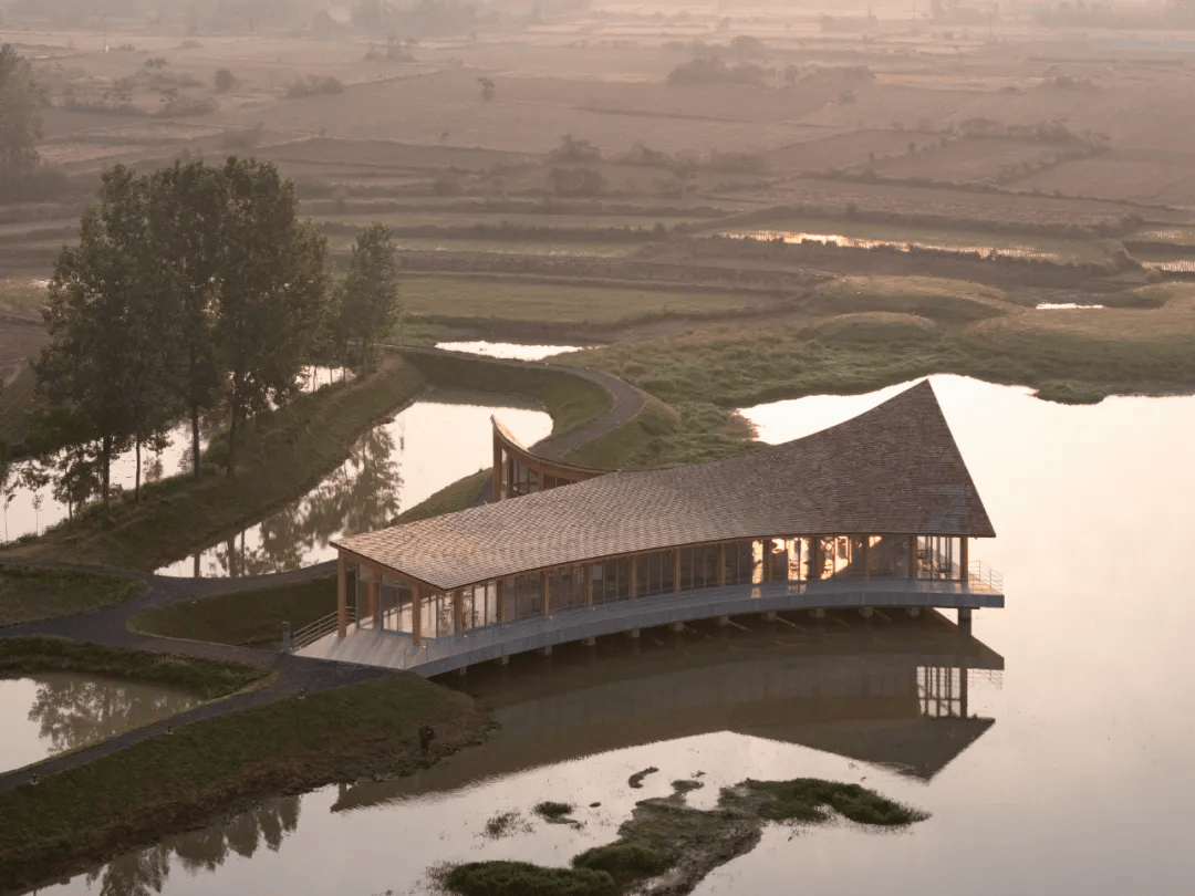 信阳浮舟纪·村民中心以木构架空方式最小干预融入生态环境,连接农耕生活与自然景观。建筑顺应堤埂肌理展开,东望稻田,西依凤凰山,南临水库,形成“三面环景”的开放格局。保留原生植物与田埂,抬升平台适应水位变化,曲线屋顶呼应地形,使建筑与自然环境融为一体,成为乡村生态环境中的有机组成部分。