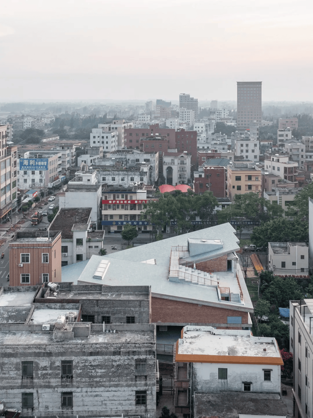 广东湛江吴阳文化站:建筑设计采用双向单坡屋顶,通过层高变化与半室外连廊串联各功能单元,形成自然通风和景观对话。屋顶活动平台、架空层广场和蜿蜒步道将室内外空间有机连接,利用当地材料如红砖和青石板,与周围环境自然融合,推动乡村文化与公共活动的活跃。