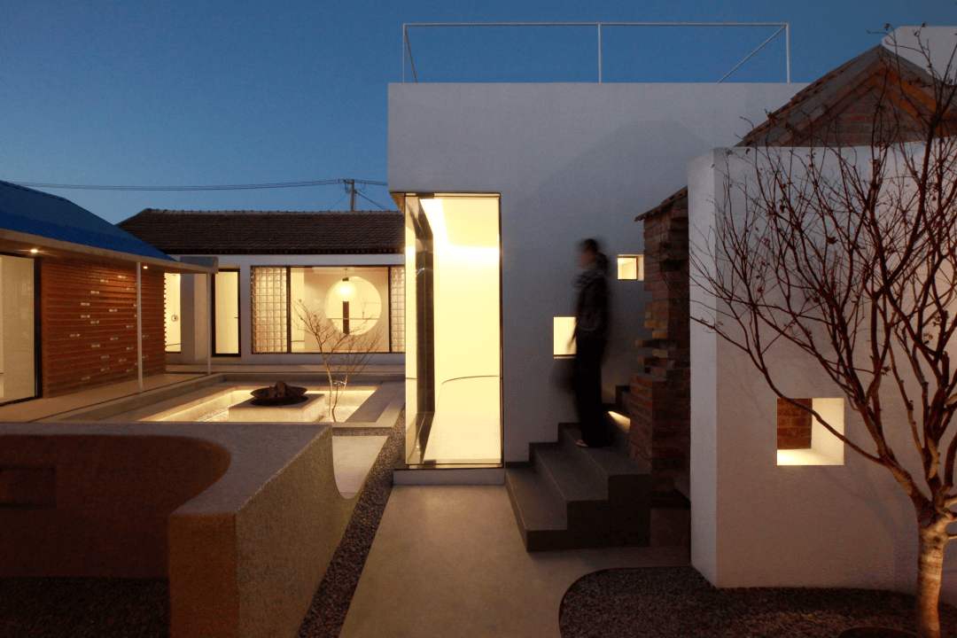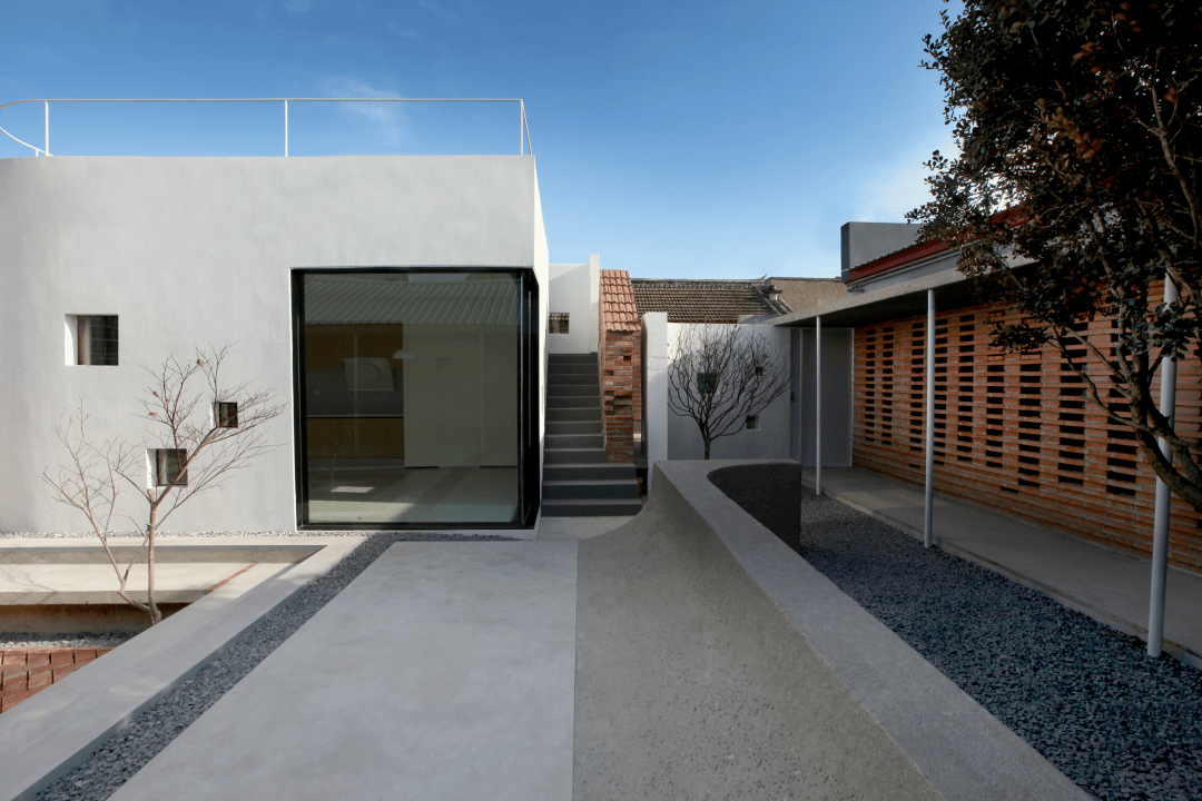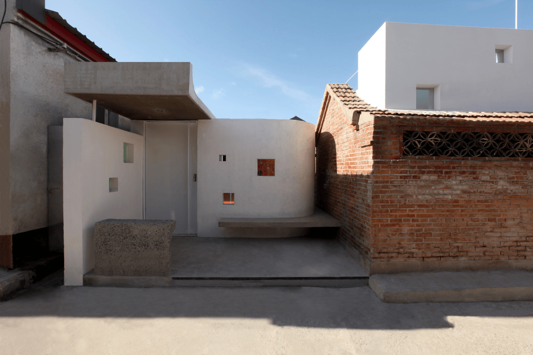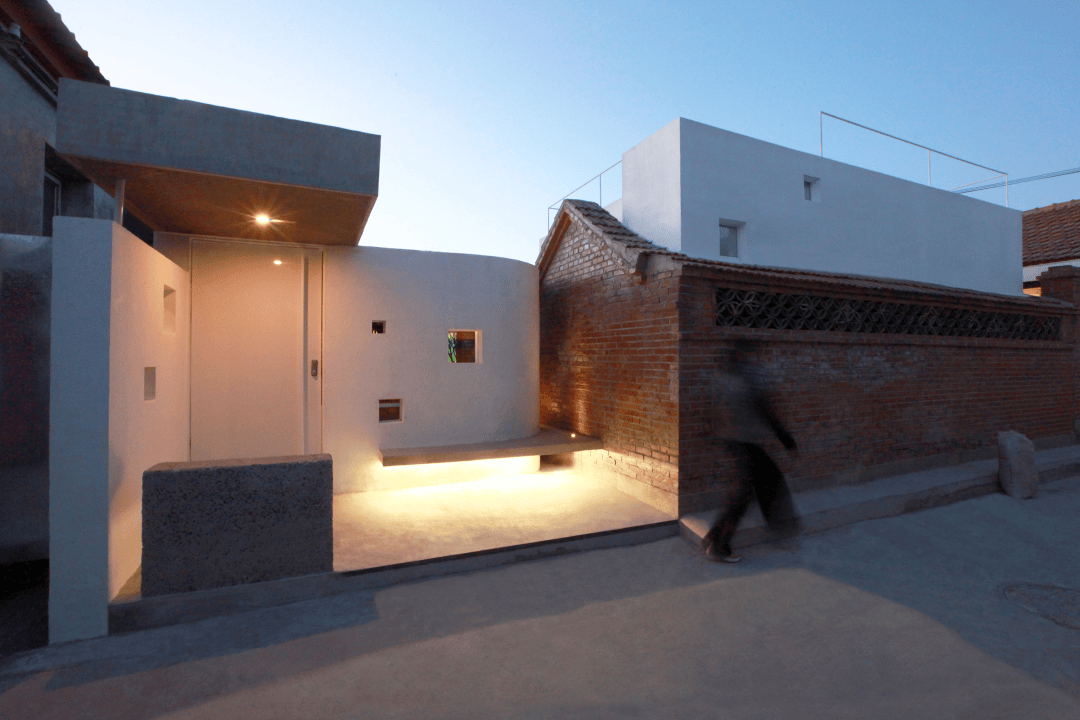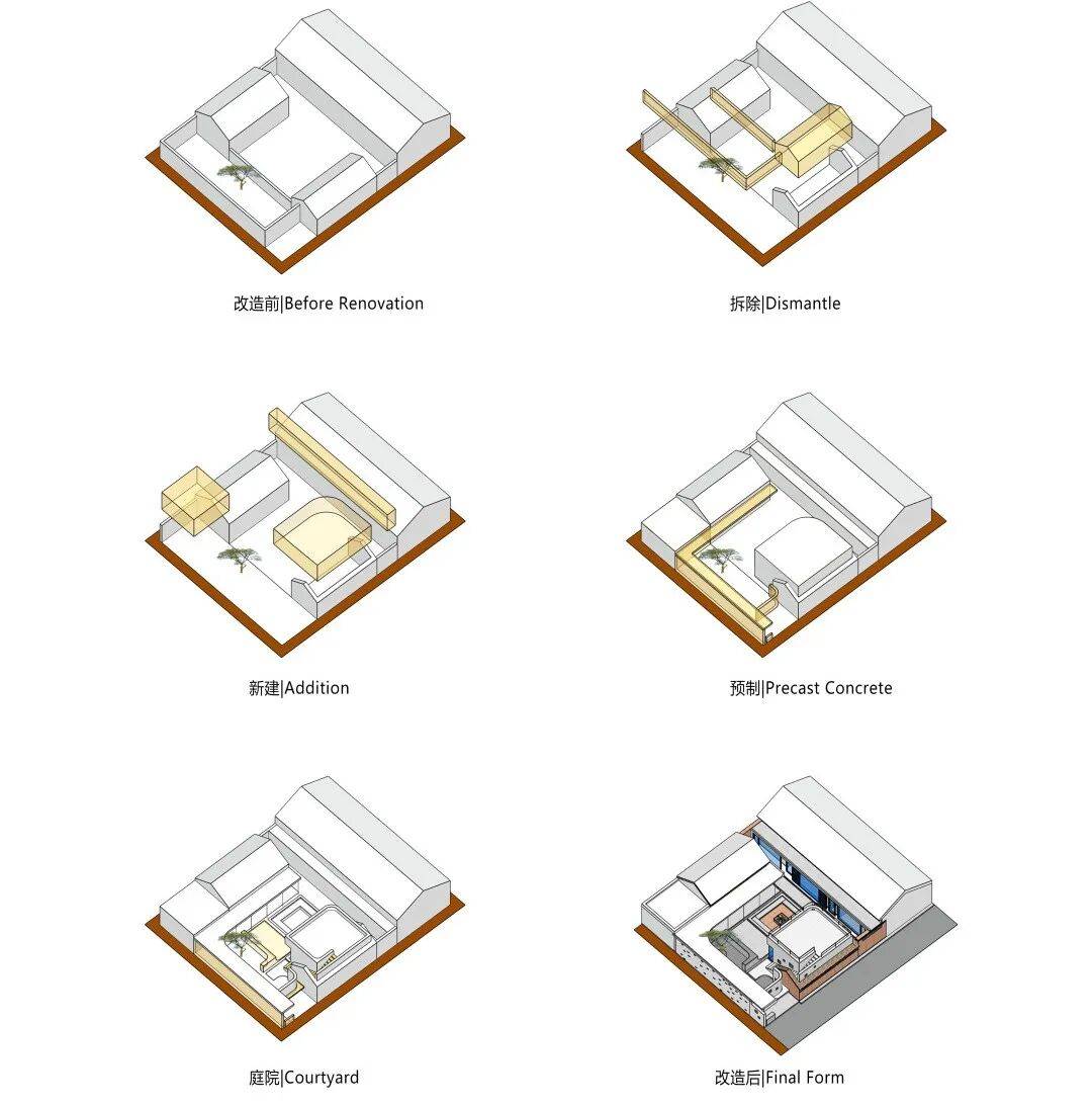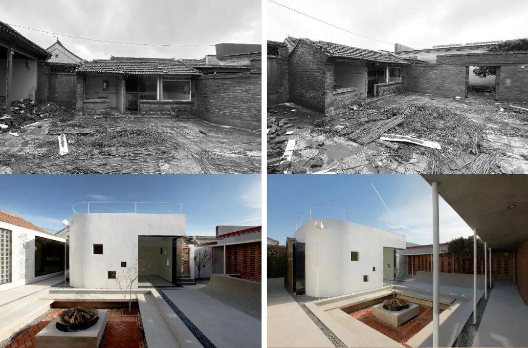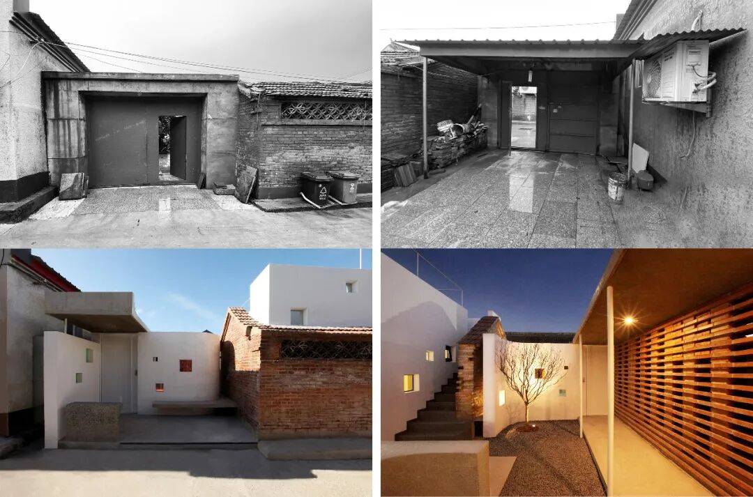 新旧共生:以老墙为界植入纯白盒体新建筑,形成鲜明且和谐的新旧对话。新建筑体量似从旧时光自然生长而出,让老院落历史底蕴焕发出新活力。例如入口改造前后对比明显,新的设计赋予其现代感又不失与老墙的协调性。