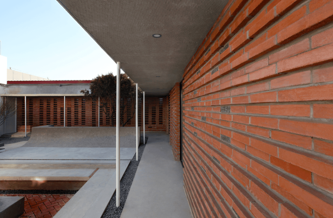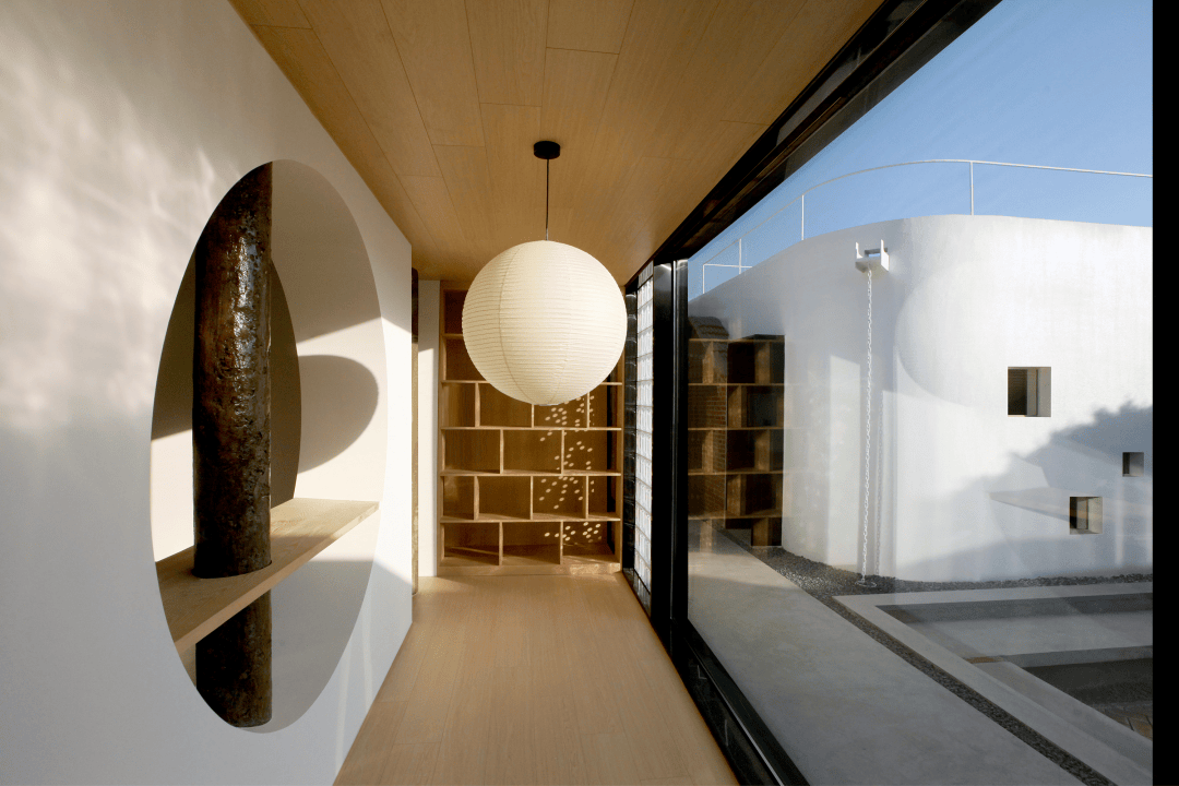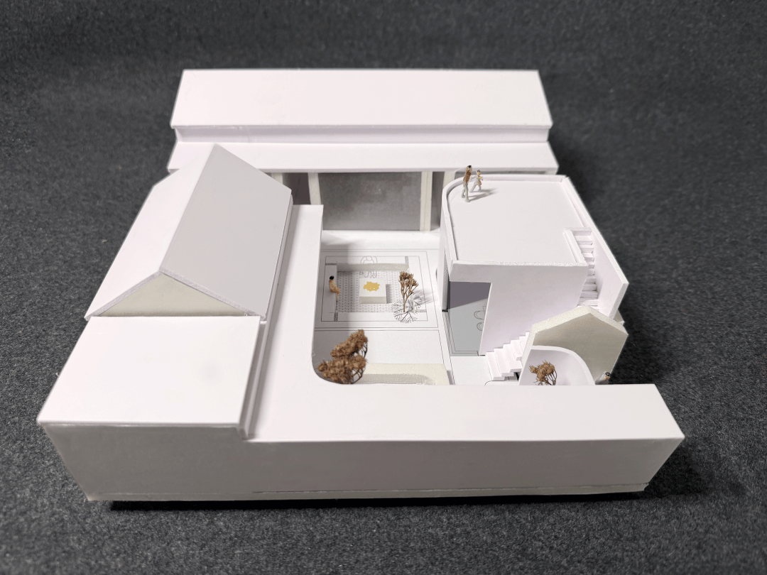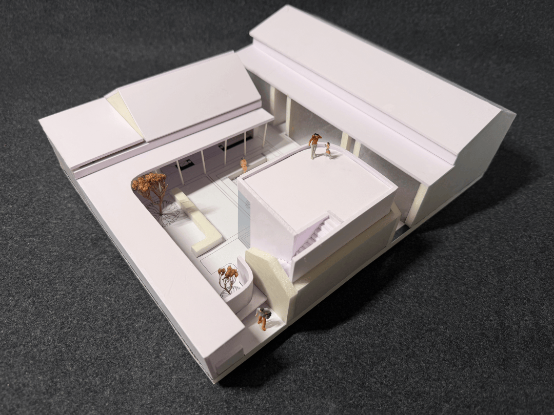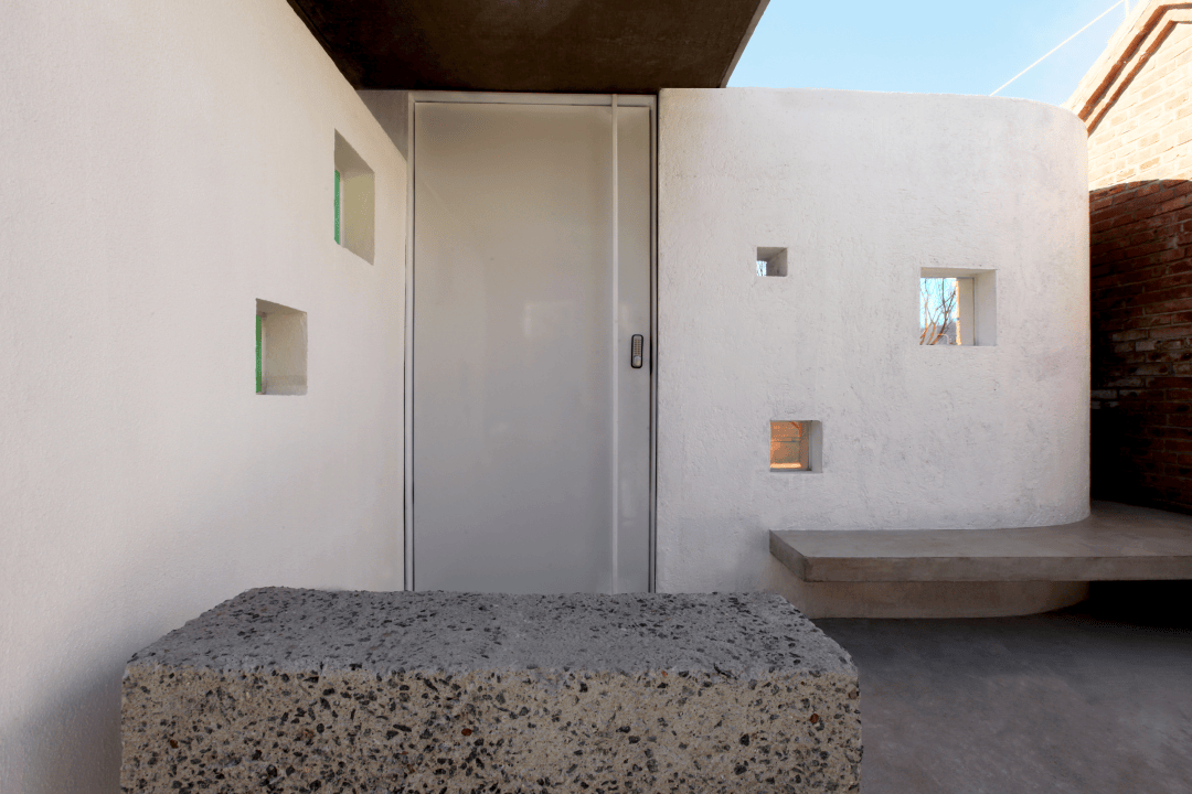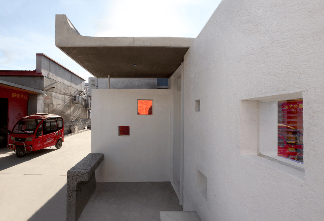 入口空间:入口立面方形开窗以“取景框”方式引入碎片化自然光线与街巷景观,增强了室内外空间的互动与视觉趣味。嵌入墙体的混凝土坐凳与弧形界面围合出停留空间,重塑了邻里互动场景,为村民提供了驻足 交流场所,将传统“街头巷尾”公共交往场景植入现代建筑。