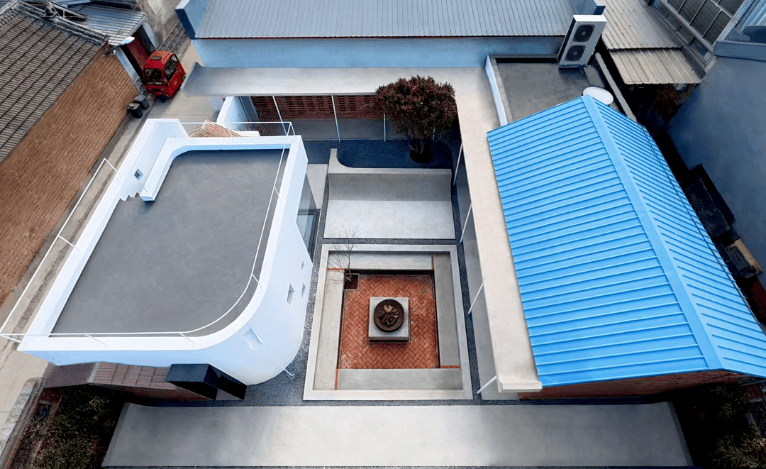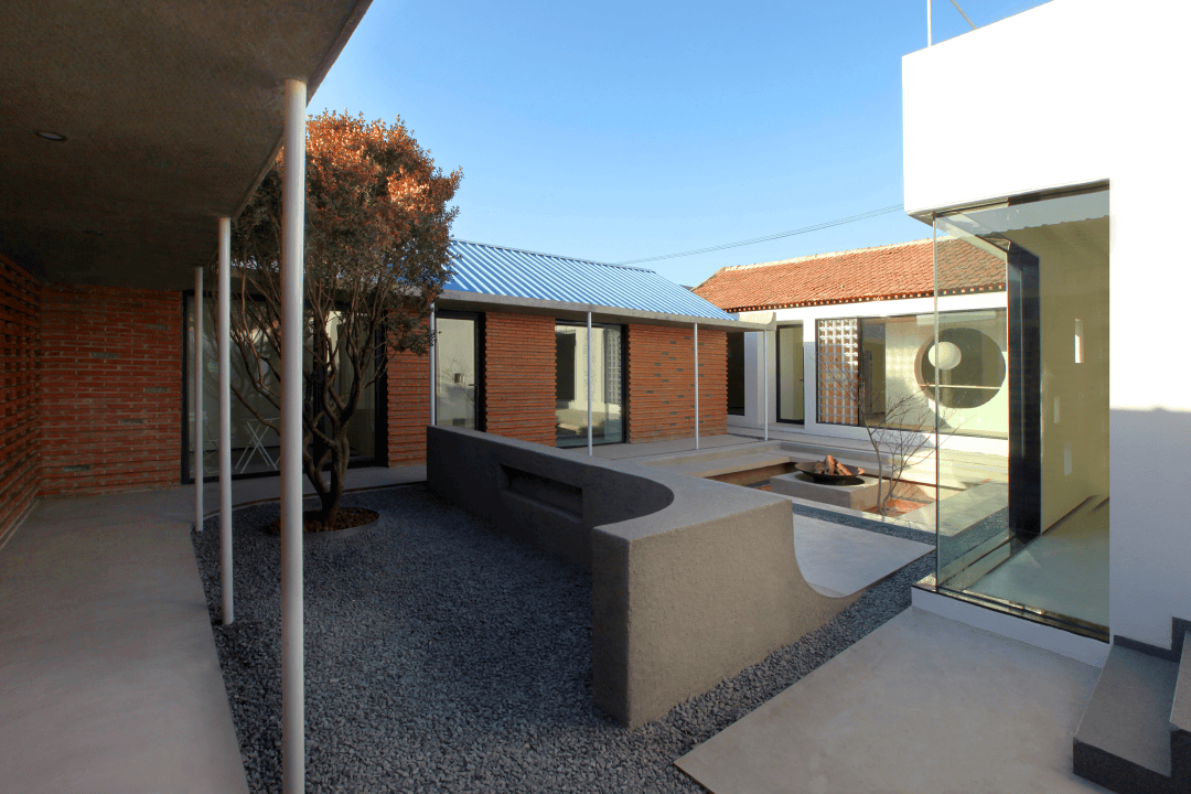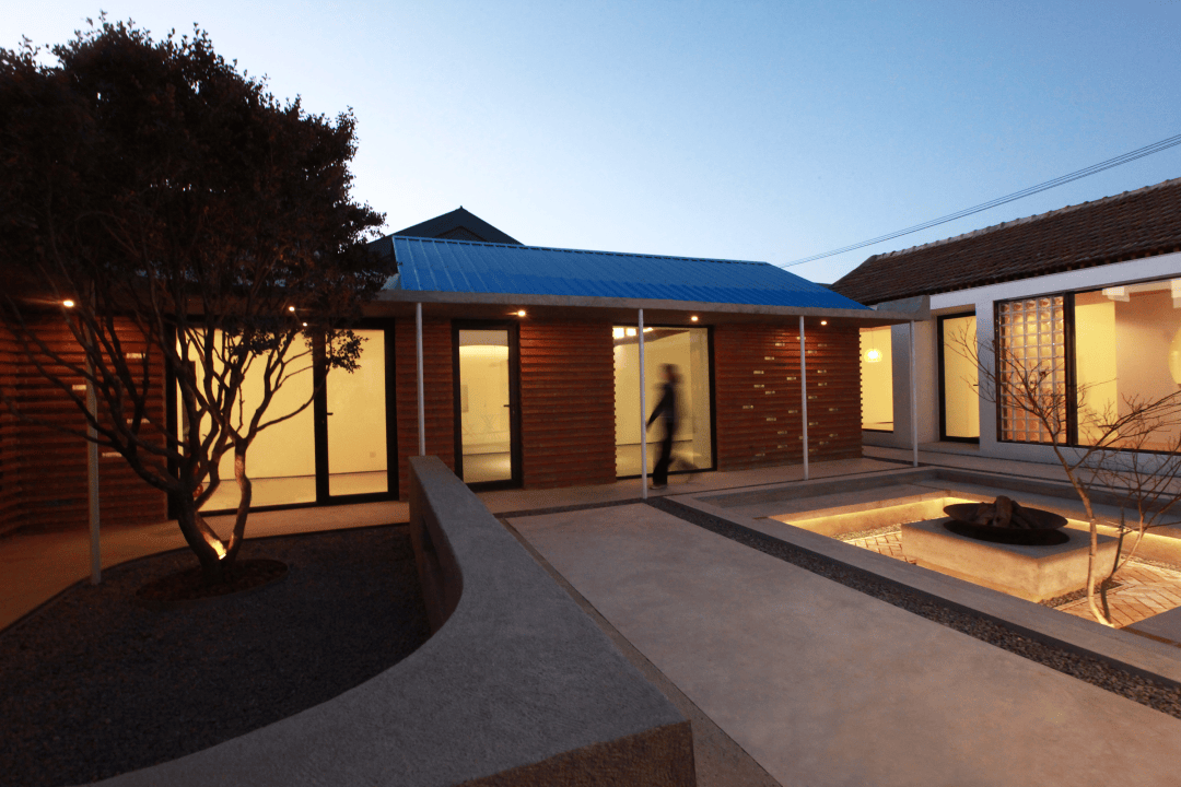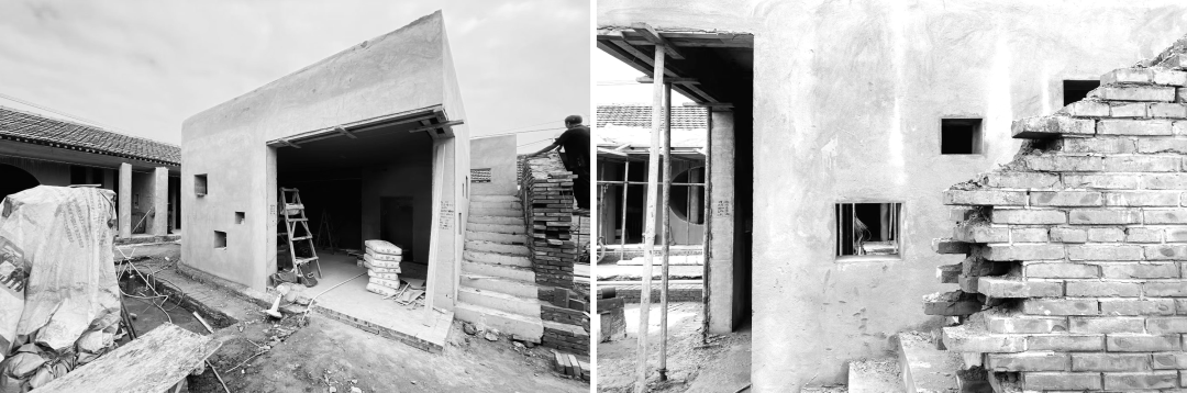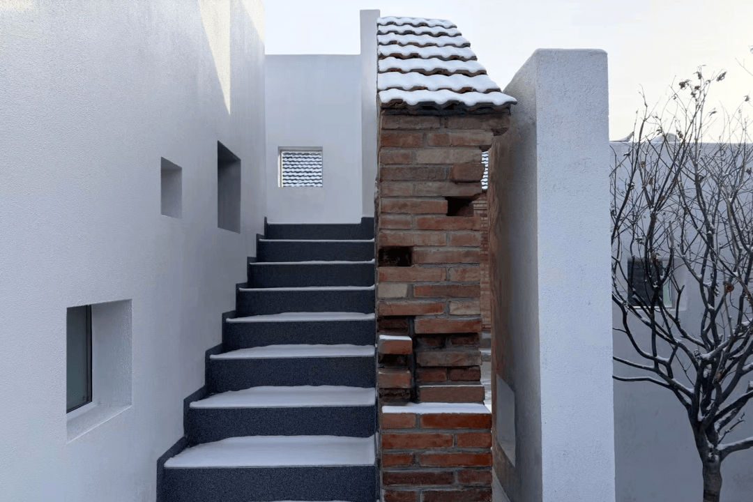 庭院空间:保留院内逾20年的小叶黄杨作为自然核心,在东厢房定制L型玻璃角窗,使室内外自然渗透,黄杨绿意与光影成为连接新旧空间媒介。对于基础差的东厢房,保留现存墙体嵌入新建筑体量,北侧预制L形楼梯直达屋顶平台,拓展了垂直空间与观景体验。从入口到正房的连续柱廊重构了传统合院空间序列,形成具有仪式感的归家流线。庭院底部红砖铺地延续村落肌理,中央混凝土火塘装置重构“围炉而坐”交往场景,植入乡村生活烟火气。