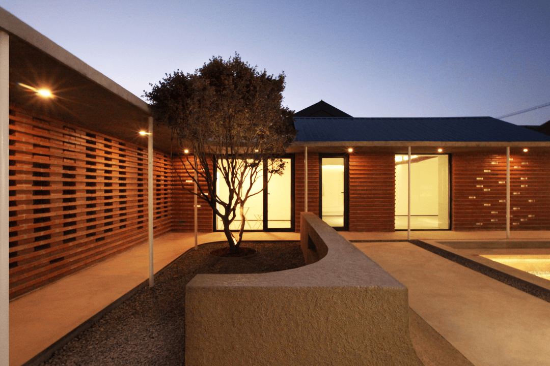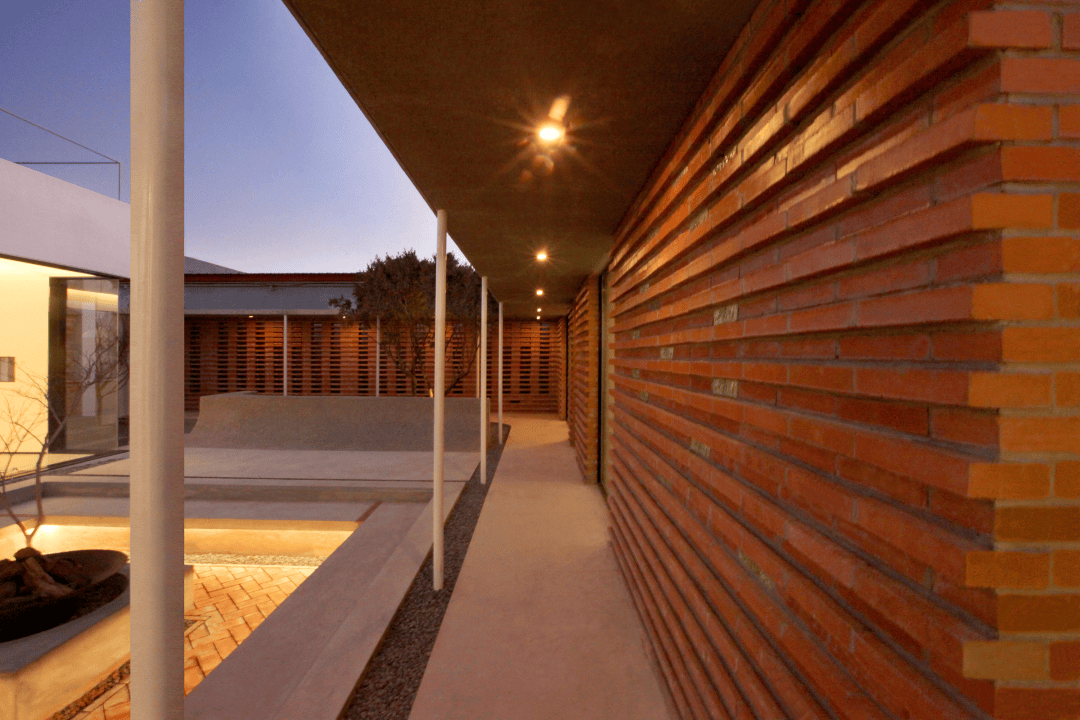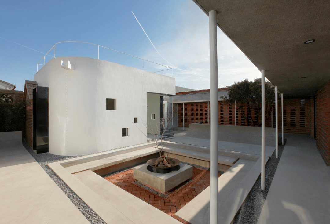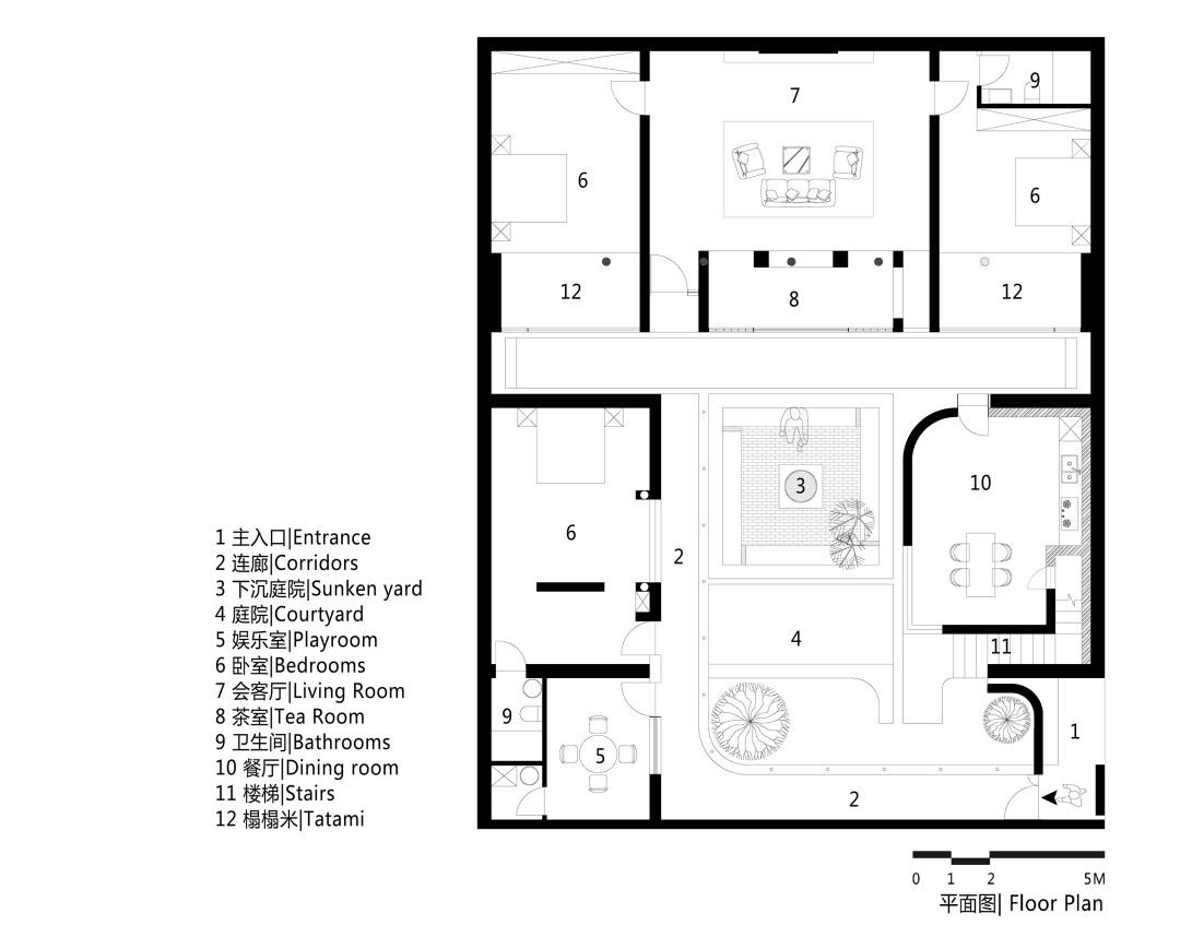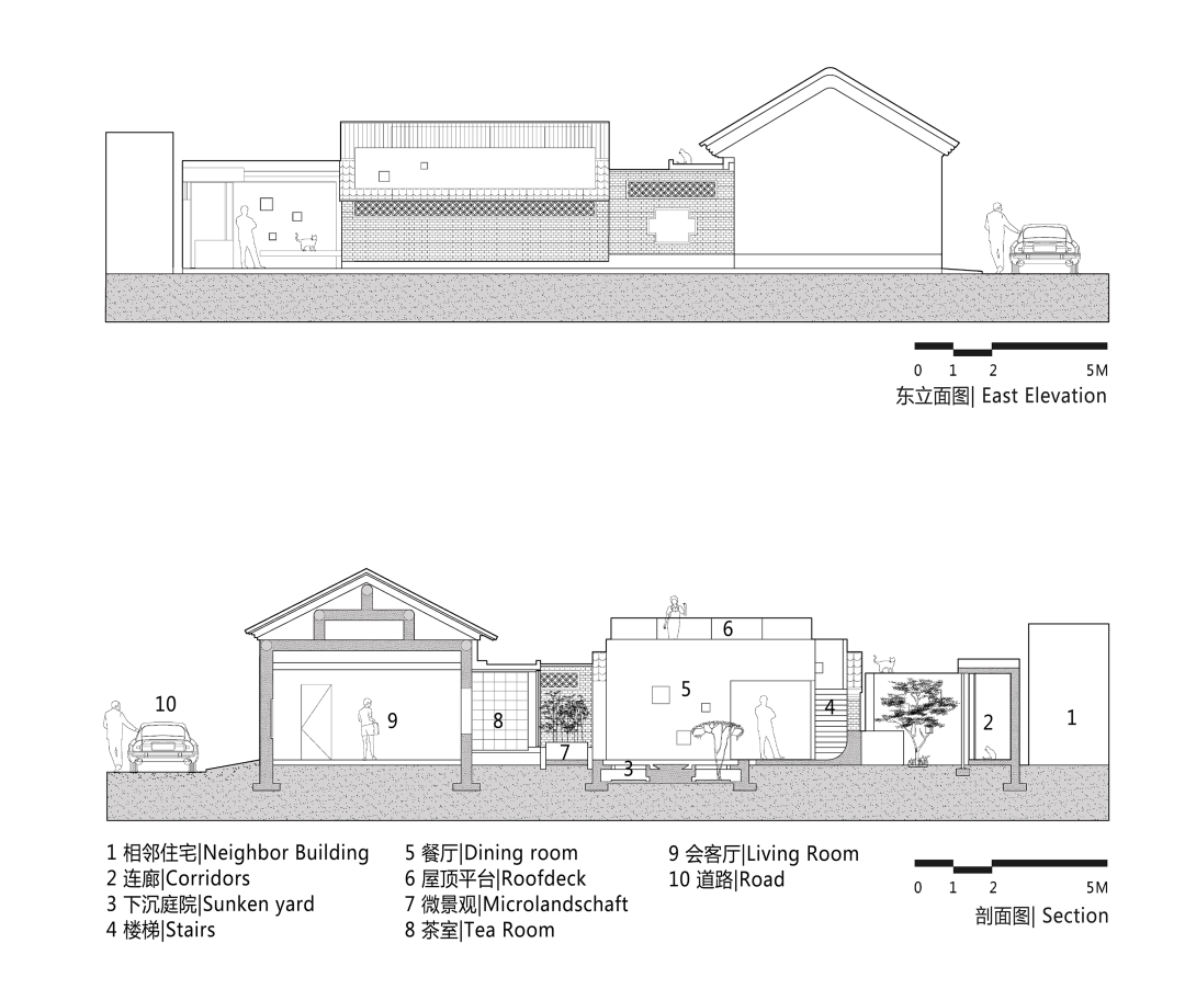 庭院空间:保留院内逾20年的小叶黄杨作为自然核心,在东厢房定制L型玻璃角窗,使室内外自然渗透,黄杨绿意与光影成为连接新旧空间媒介。对于基础差的东厢房,保留现存墙体嵌入新建筑体量,北侧预制L形楼梯直达屋顶平台,拓展了垂直空间与观景体验。从入口到正房的连续柱廊重构了传统合院空间序列,形成具有仪式感的归家流线。庭院底部红砖铺地延续村落肌理,中央混凝土火塘装置重构“围炉而坐”交往场景,植入乡村生活烟火气。