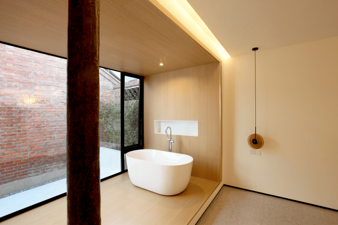 室内空间:完整保留原有建筑木梁与水泥柱结构作为室内显性元素,依托正房主体向外延伸空间打造休憩、品茶空间,实现空间功能延伸与场景体验升级。客房空间落地窗将微景观引入室内,增强了室内外空间的联系与互动。