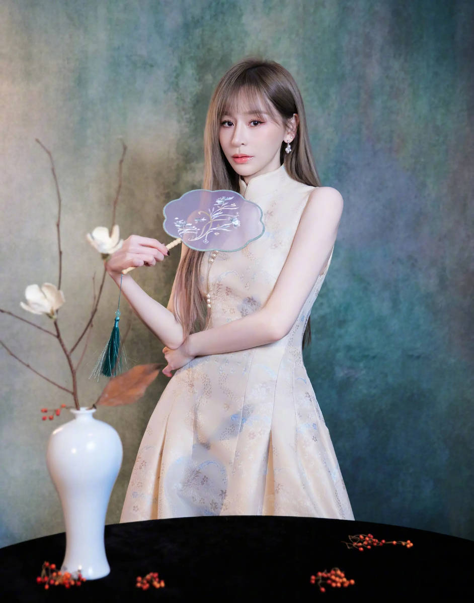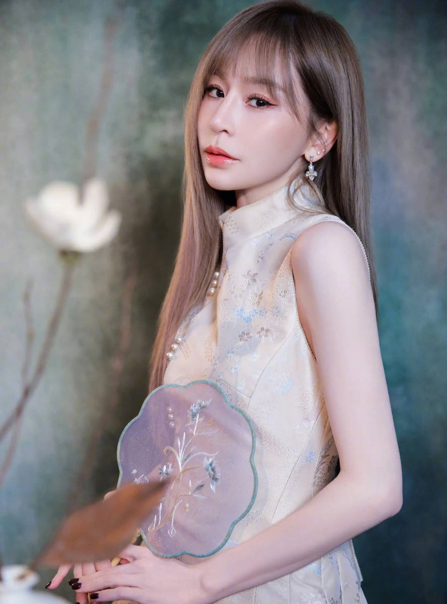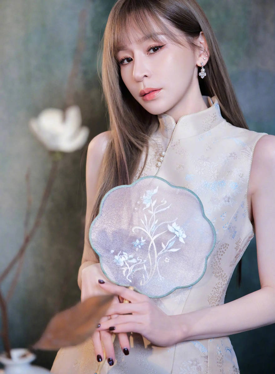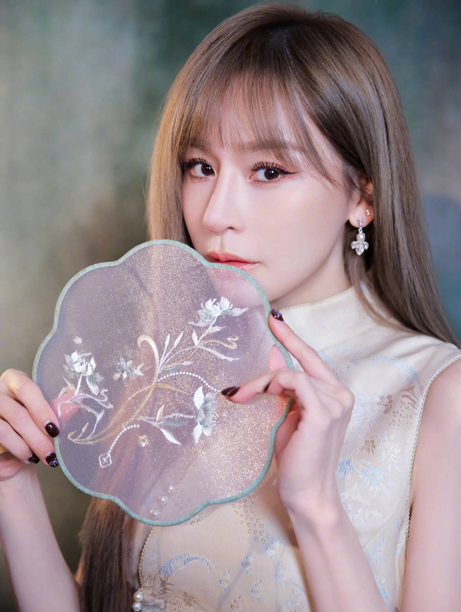 王心凌:浅金提花旗袍配团扇,新中式写真温婉雅致,气质如兰。