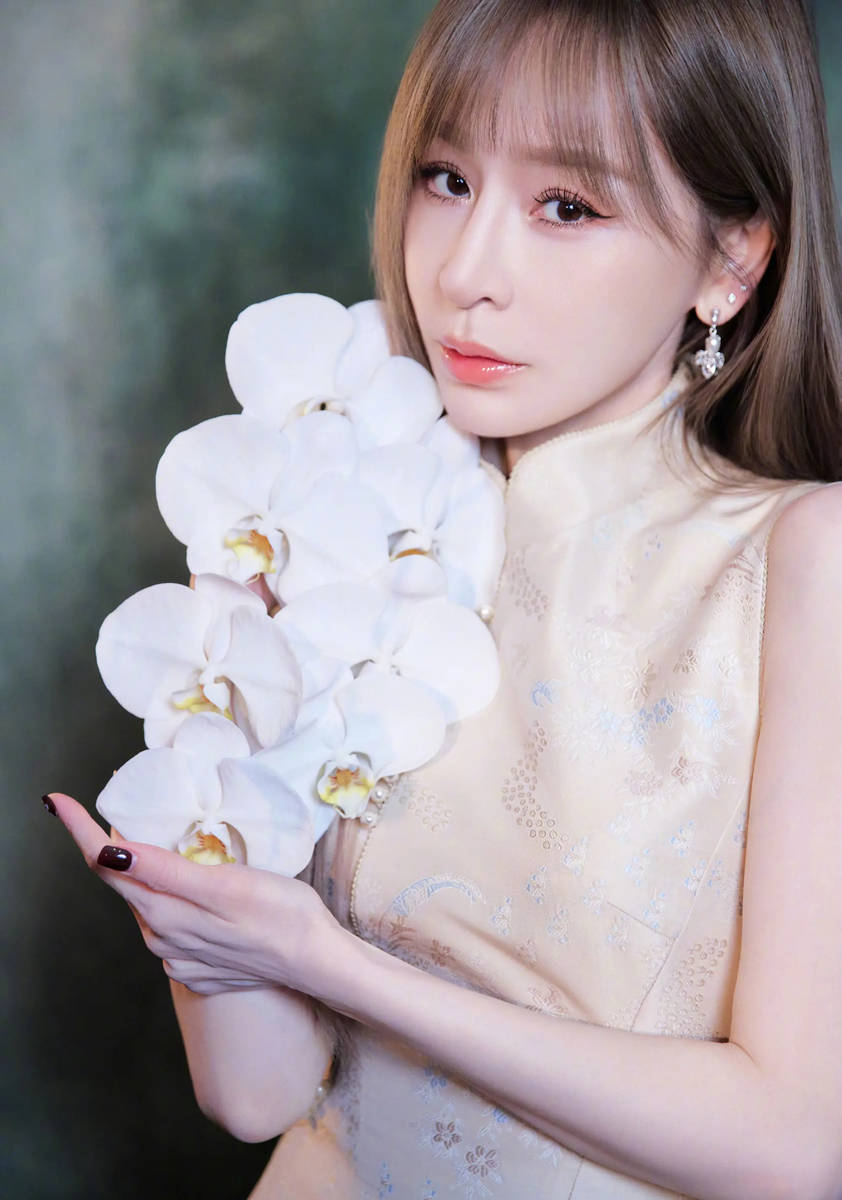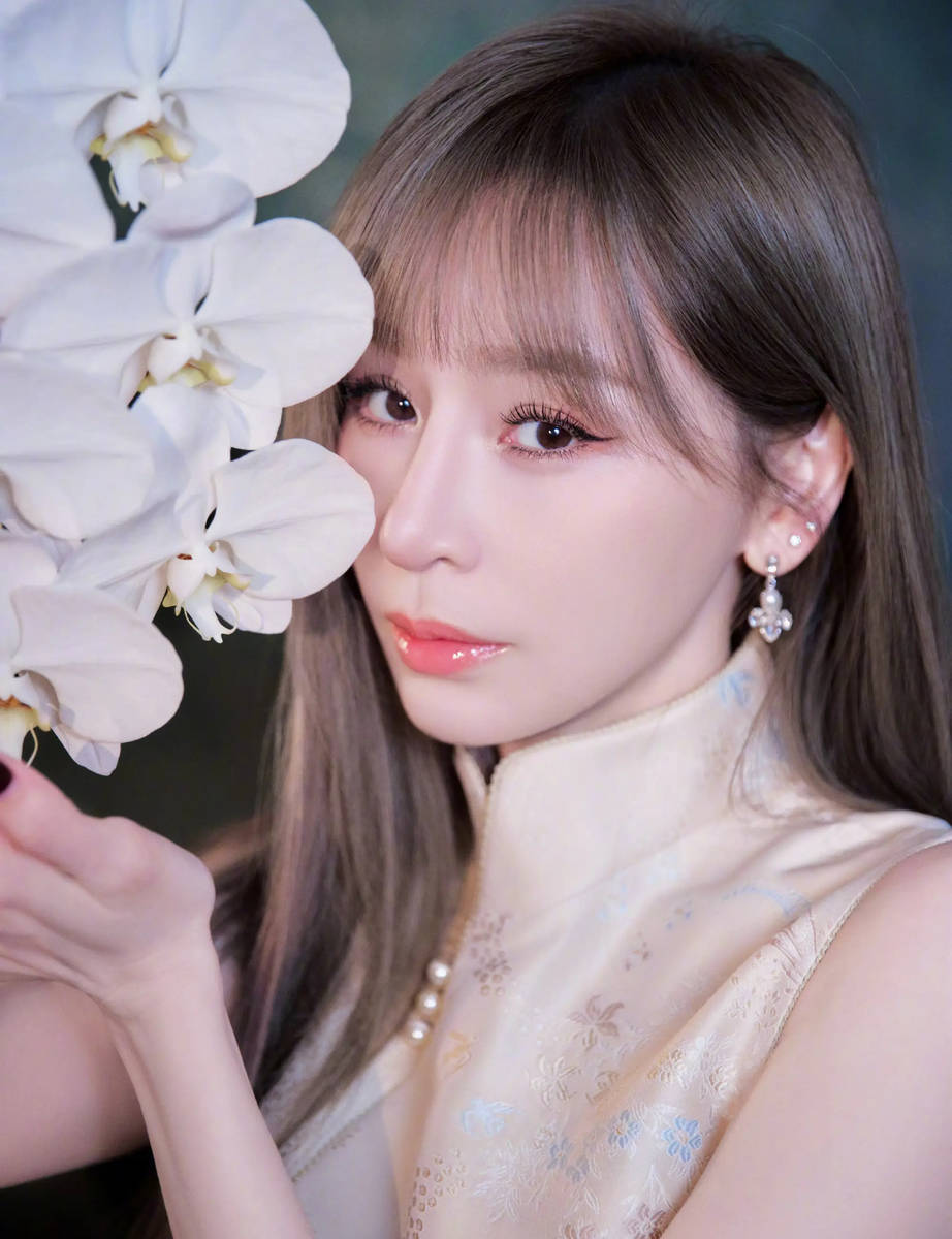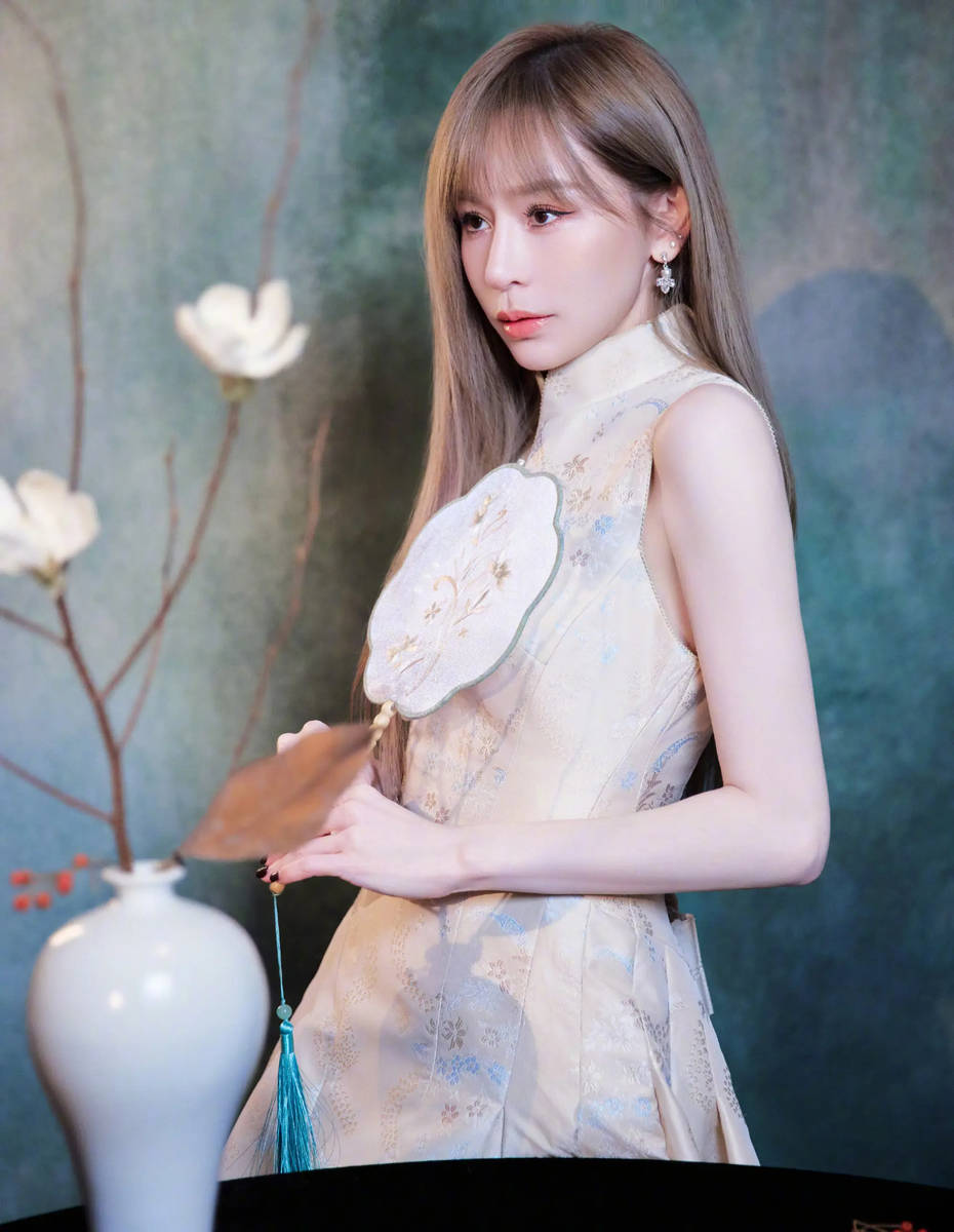 王心凌:浅金提花旗袍配团扇,新中式写真温婉雅致,气质如兰。