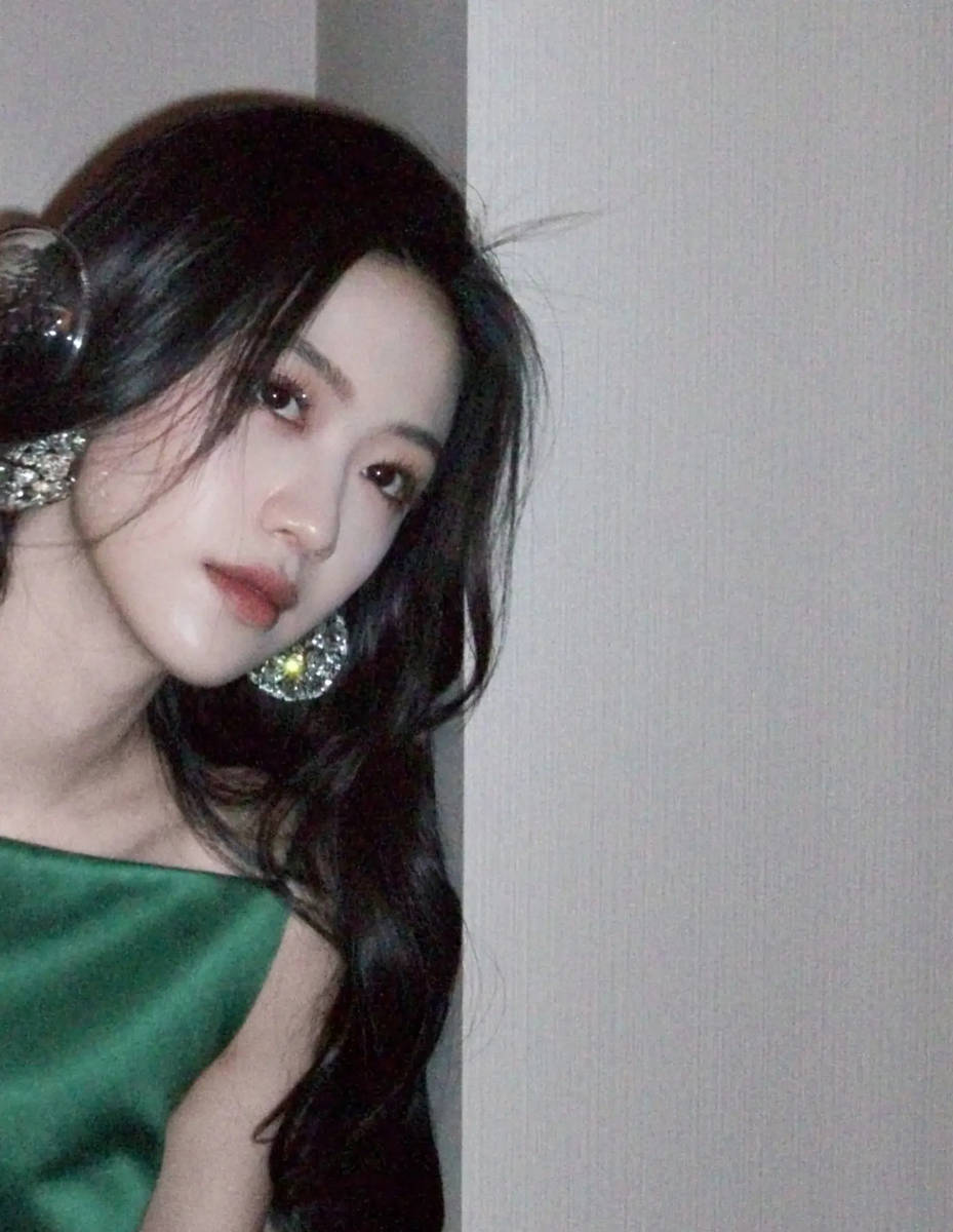 镶满小亮片的修身款,灯光下闪得睁不开眼;低马尾发型利落又不严肃,钻石耳坠与银戒指呼应,细节精致到不行。