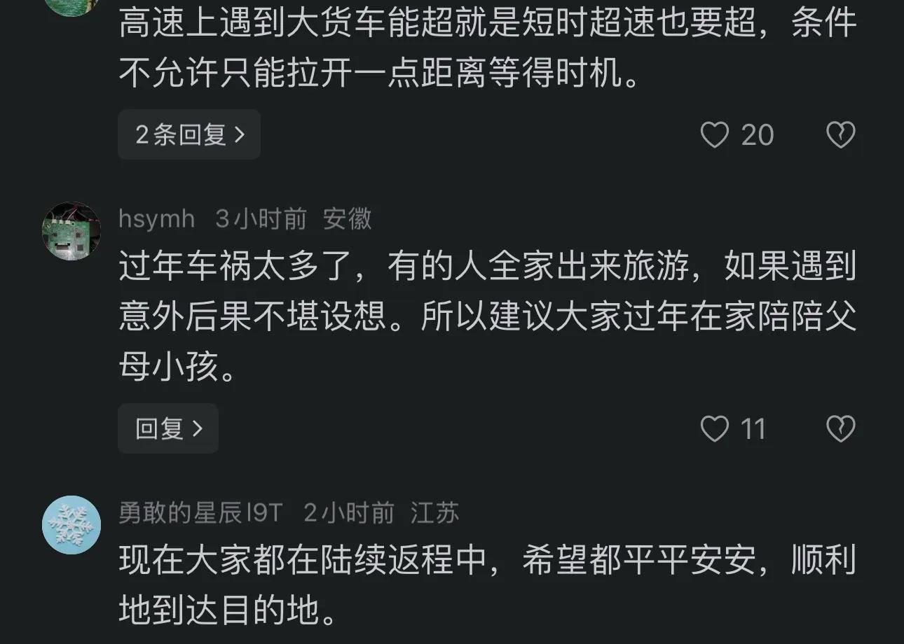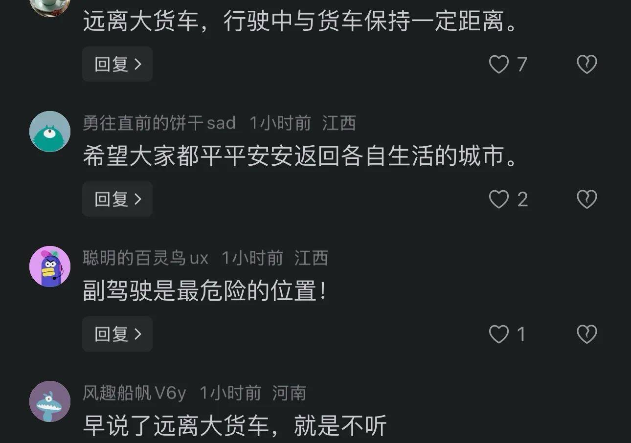 多数网友在为遇难者哀悼的同时,也再次强调了大货车盲区和返程交通安全的重要性。有网友评论称:“远离大货车,这是每个司机的必修课。特别是在春运这种车流密集的时候,小车千万不要和大货车长时间并排行驶。”