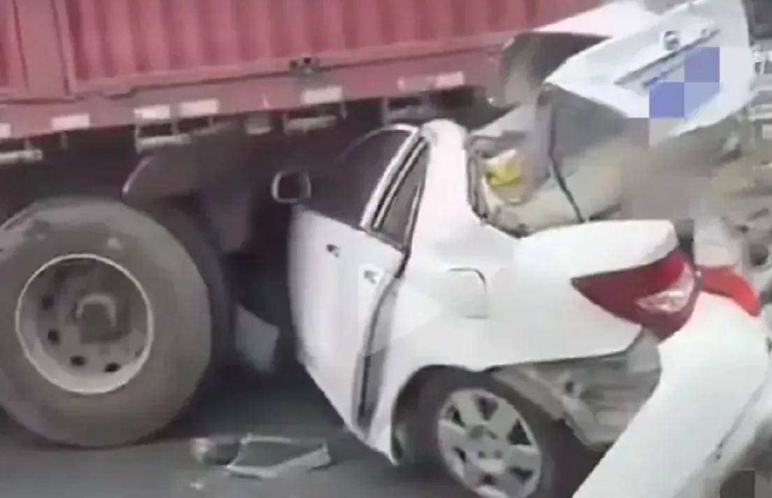 当时事发路段车流量比较大,车辆通行速度缓慢。一辆载着一家五口的小客车,不幸被一辆大货车挤压在高速护栏上。从现场流出的照片和视频片段可以看到,小客车的一半车身因为巨大的冲击力严重凹陷变形,几乎被挤压得面目全非。地面上还散落着车辆碎片和杂物,高速护栏被撞得弯曲折断。
