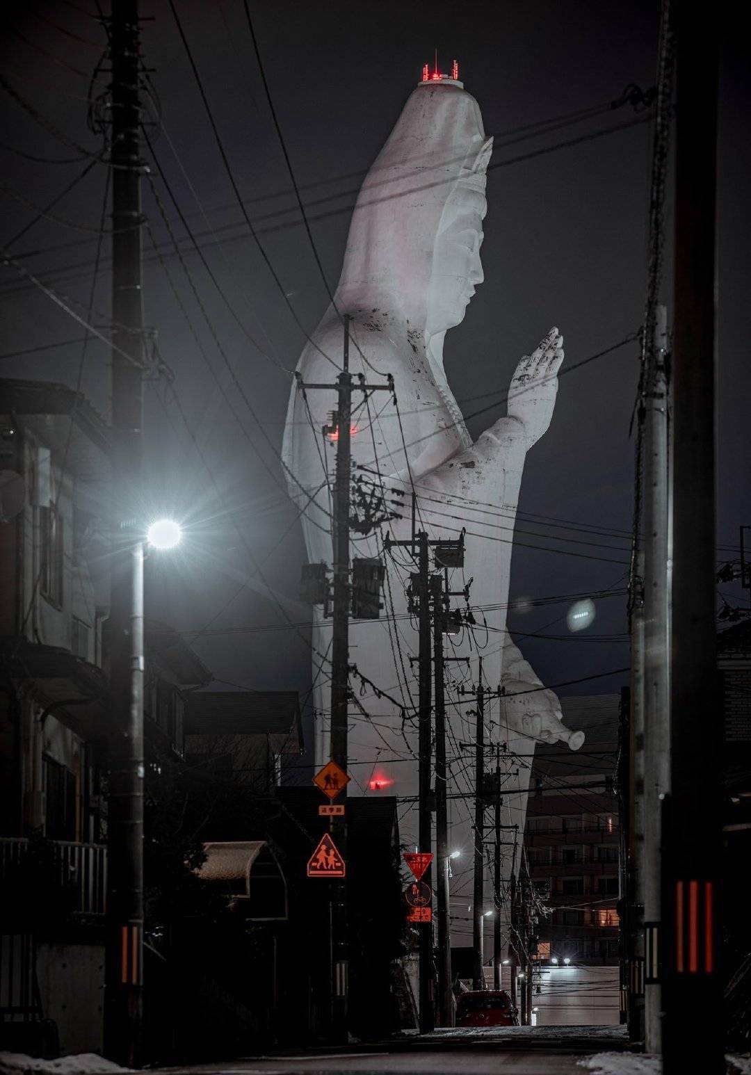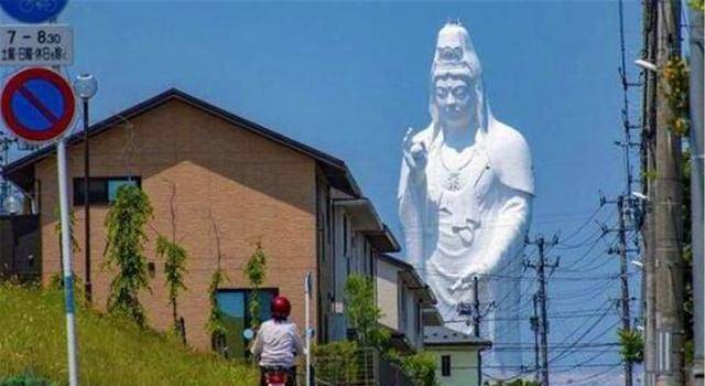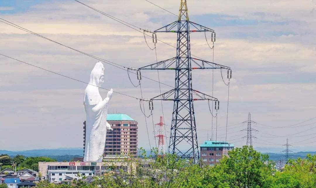 这尊观音像矗立在仙台市居民区旁,地上高度达100米,地下还延伸21米,通体由乳白色大理石建成,体型远超周边低矮的房屋,显得异常突兀。其“诡异”主要源于: