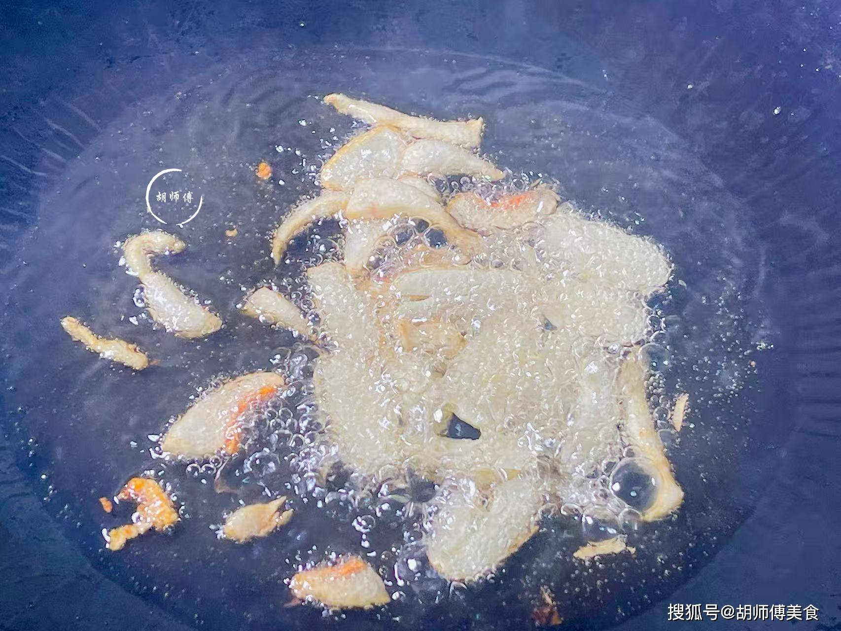 第三步:锅中放入一点点油,然后将肥猪肉放入锅中,大火将肥肉炸成金黄色后,就把猪油渣捞出,同时锅中的油比较多,也需要舀一半出来,接着再把切好的蒜片放入锅中爆香3秒。