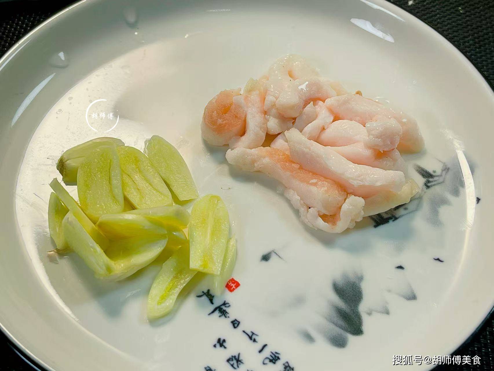 第二步:把肥猪肉冲洗干净,然后将猪肉切成0.8厘米宽4-5厘米长的条状备用,然后再把大蒜籽洗净后切成蒜片备用,喜欢吃辣的,可以切1-2个干辣椒段备用。