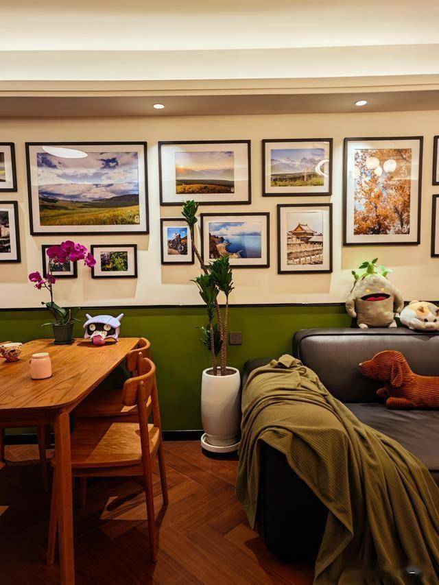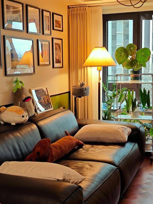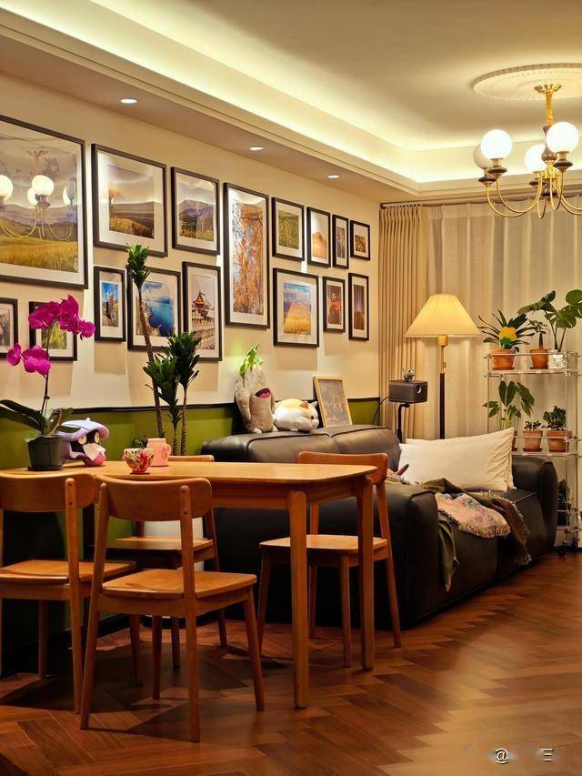 客厅不大,却能装下我所有的疲惫。加班晚归时,窝在沙发里刷会儿手机,暖黄的落地灯把影子拉得很长;周末的午后,阳光透过纱帘洒在地板上,泡一杯热茶,看绿植在光影里摇曳;朋友来做客时,围着餐桌聊到深夜,笑声撞在照片墙上,又轻轻落回心里。