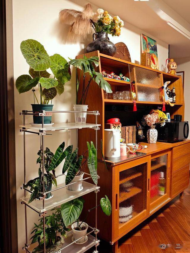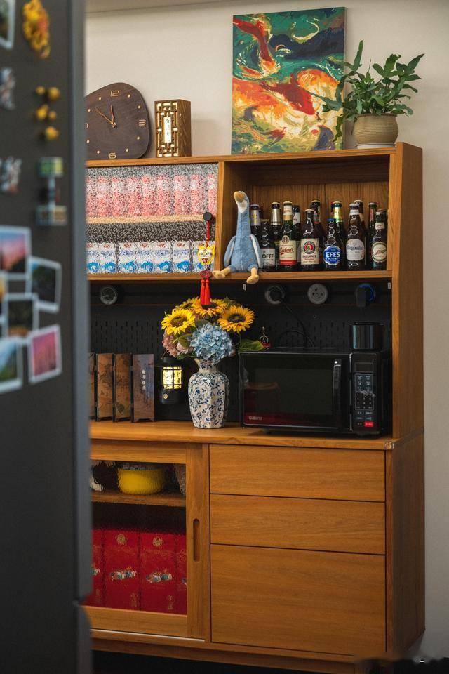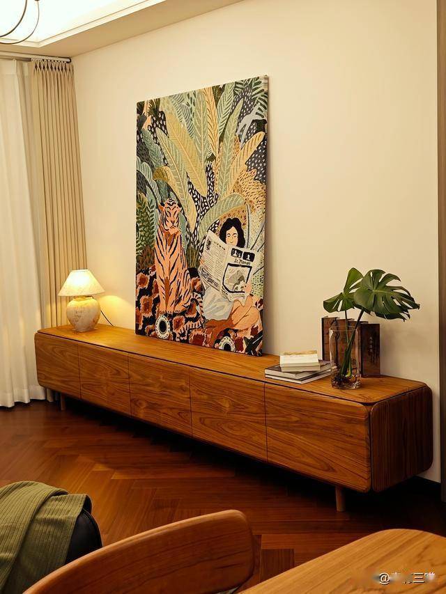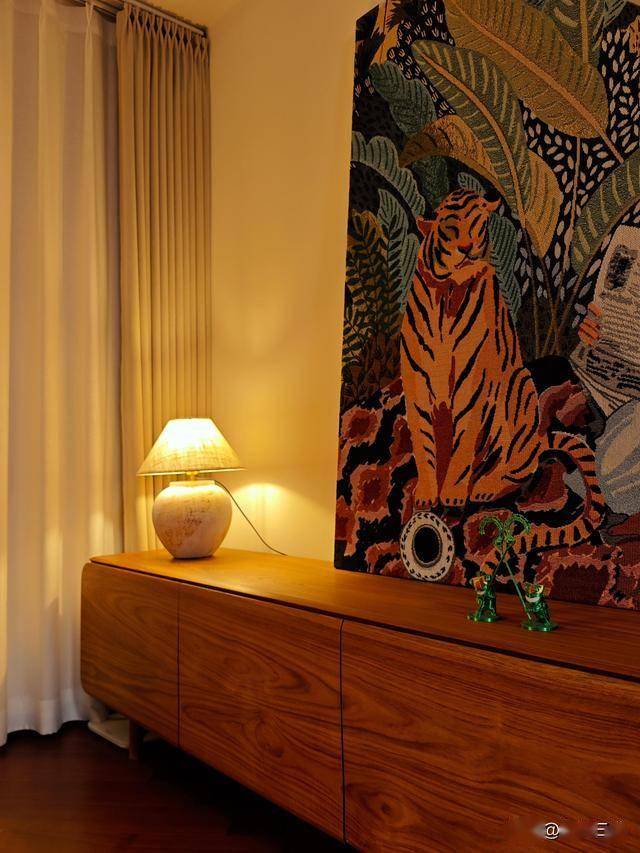 才慢慢懂得,这就是普通人最真实的家。它不惊艳,没有网红家居的精致滤镜;不刻意,每一件摆件、每一处布置,都是生活自然流淌的痕迹。那幅老虎与读报少女的挂毯,是我一眼就心动的藏品;木质餐边柜上的粗陶花瓶,插着永远不会凋谢的仿真花;就连沙发上的毛绒玩偶,都是陪伴我多年的“老伙计”。