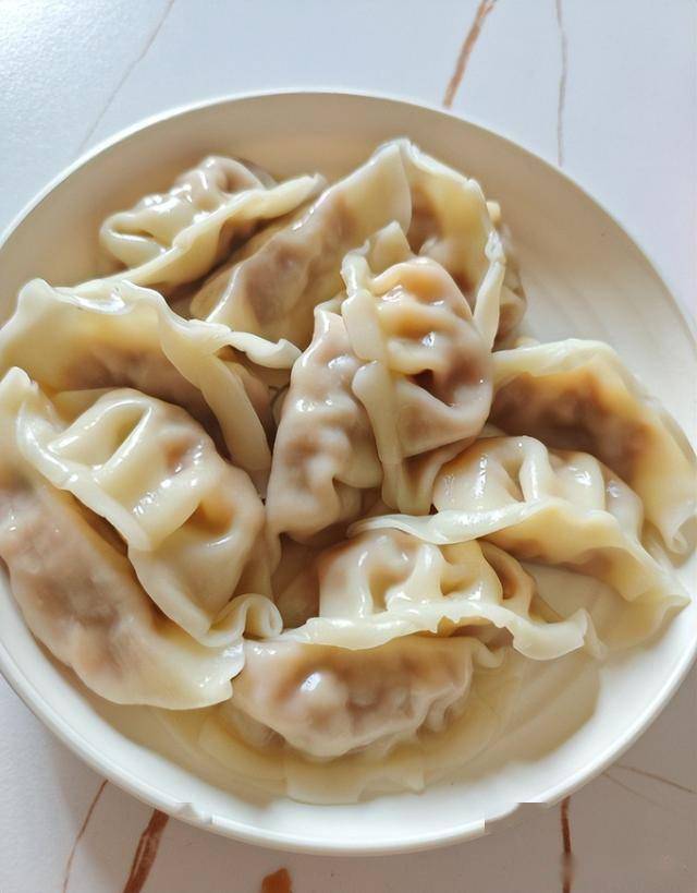 7. 锅中烧开水,放入包好的饺子,用铲子轻轻推动,防止饺子粘连,待饺子浮起后,加入少许冷水,再次煮开后,饺子就熟透了,捞出装盘。