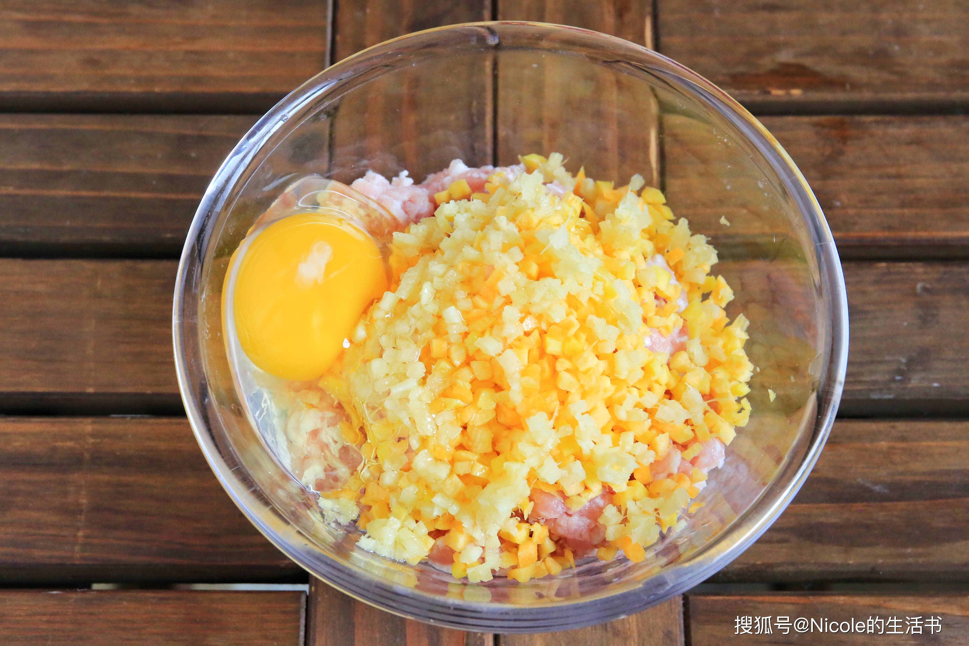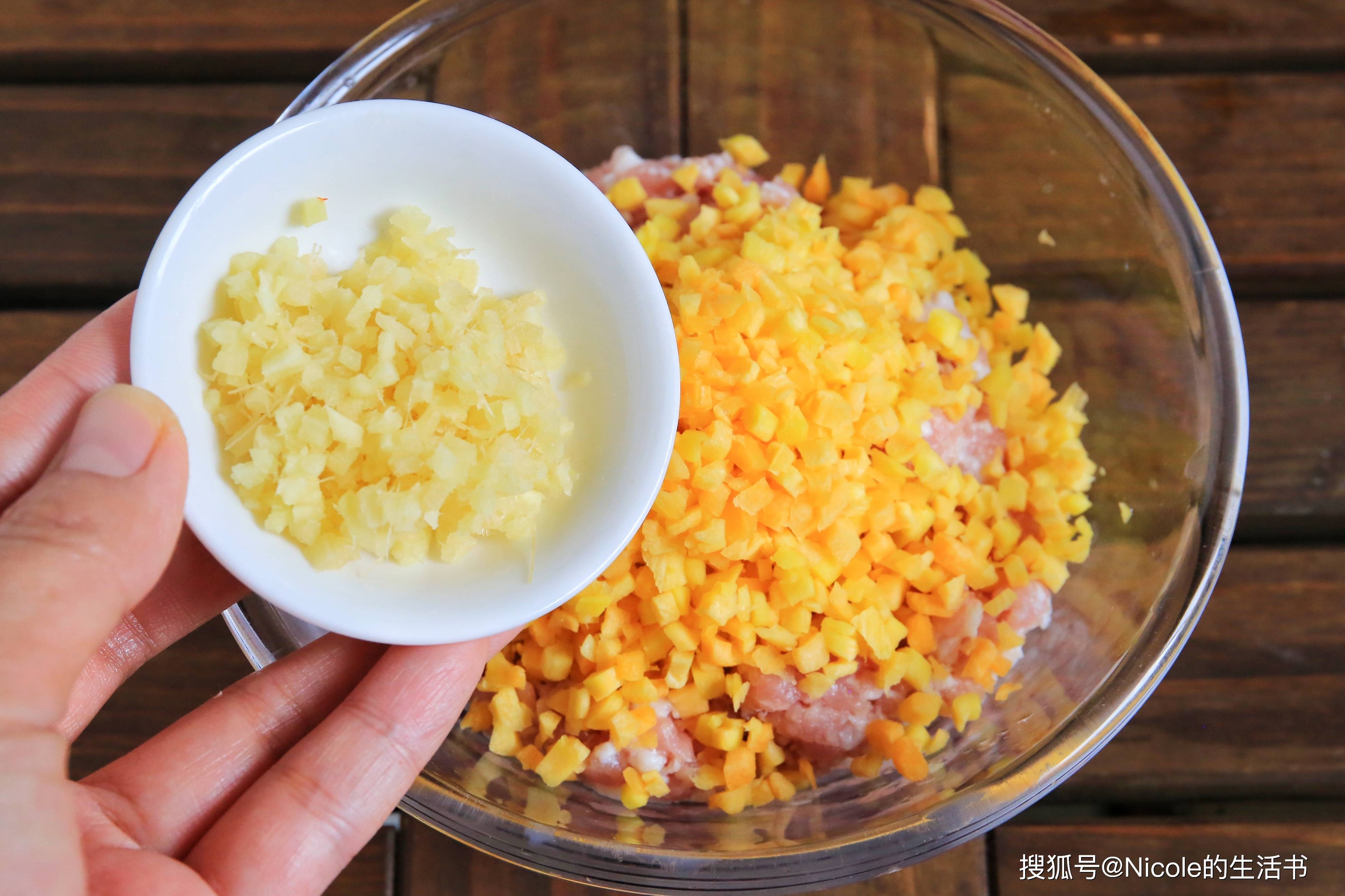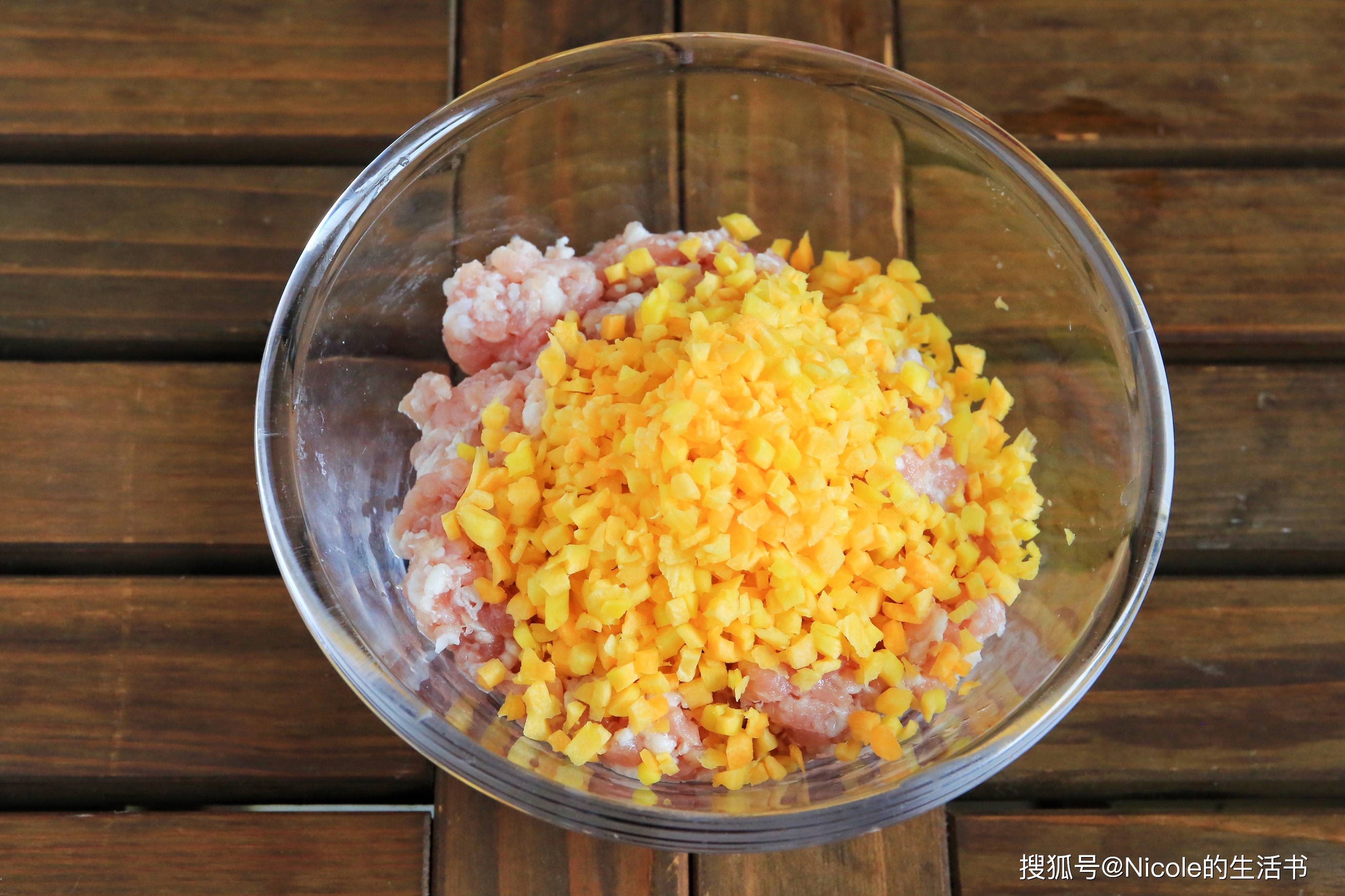 1、胡萝卜碎倒入肉馅中;