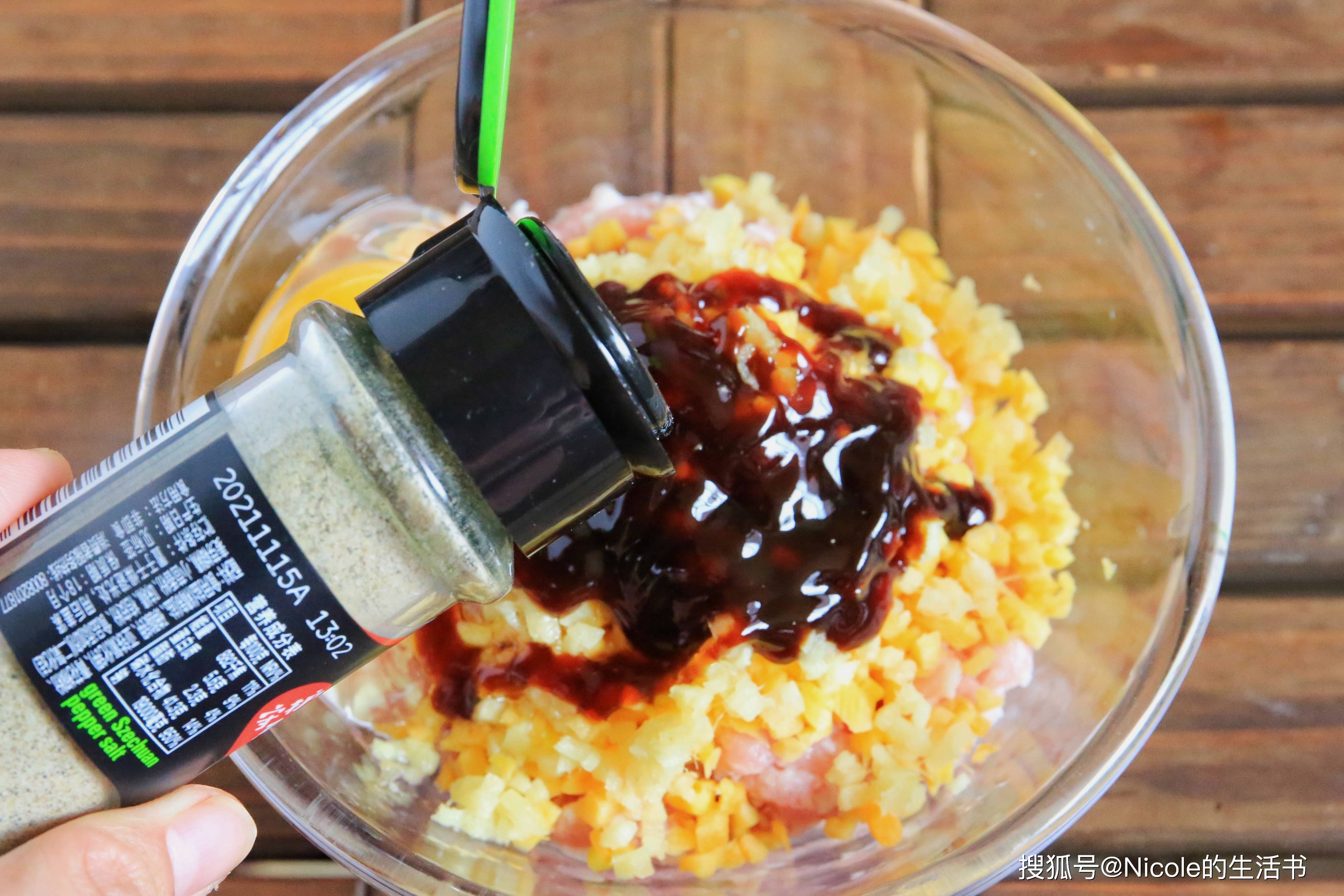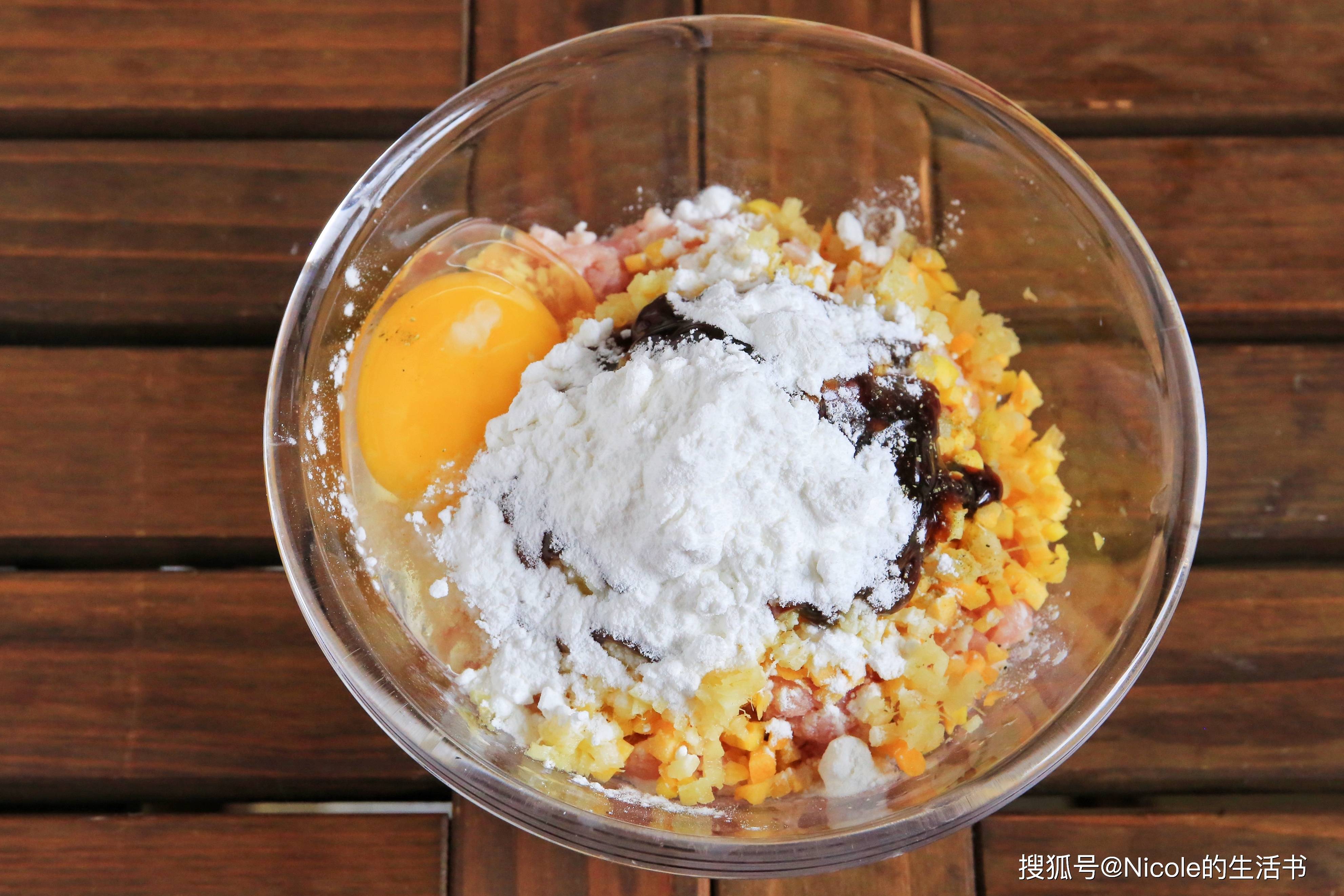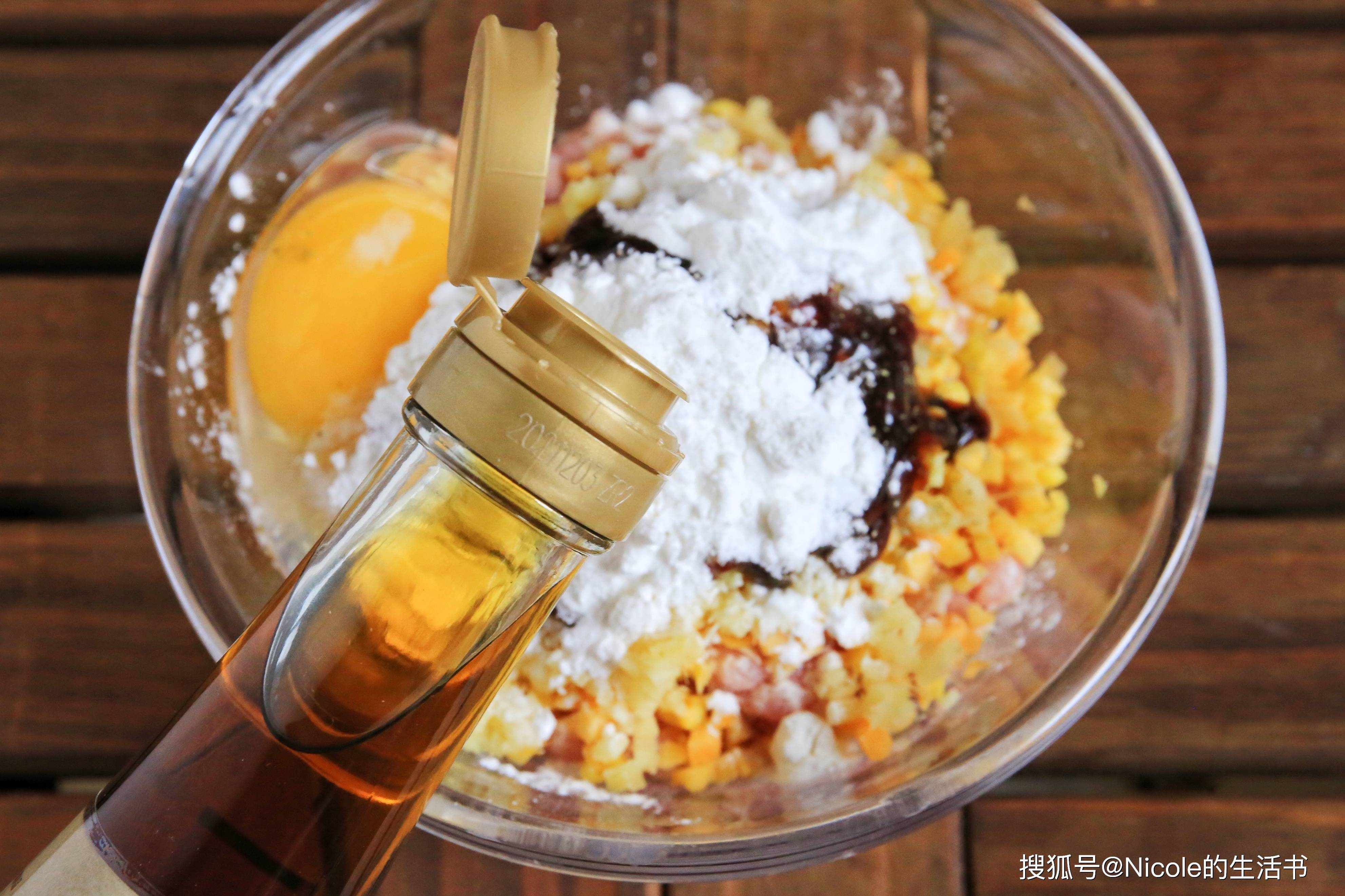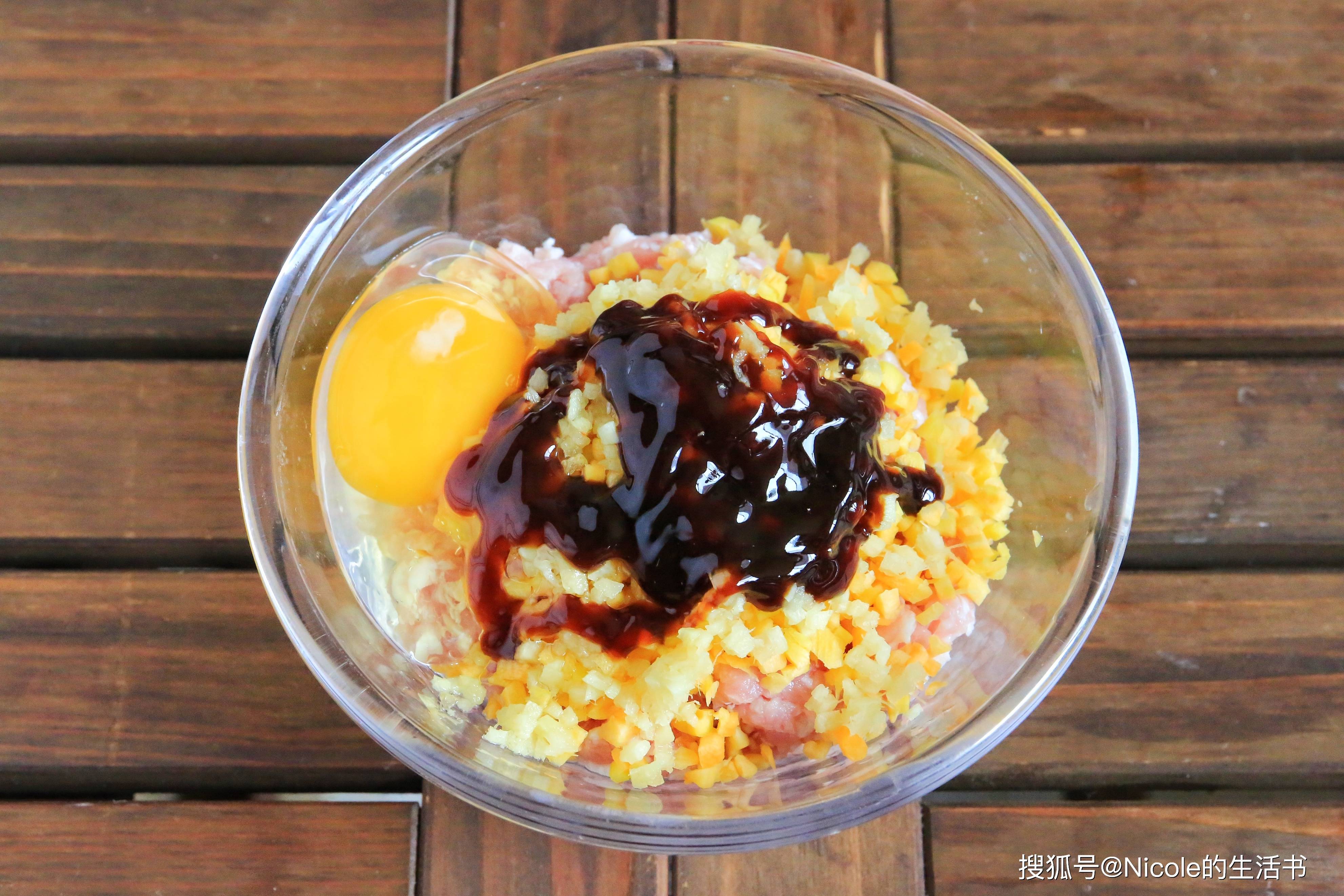 1、胡萝卜碎倒入肉馅中;