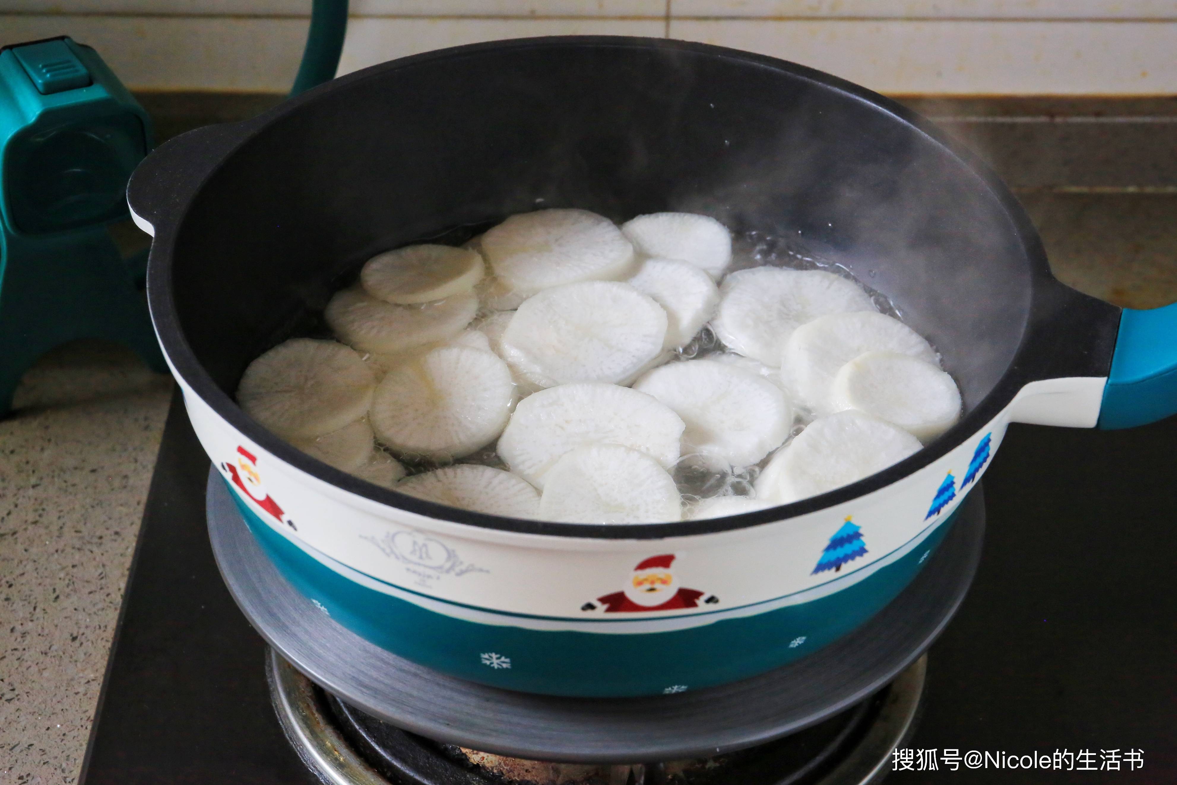 9、锅中加水烧开,放入萝卜片煮软;