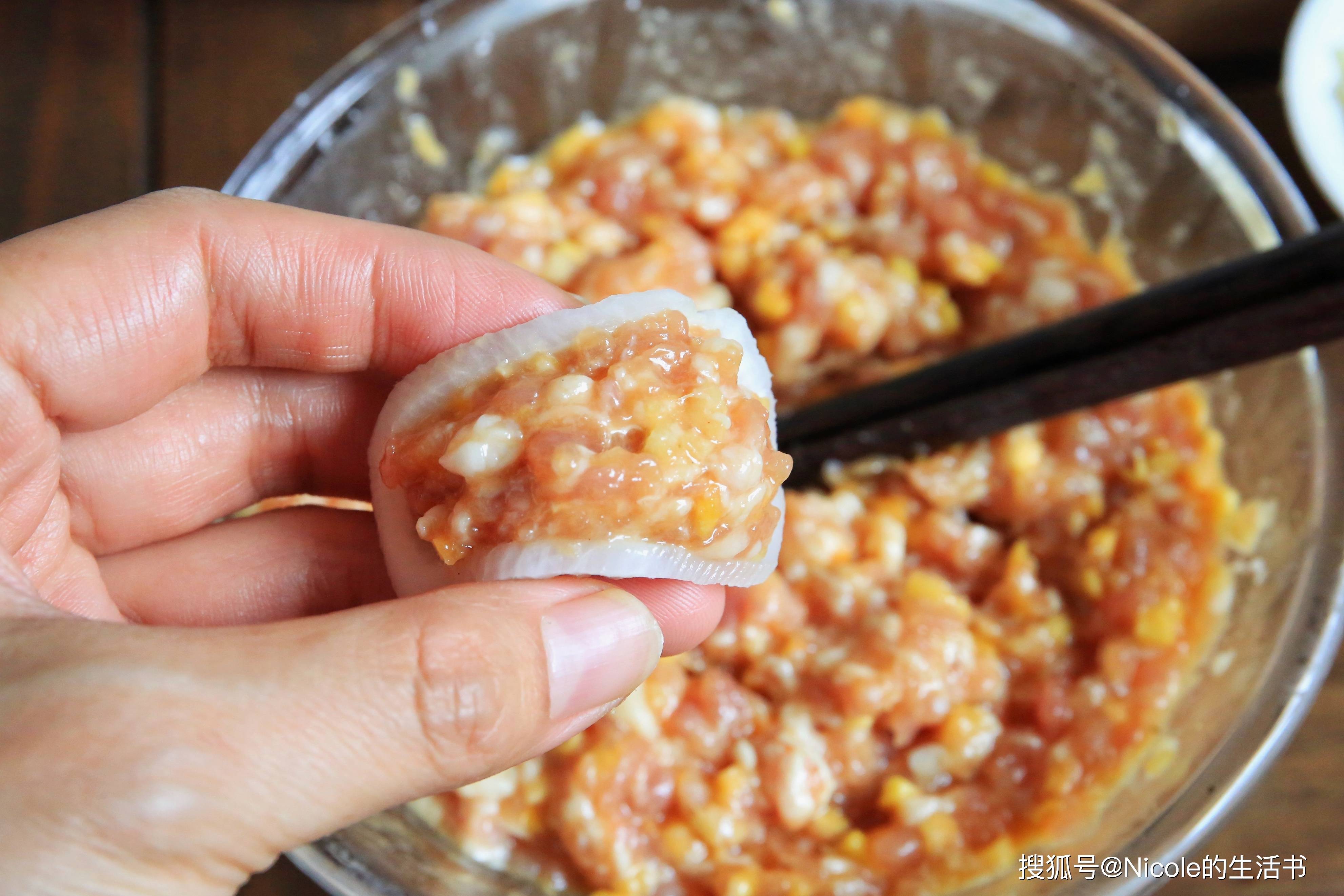 11、将腌制好的肉馅放在萝卜片上,夹起来;