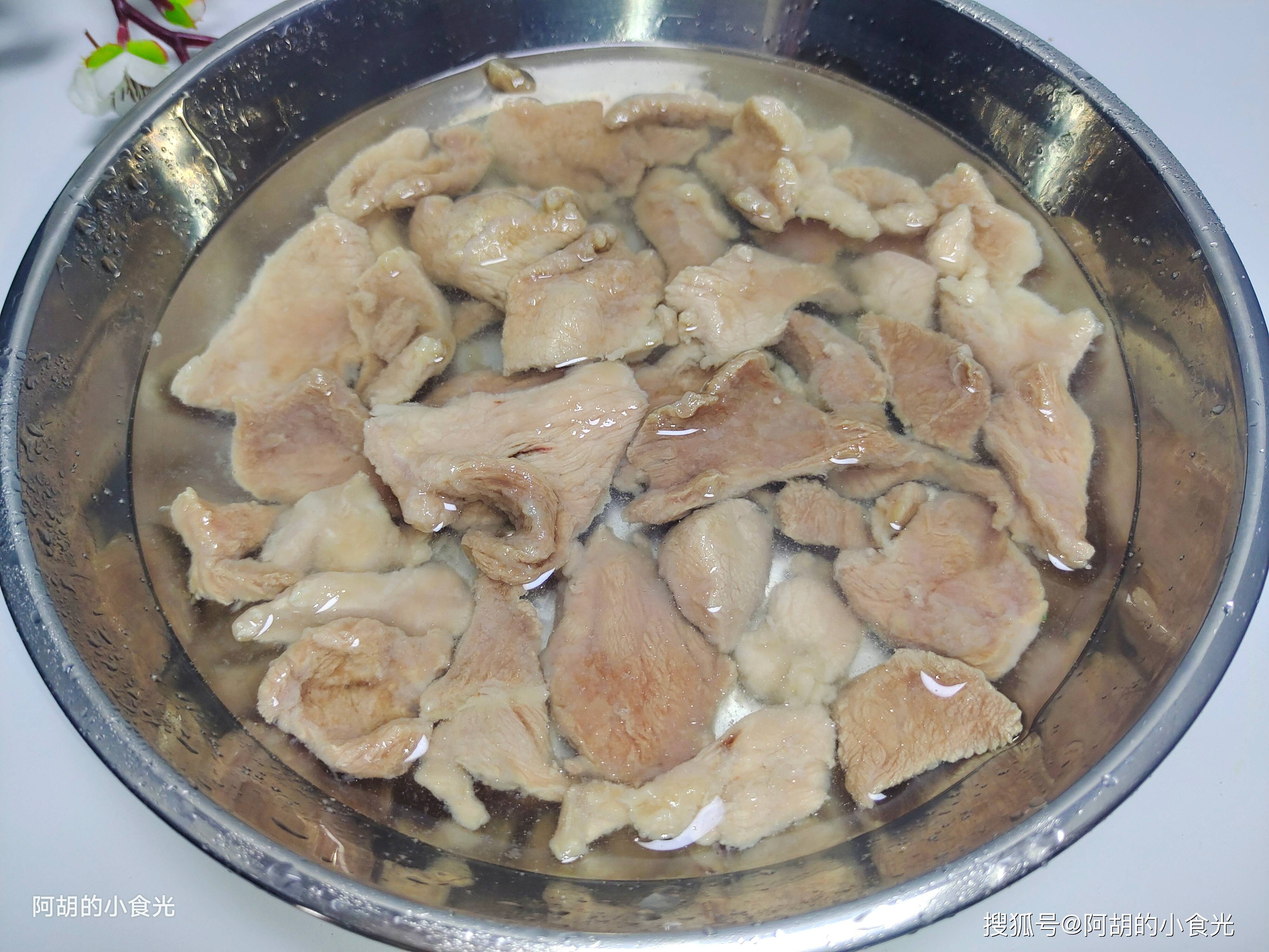 第四步:锅里大火烧一些开水,烧开后就立刻关火,再取出浆好肉片一片一片地下入开水中,不要乱动让开水中的肉片渐渐变色凝固,而后再开小火将其煮开,关火后捞出肉片放入凉水中冷却一下,让肉片外面的粉浆能够更好的定型凝固不脱落。