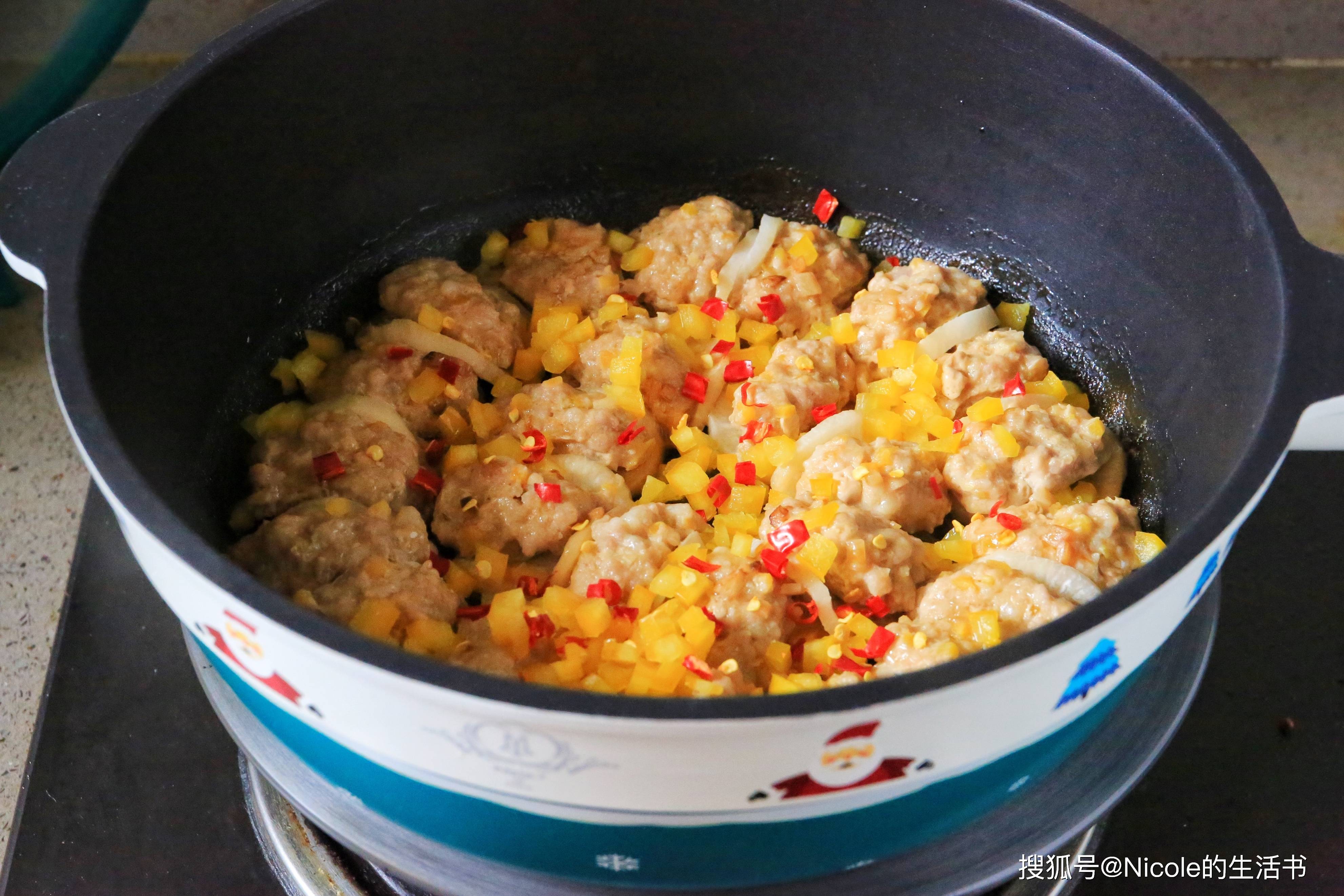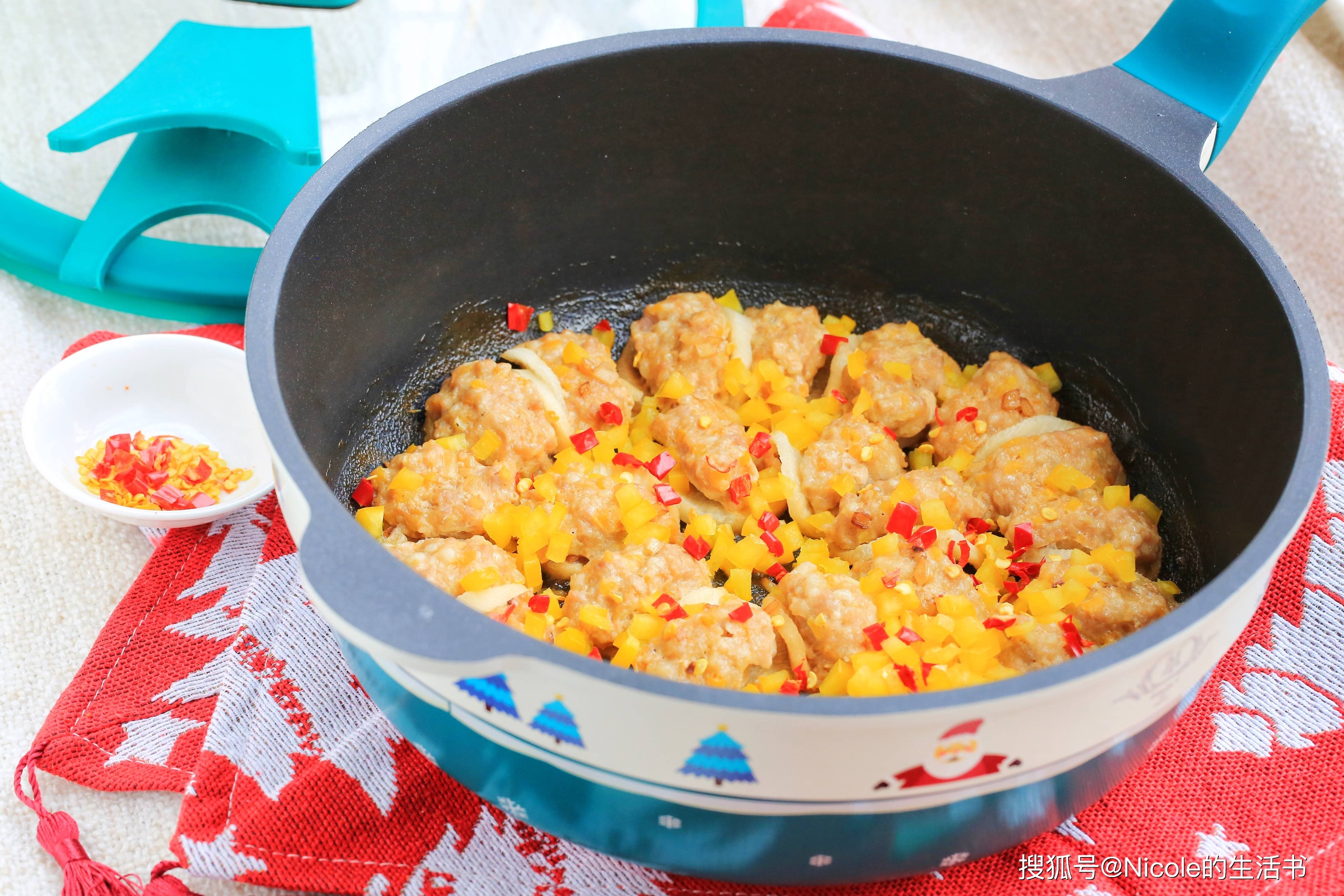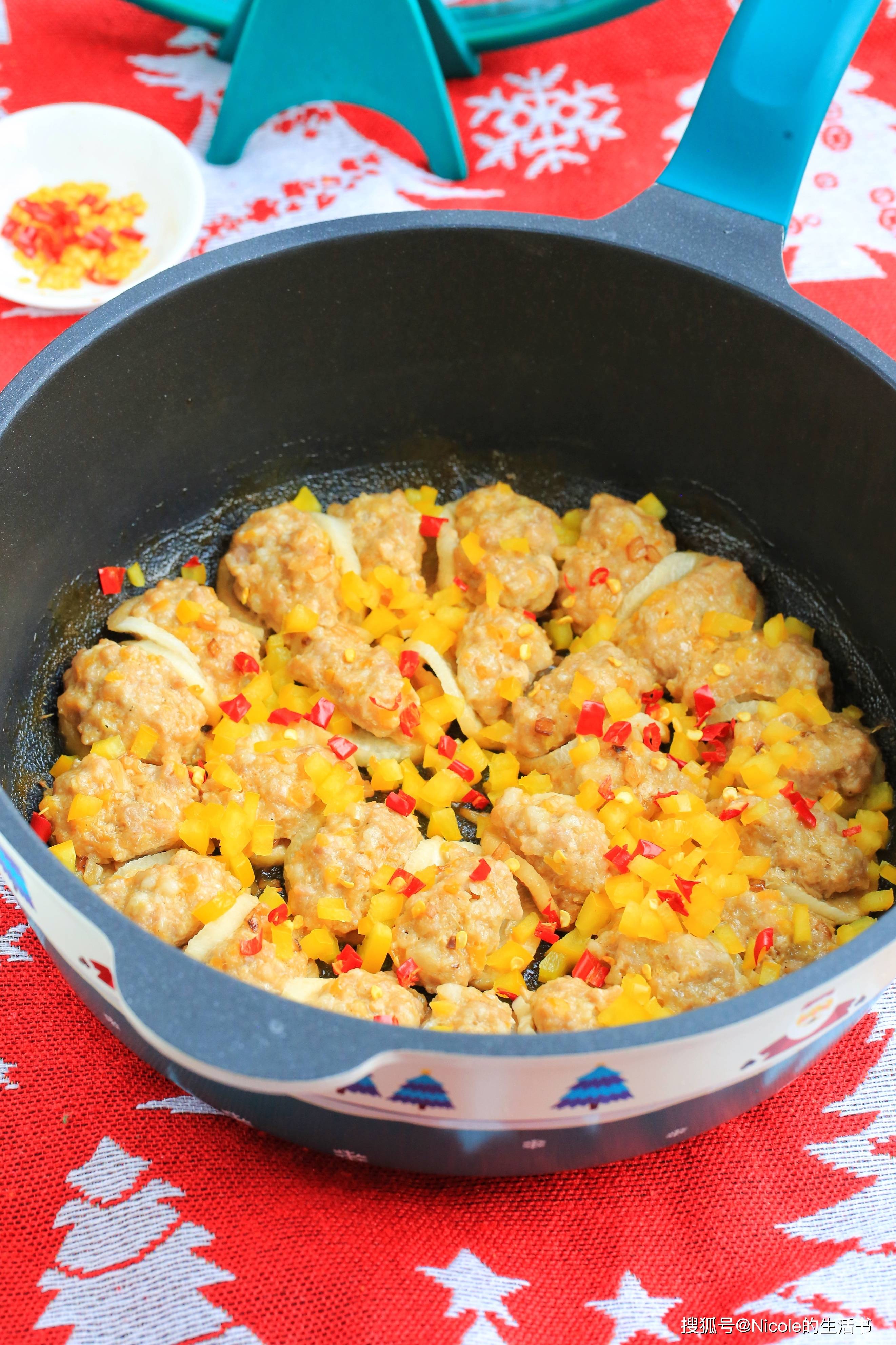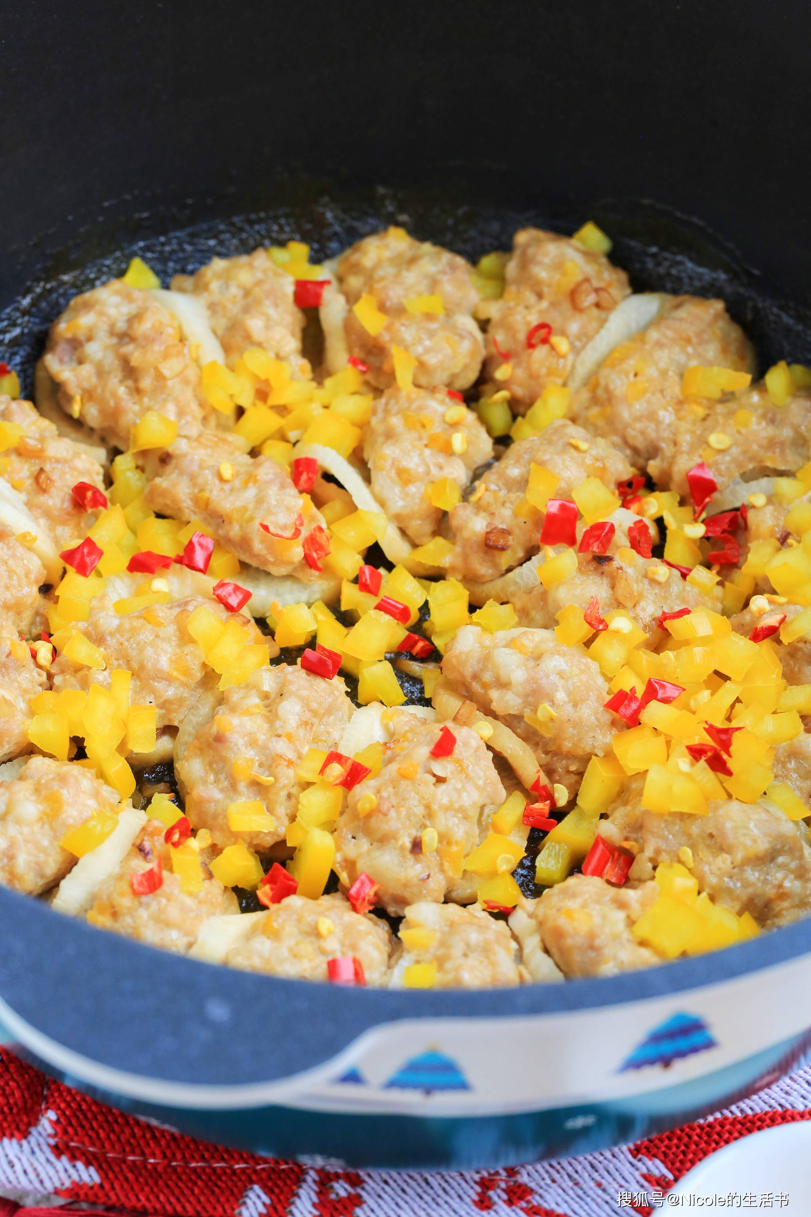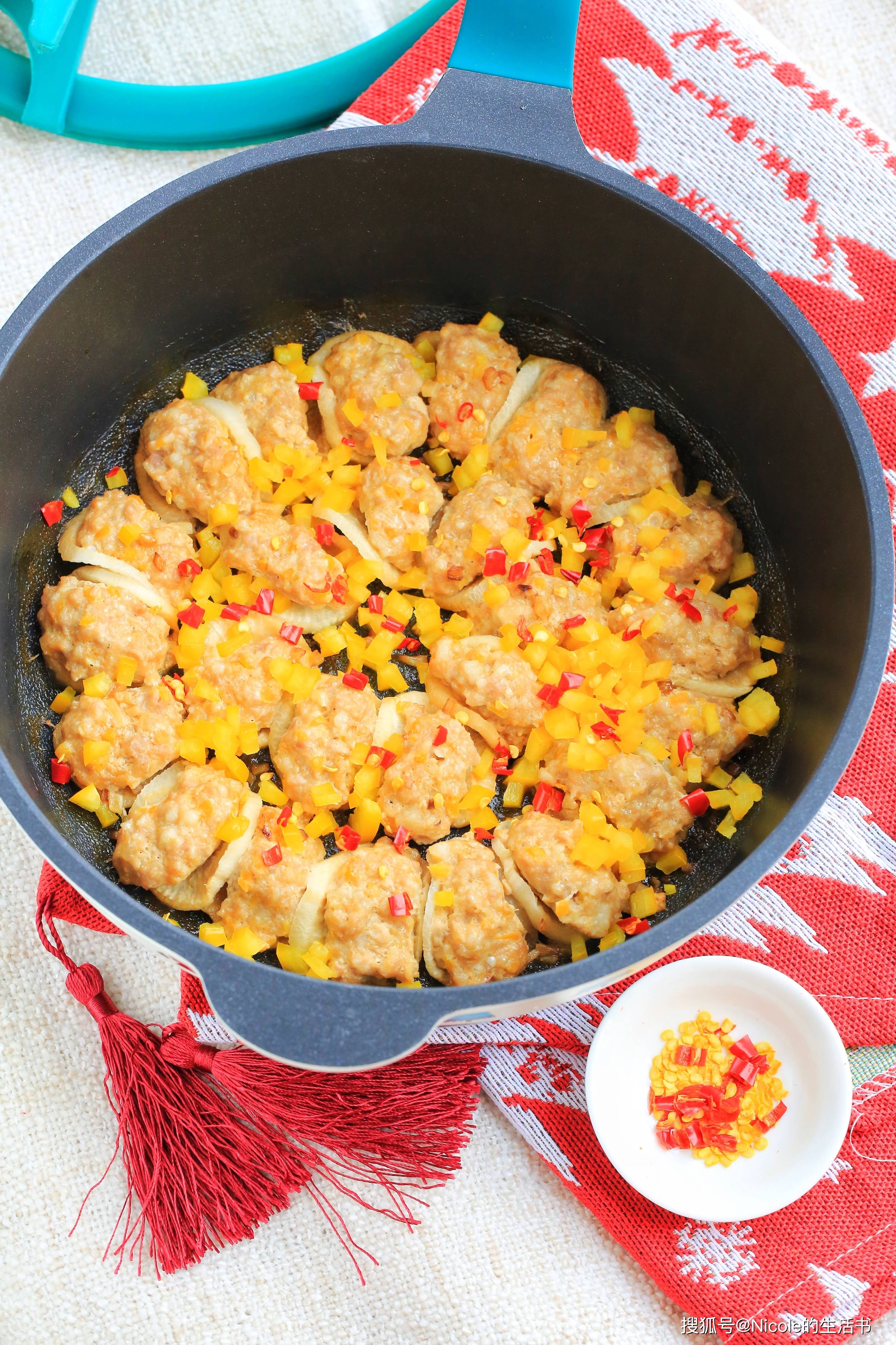 白萝卜洁白如玉,口感清甜,“白”象征着纯洁、吉祥,“萝卜”的“萝”与“罗”谐音,寓意着“招财进宝、包罗万象”;彩椒、红辣椒,色彩鲜艳,红、黄、绿交织,象征着“五彩缤纷、红红火火”,也寓意着“新的一年多姿多彩、喜乐常伴”。白萝卜片煮软后酿入肉馅,口感软嫩,肉馅鲜香,与萝卜的清甜相融、鲜而不腻,是新年里解腻的佳品。