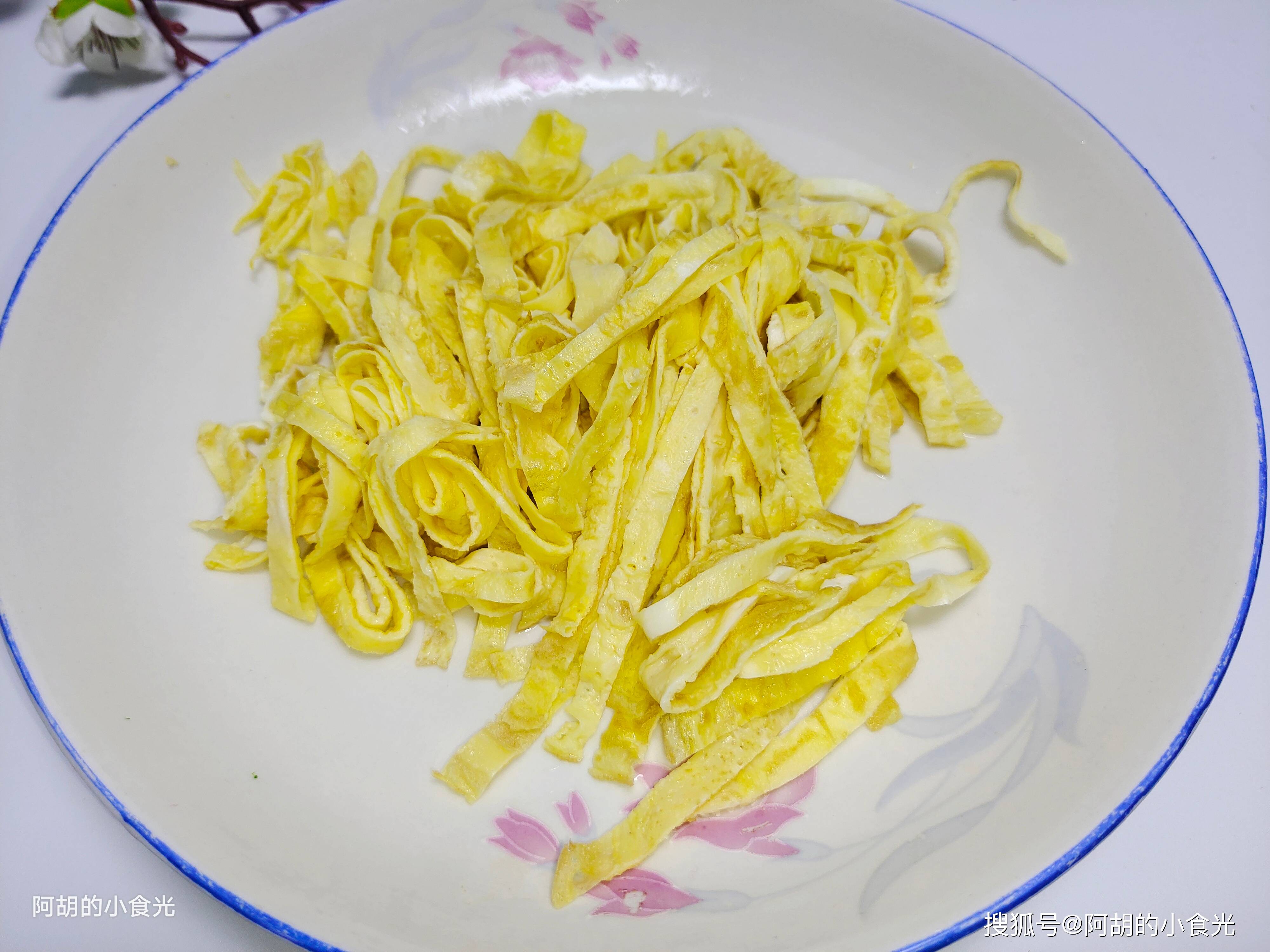 第二步:再来准备一些鸡蛋皮,将其切成丝后备用。制作鸡蛋皮的时候也有些小窍门,可以保证蛋皮久煮也不易碎。只要在鸡蛋液中淋入适量的生粉水搅拌均匀即可,这样摊出来的鸡蛋皮具有韧性,不容易不破碎,制作蛋饺、卷煎等一系列用到蛋皮时都可以用此窍门。