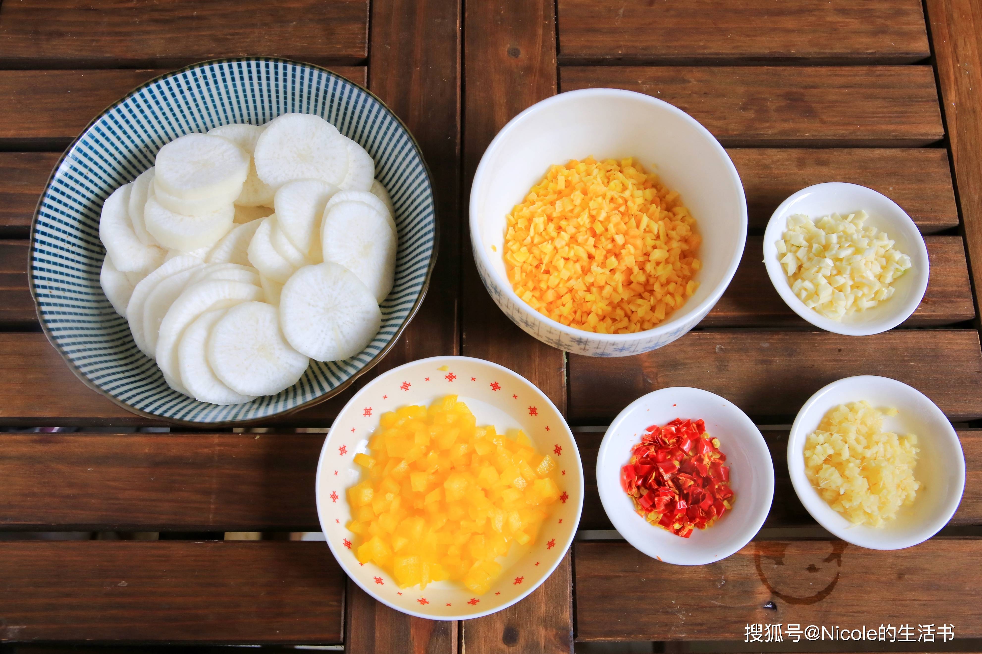 白萝卜去皮切片,小胡萝卜切碎,姜蒜切碎,红辣椒和彩椒切碎
