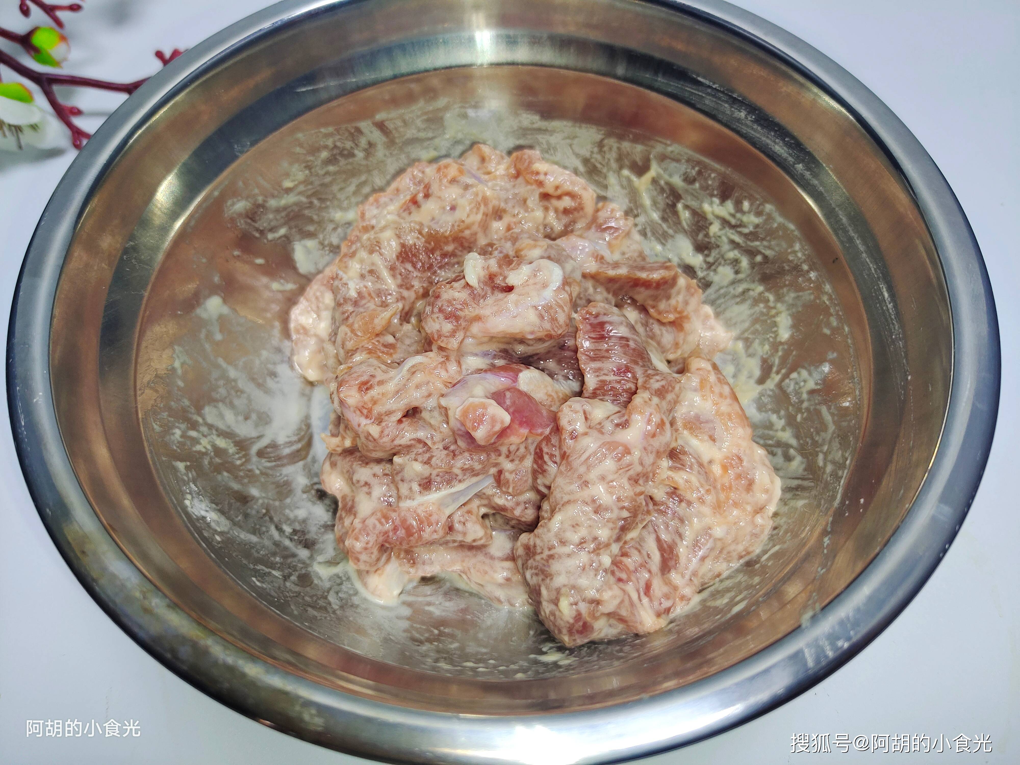 8、顺着一个方向搅拌上劲,腌制待用;