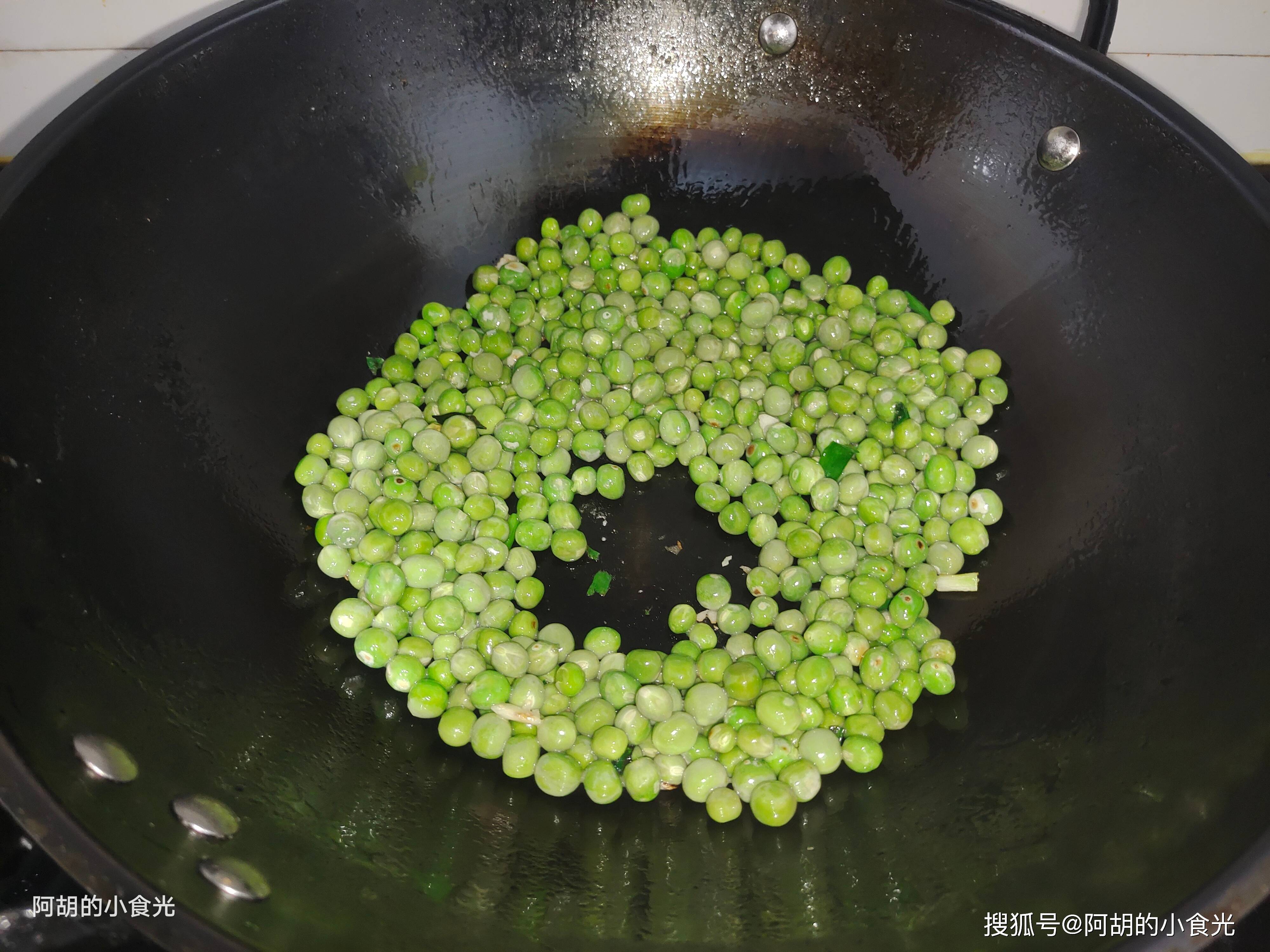 第五步:所有食材备好就可以开火烹饪。锅里来一些食用油烧热,加入一些小料葱蒜炒出香味,再把豌豆粒倒入锅中炒一炒,炒出食材的清香味。