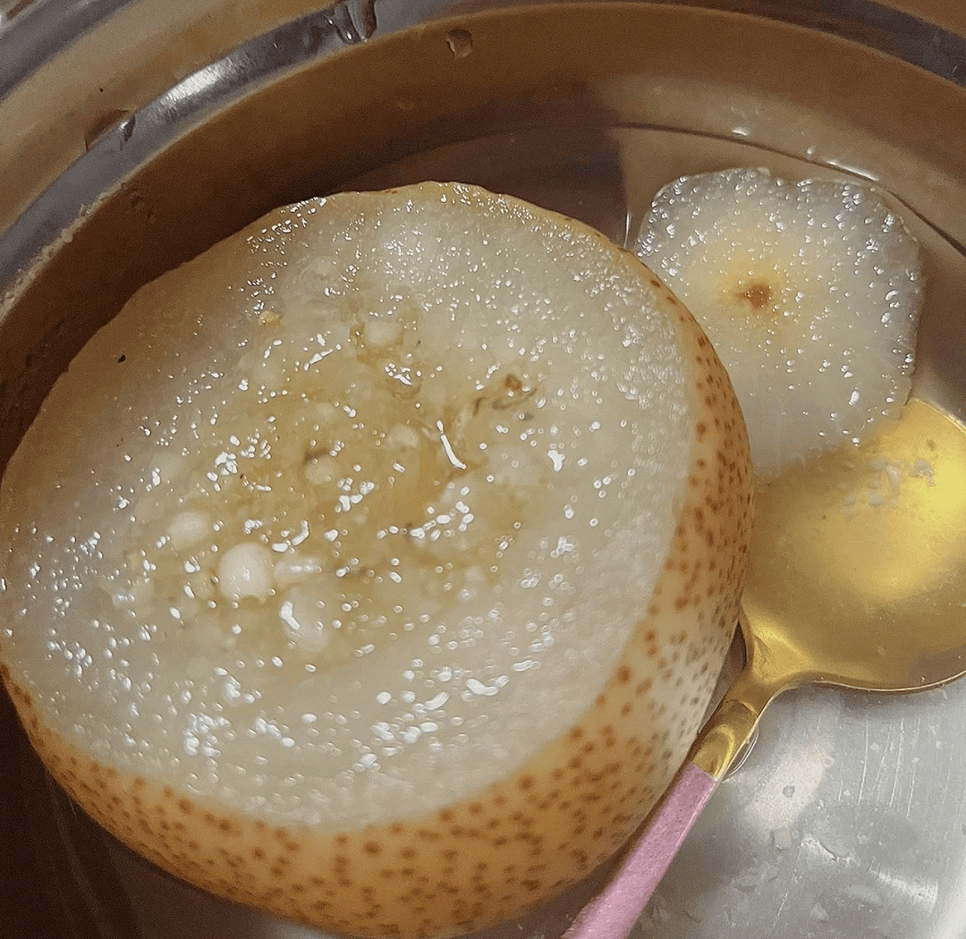 【做法】雪梨洗净,保留果皮(梨皮润肺效果优于梨肉),从顶部切下一小块,挖出梨核,放入川贝粉和冰糖,盖上切下的梨盖,放入碗中。蒸锅加水烧开,将雪梨放入,隔水蒸 15-20 分钟,直到梨肉软糯、川贝粉与冰糖完全融化即可。