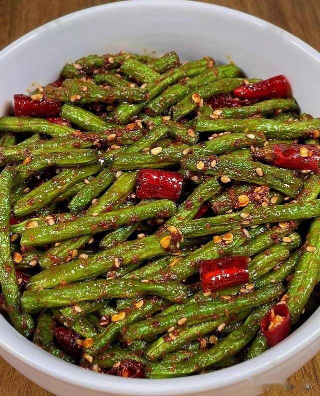 豆角、肉末、蒜末、干辣椒、花椒、生抽、蚝油、老抽、盐、鸡精、白芝麻