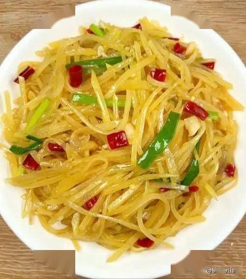 接着撒点盐、倒点生抽和白醋来提提味,再接着炒,直到土豆丝差不多熟了。