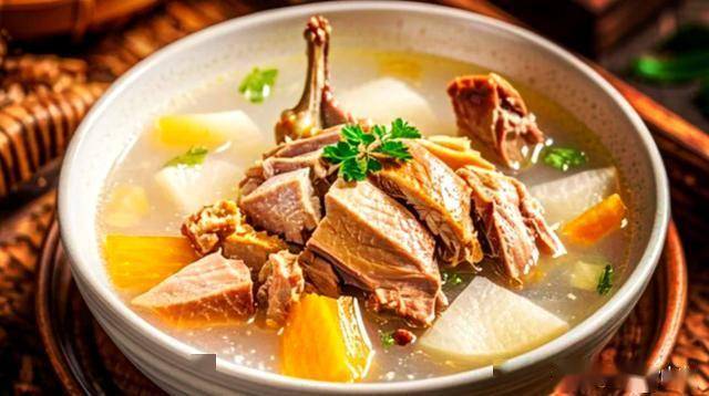 5. 1小时后,加入白萝卜块,继续小火炖煮30分钟,让白萝卜充分吸收鸭汤的鲜味。