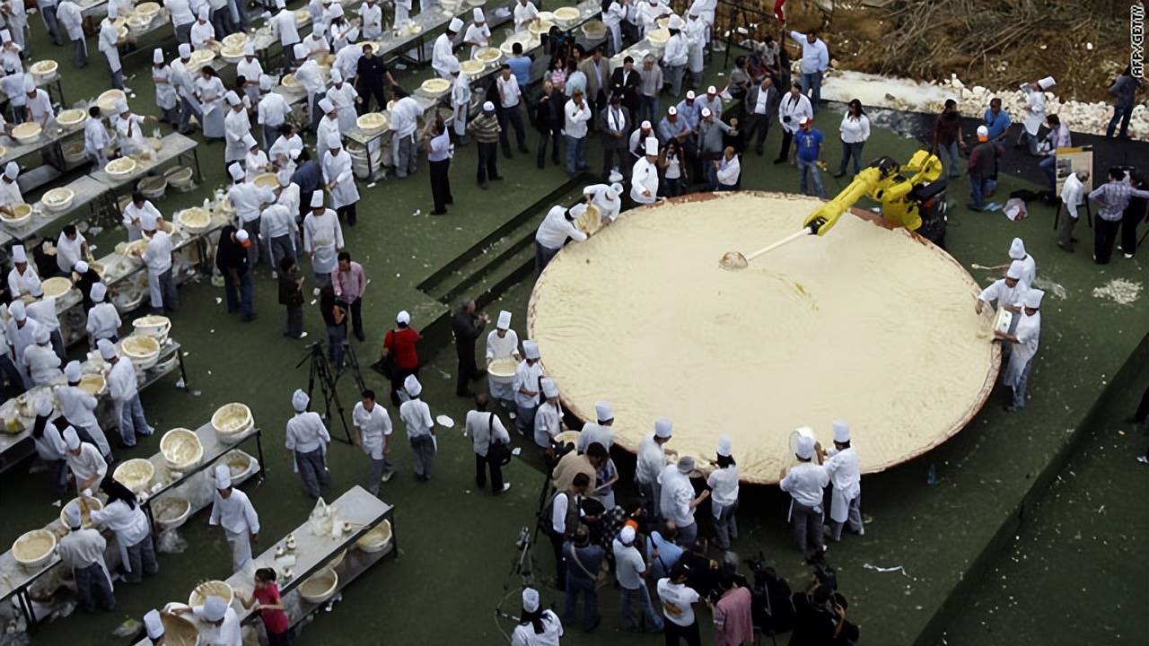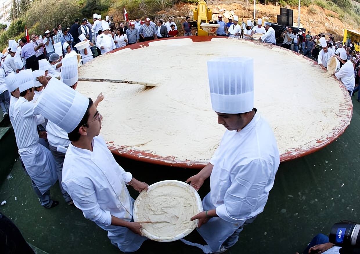 这种关于起源的“美食民族主义”,在2010年前后达到了高潮。黎巴嫩为了证明自己是鹰嘴豆泥的正宗故乡,制作了一盘重达10452公斤的超级鹰嘴豆泥,一举打破吉尼斯世界纪录(这个数字象征着黎巴嫩10452平方公里的国土面积)。