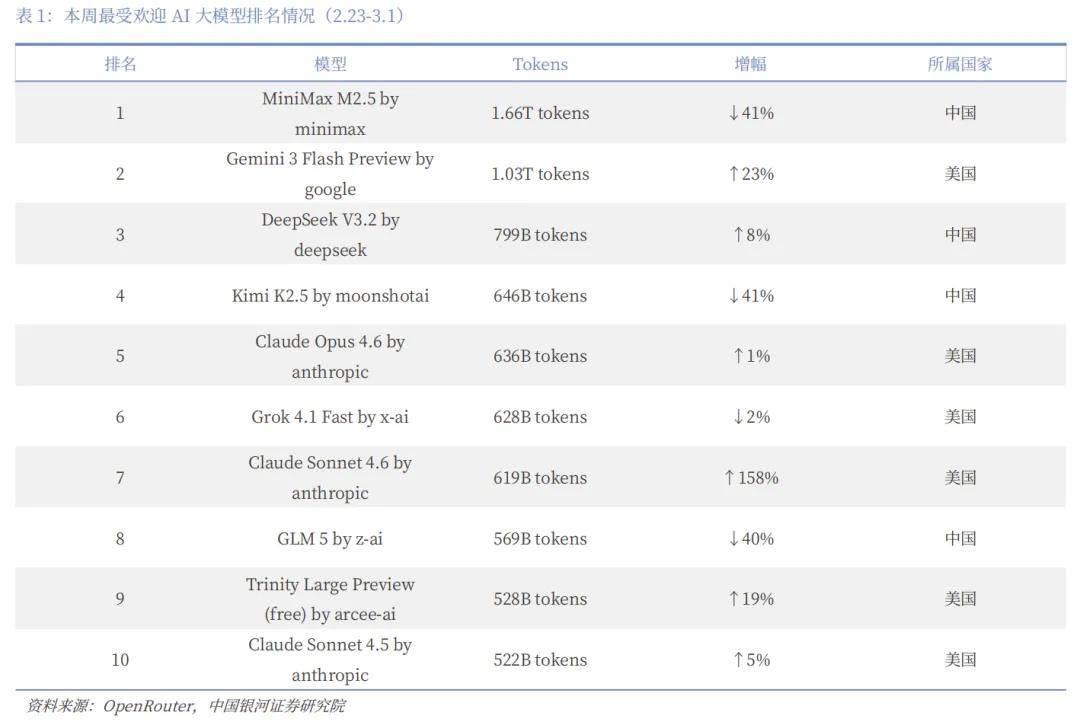 截至2026年2月28日,该平台内前十模型总Token消耗量已突破28.7万亿,其中,国产模型贡献超过14.69万亿,为历史上首次单月Token调用占比过半,且超越了美国模型。