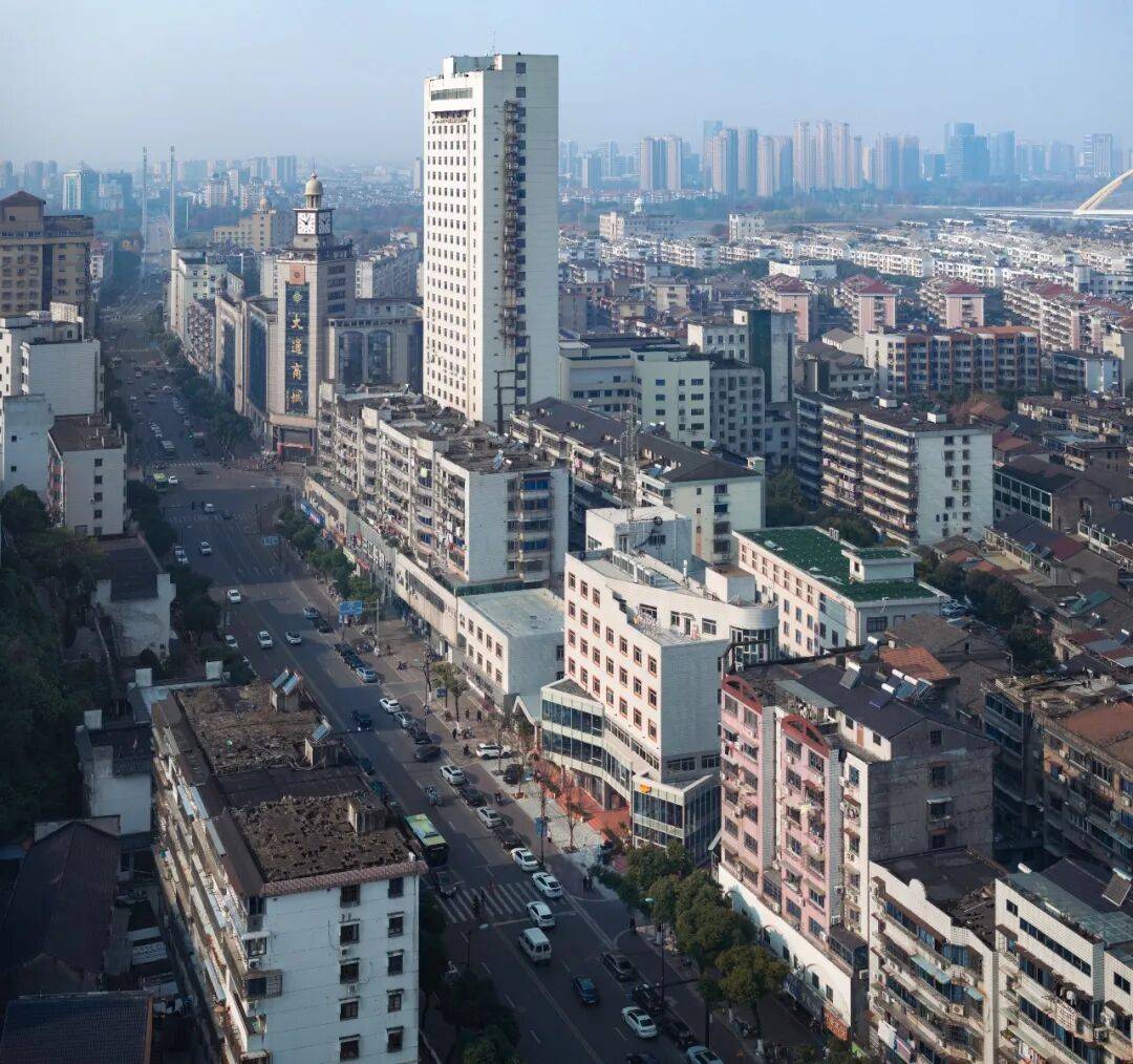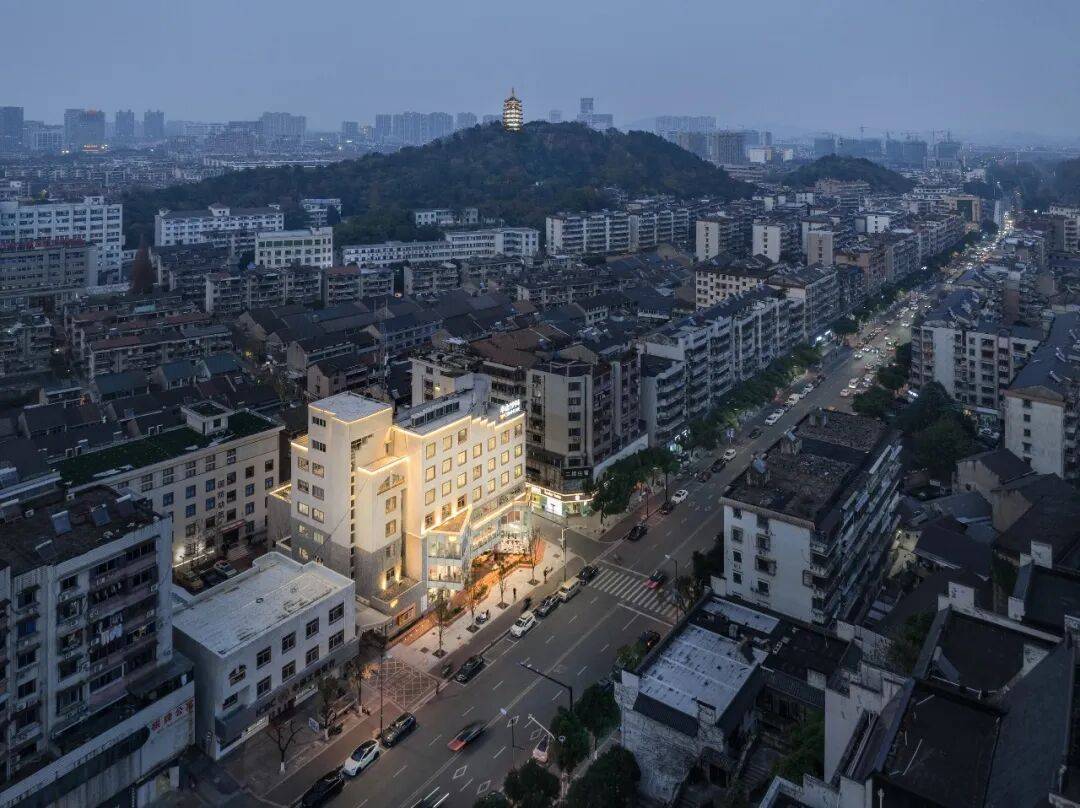 ▲鸟瞰上虞老百官全貌,除了城市主干道的照明,有两处灯火通明的建筑,一处是老百通商场的钟楼(左),另一处是此次被改造更新的半山1994项目(右),其身后是成片的老社区建筑。沿着人民大道向西可跨越上虞母亲河曹娥江(画面远处)。 ©赵赛