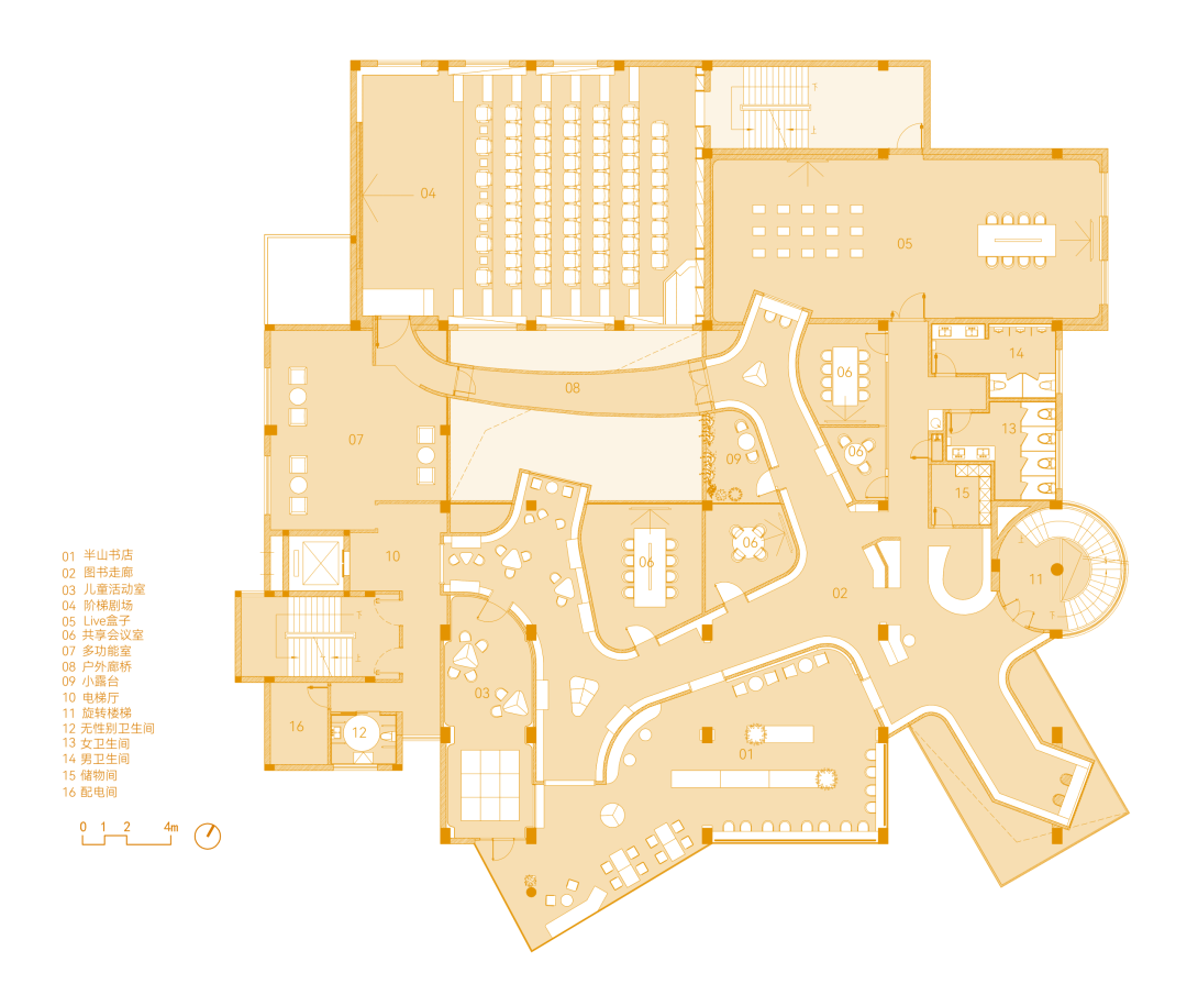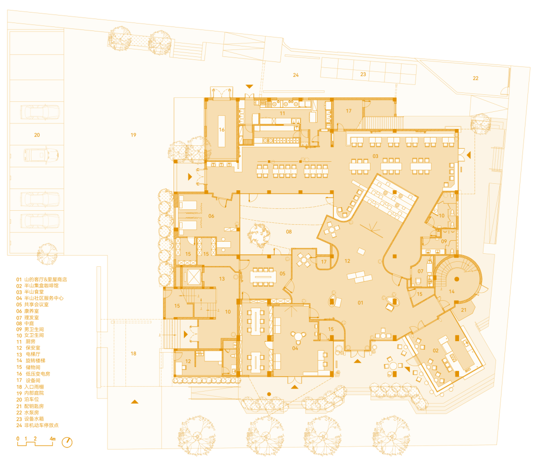1-2层:公共开放区,涵盖半山集盒咖啡馆、半山书店、社区食堂、文创商店及阶梯剧场,强化社交与休闲属性。
