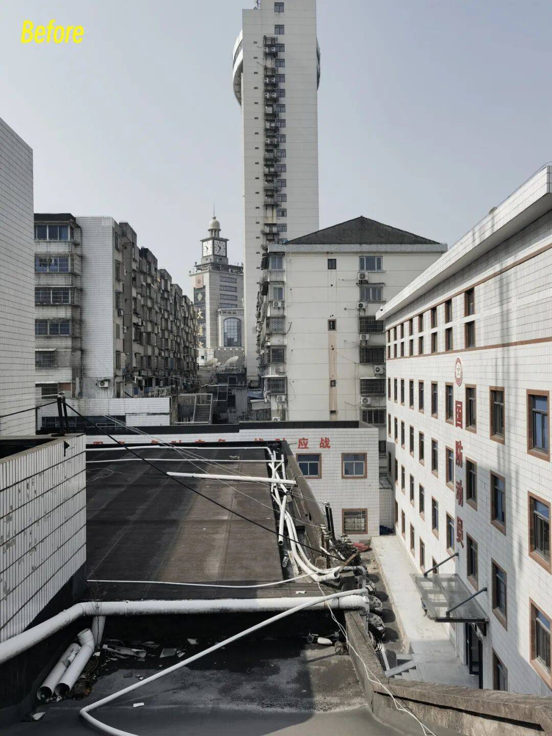 改造前,北侧裙楼是设备平台,管线凌乱。但我们发现,被年代感建筑环绕的感受令人印象深刻——向西可以看到老大通钟楼,向东北可以远眺半山上的重华塔。这些城市地标一直在那里,但这个视点从未被发现。
