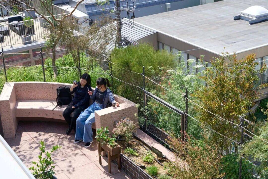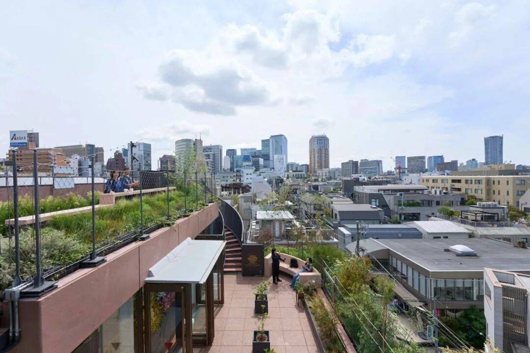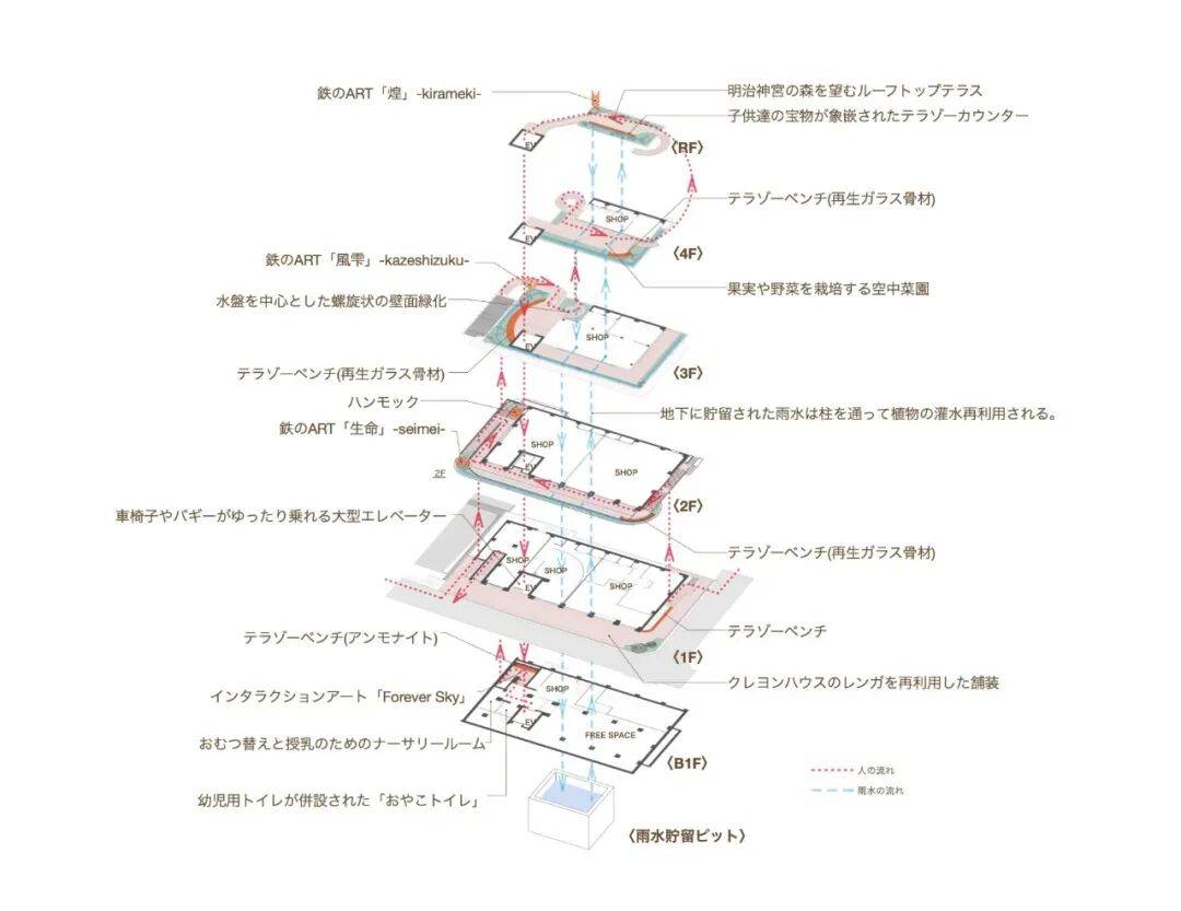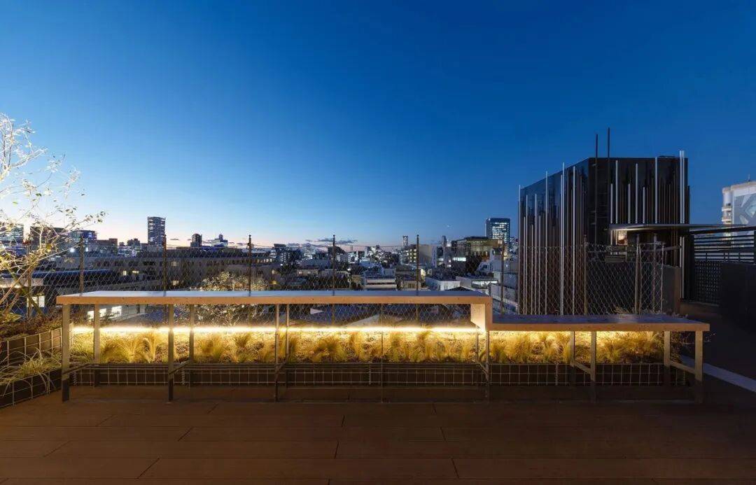 顶部露台提供眺望明治神宫森林的视野,强化建筑与周边绿地的联系。