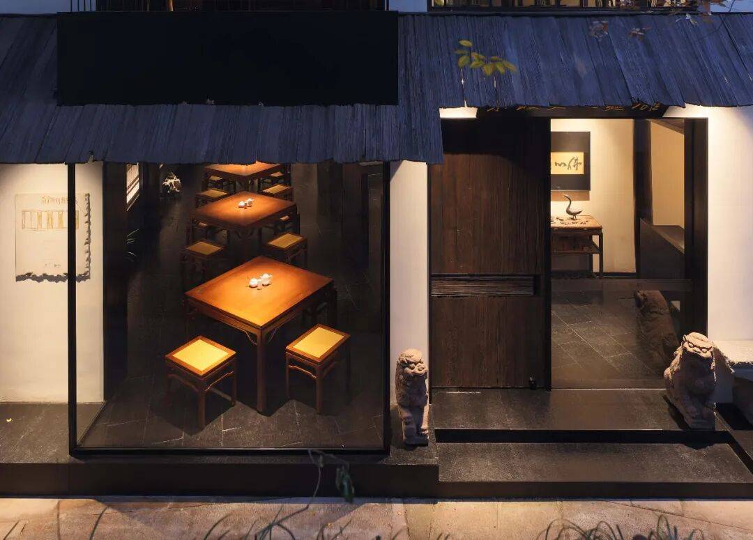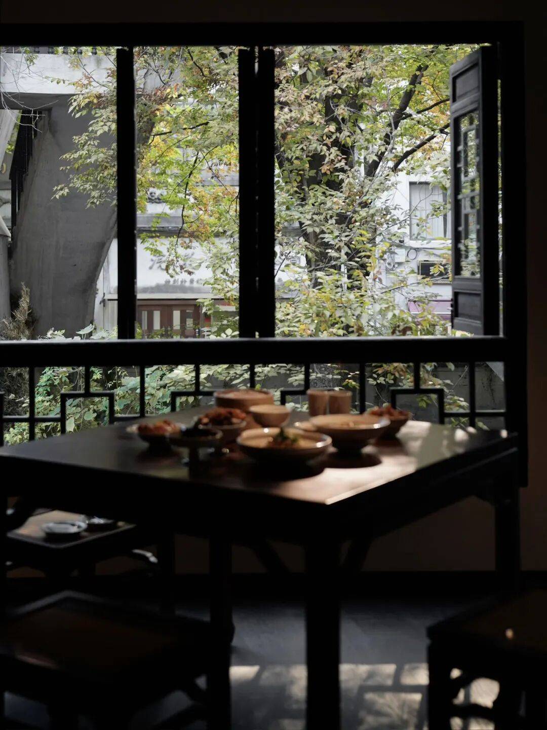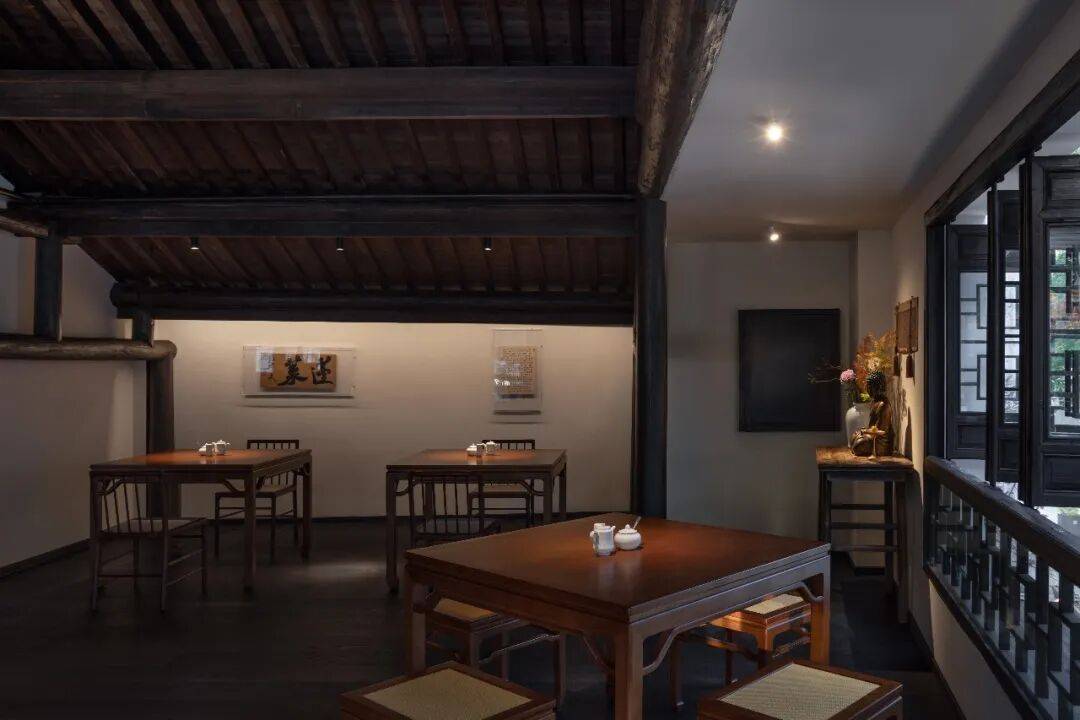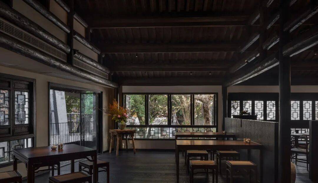 古朴建筑内,阳光照射,树影婆娑,客人们轻声细语,空间也随之生动有趣。
