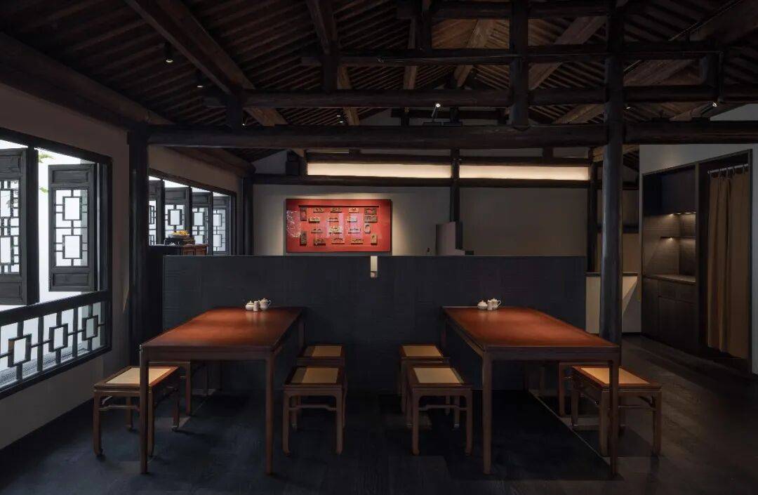 二楼:空间相对开阔,南面和西面采用中式风格的木雕花开窗,将窗外四季之景引入室内,一步一景,仿佛一幅徐徐展开的卷轴,诉说着吴越之国的历史与文化。