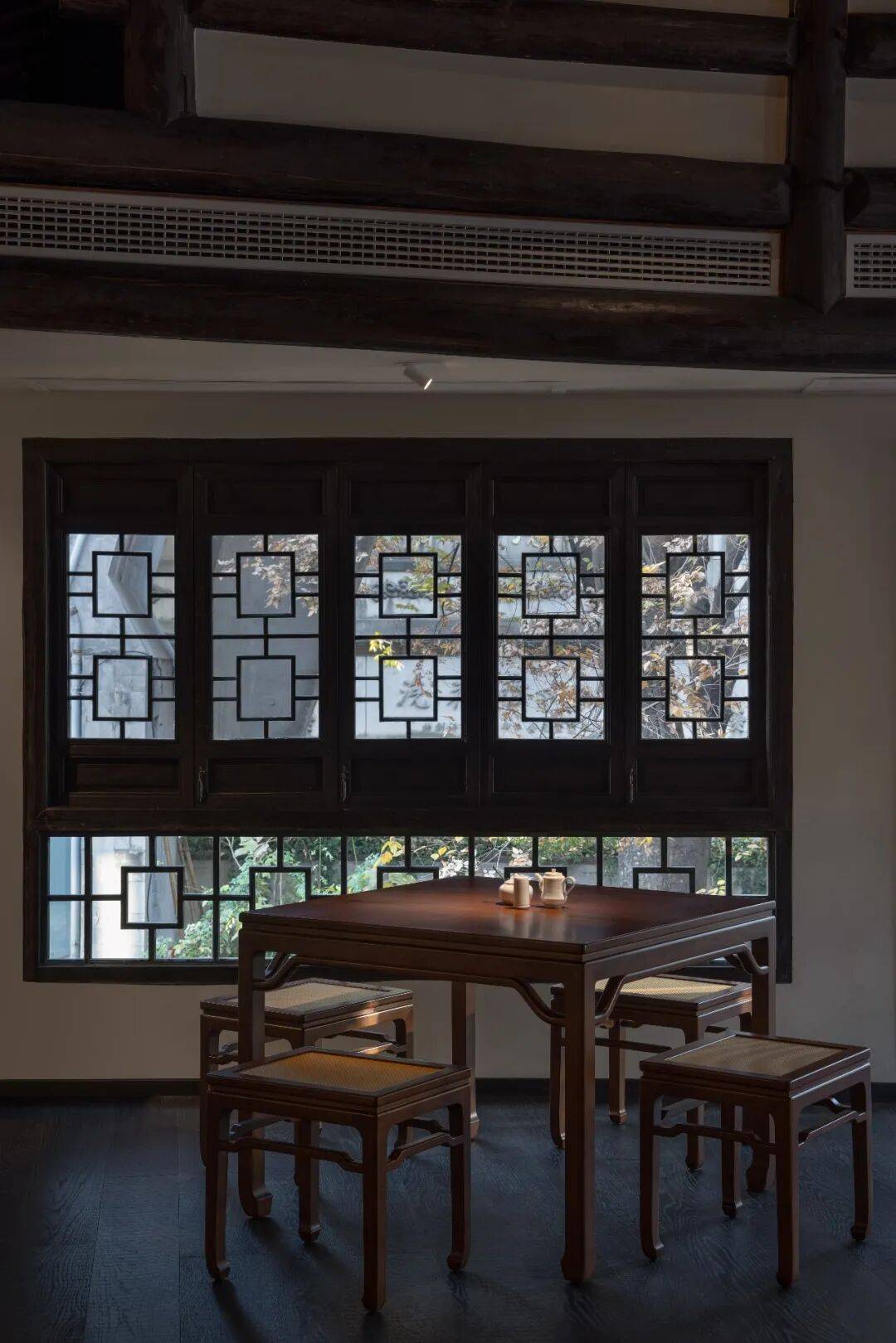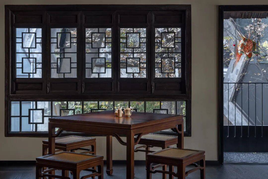 二楼的空间相对开阔,南面和西面皆为风景,因而采用中式风格的木雕花开窗,将窗外四季之景引入室内。随着脚步移动,景色随之变化,一步一境,处处皆画。