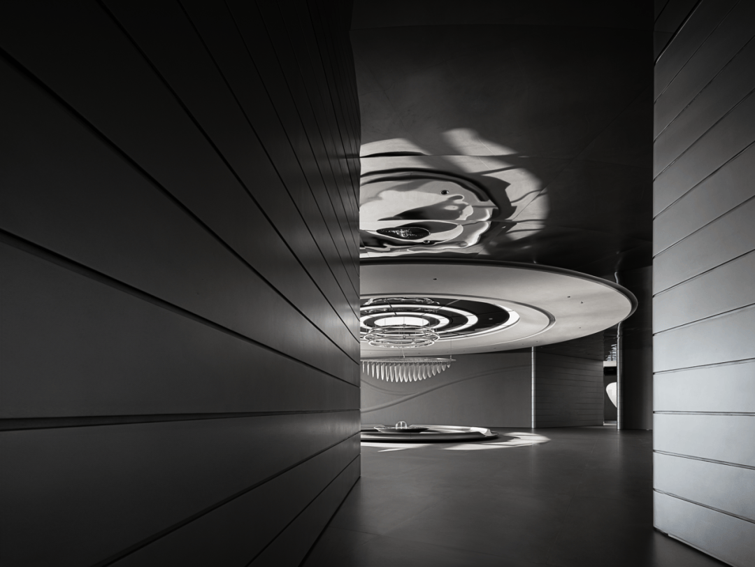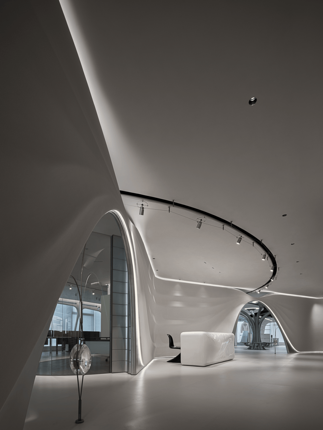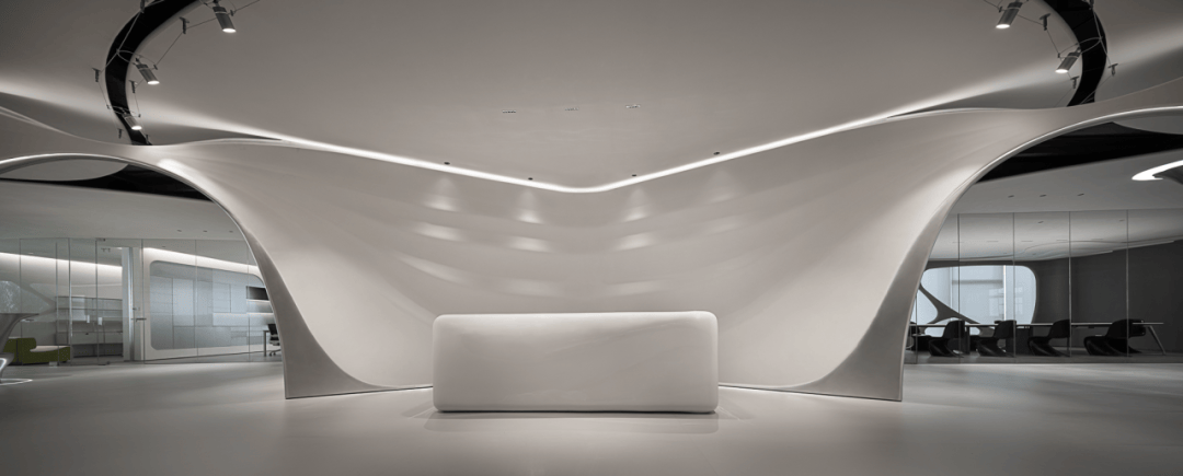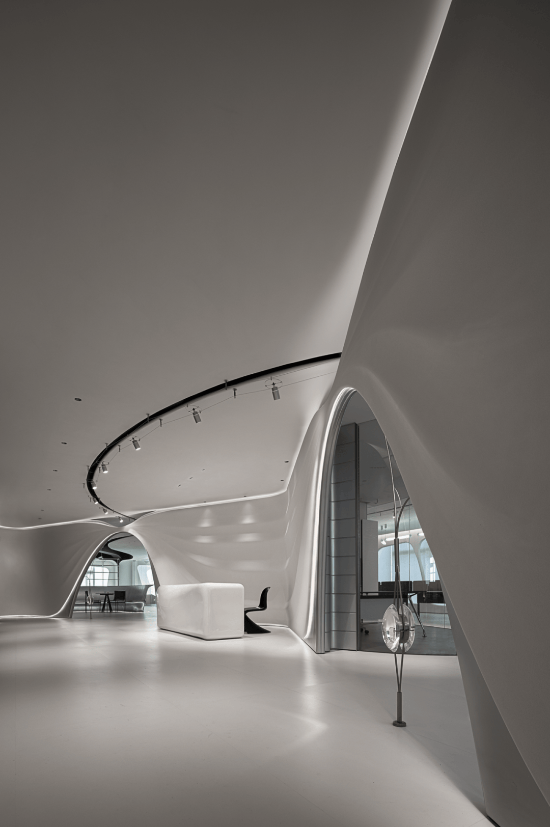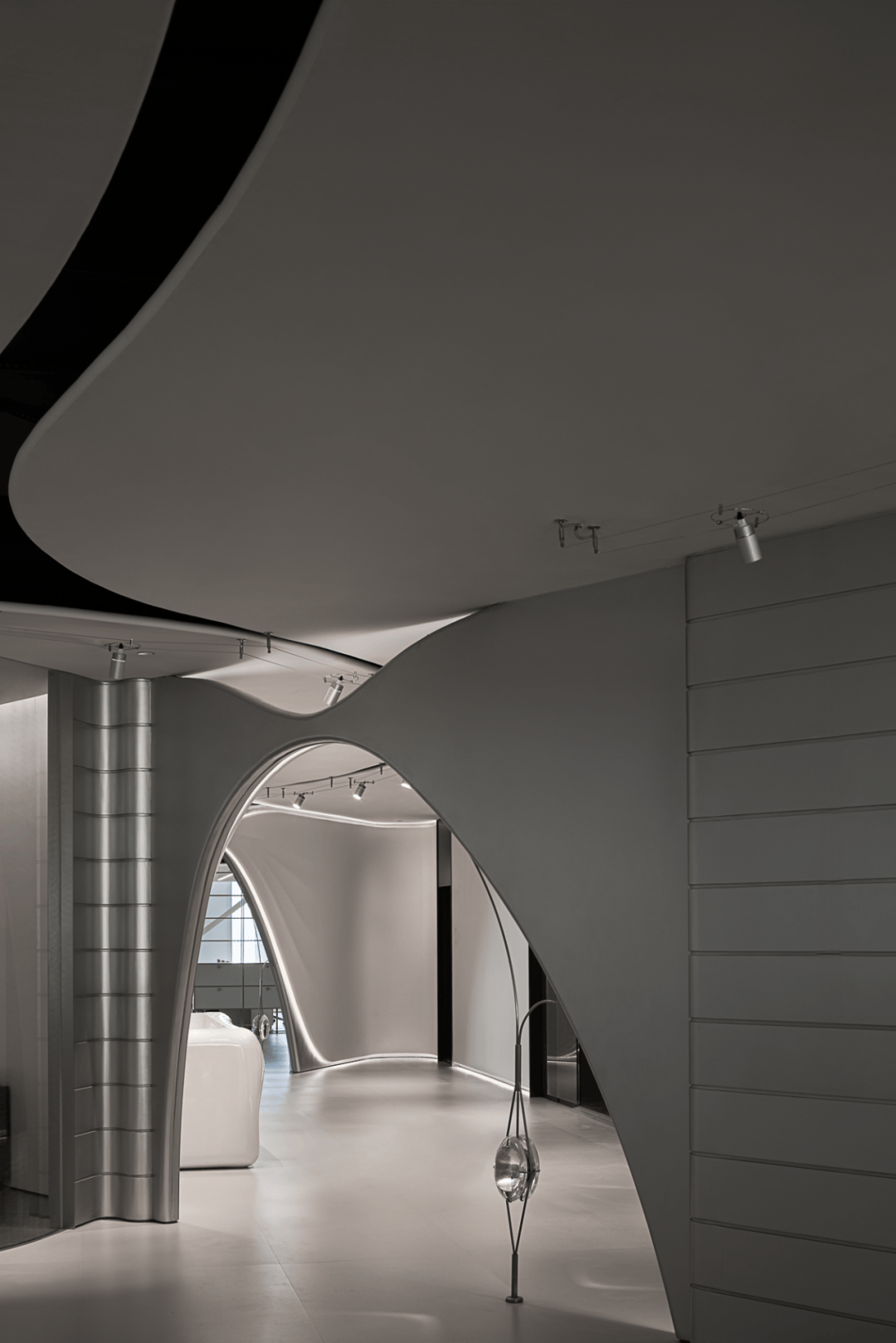 视觉:弧形墙面采用渐变喷涂,从白色过渡到浅灰,形成空间深度暗示