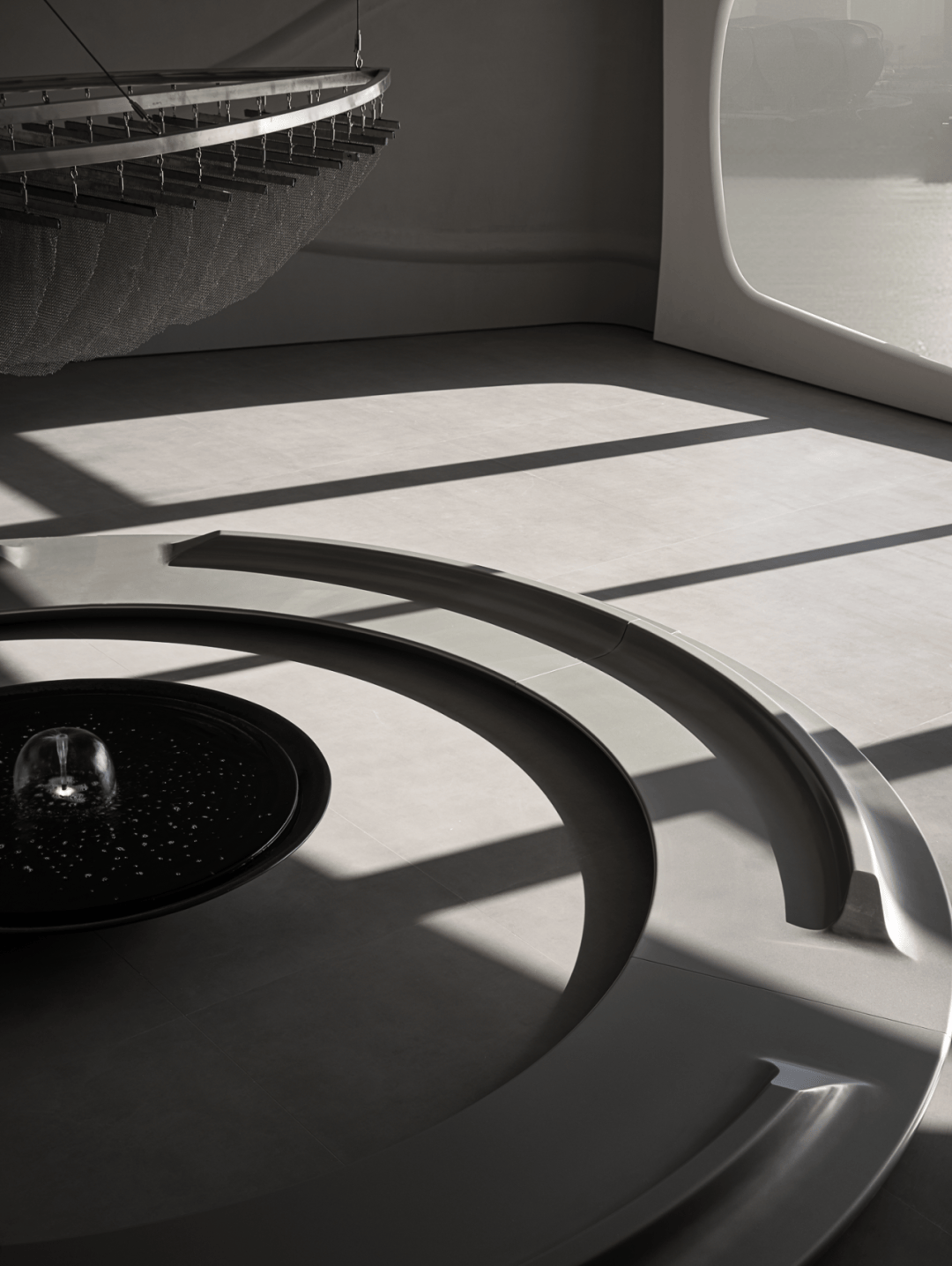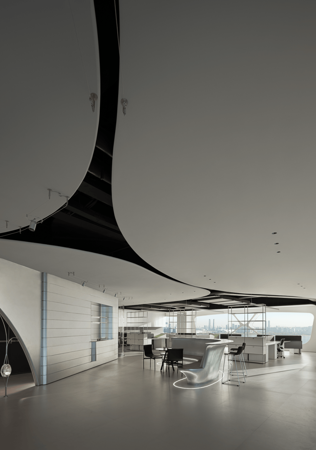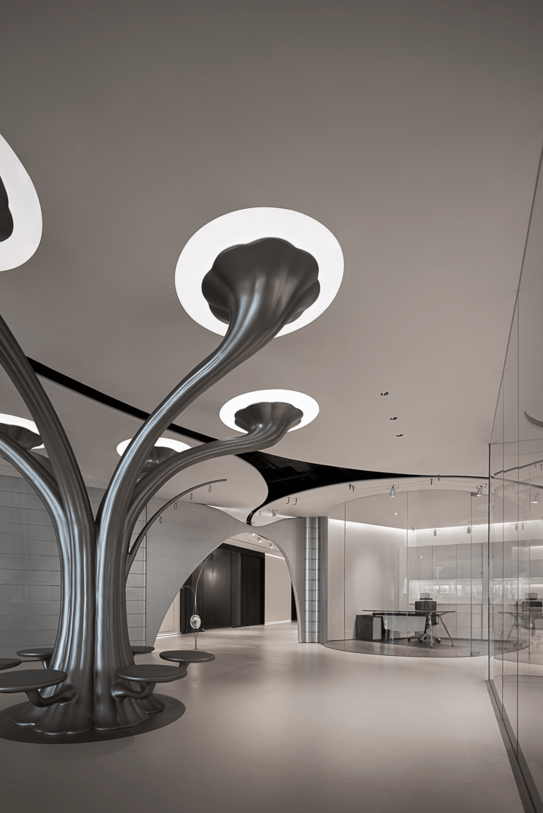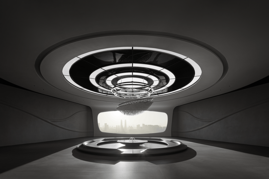 视觉:弧形墙面采用渐变喷涂,从白色过渡到浅灰,形成空间深度暗示
