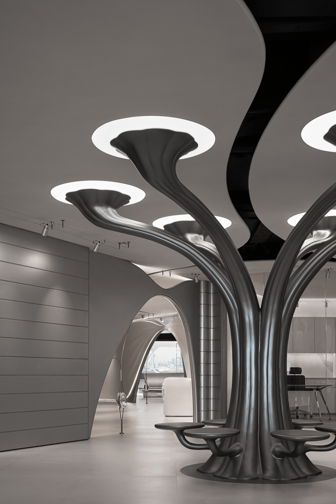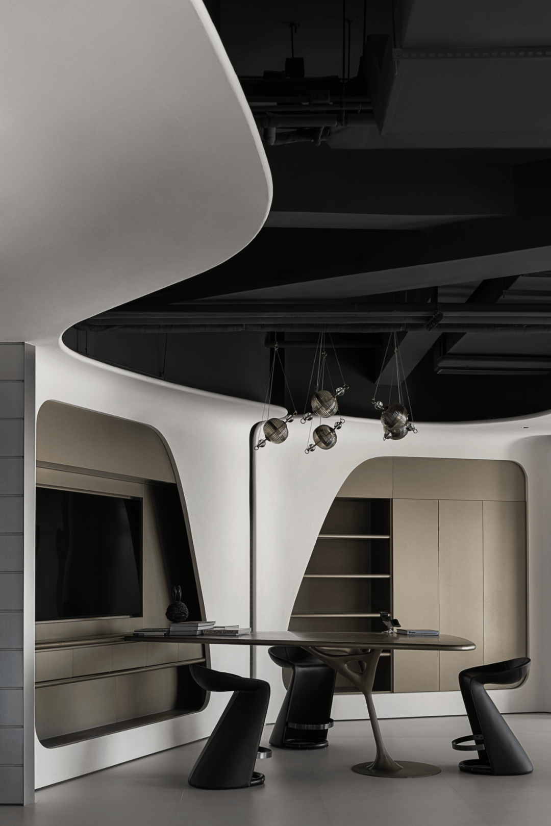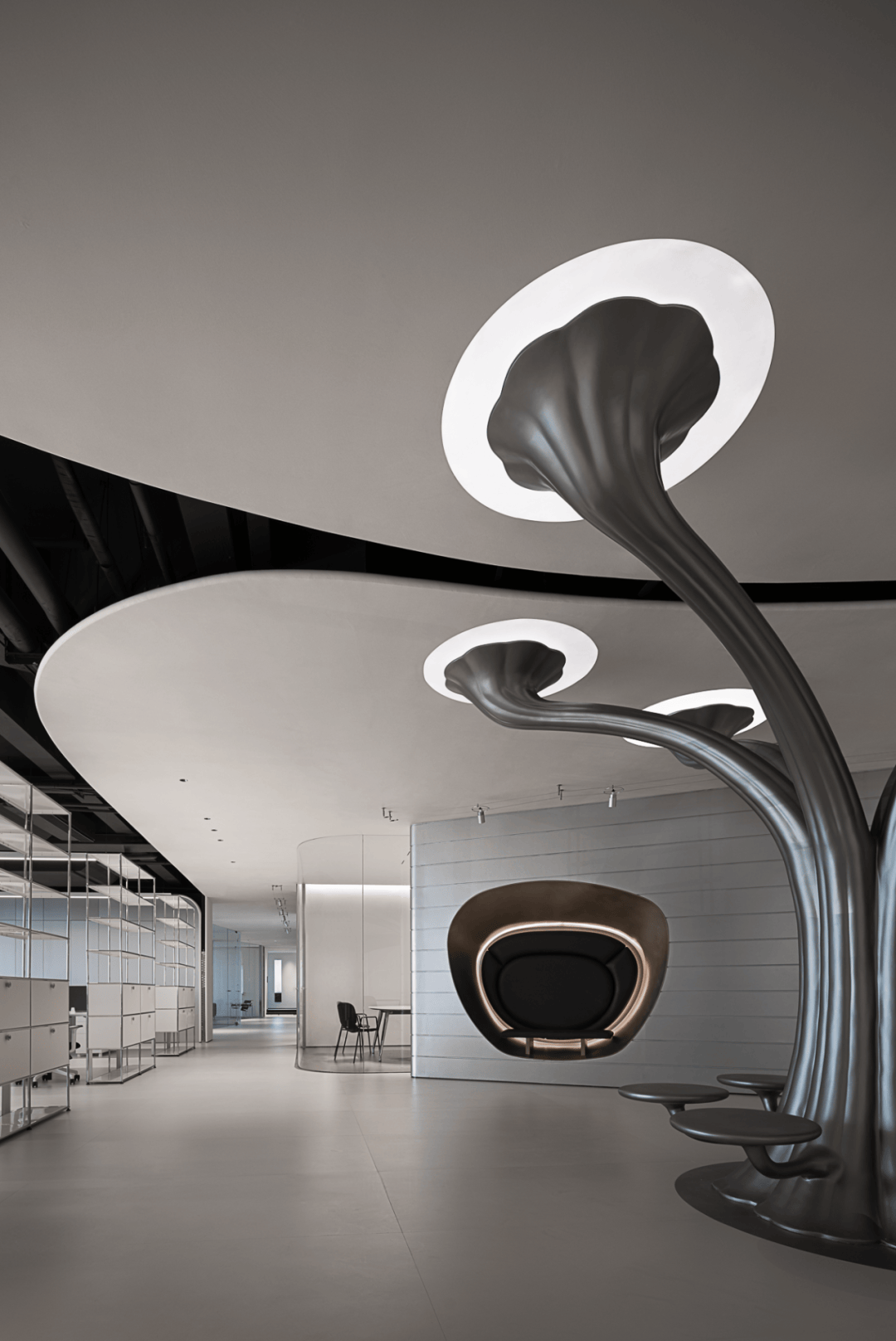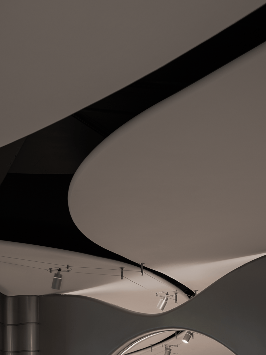 视觉:弧形墙面采用渐变喷涂,从白色过渡到浅灰,形成空间深度暗示